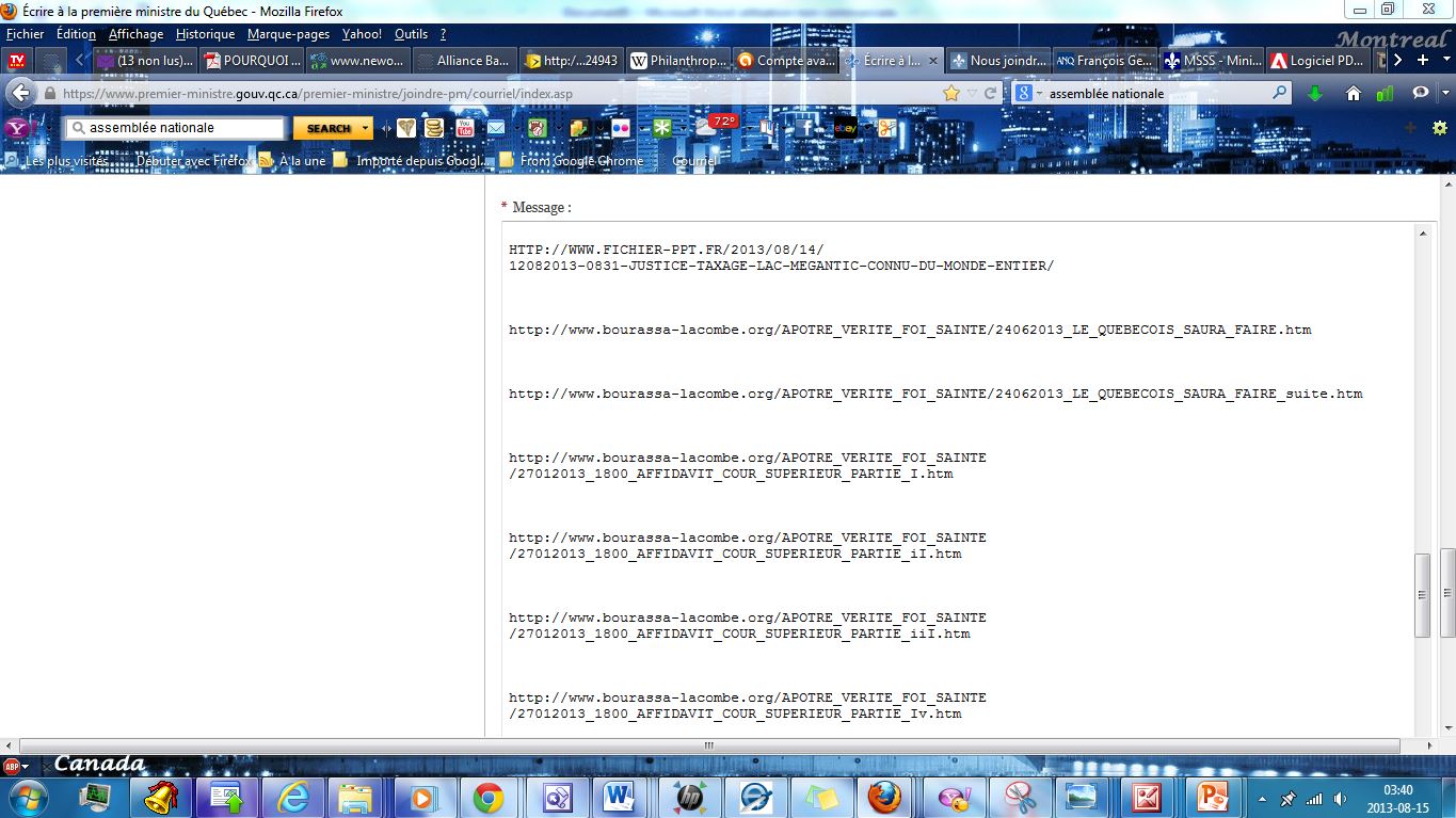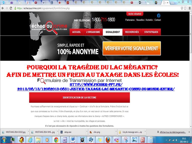 À : MADAME pAULINE MAROIS - LA PREMIÈRE, PREMIÈRE MINISTRE DE L’HISTOIRE DU QUÉBEC ; MONSIEUR FRANÇOIS GENDRON - VICE-PREMIER MINISTRE POUR MADAME PAULINE MAROIS PREMIÈRE MINISTRE DU QUÉBEC ; MONSIEUR STÉPHANE BERGERON - MINISTRE DE LA SÉCURITÉ PUBLIQUE ; DOCTEUR RÉJEAN HÉBERT - MINISTRE DE LA SANTÉ ET DES SERVICES SOCIAUX ; MONSIEUR BERTRAND ST-ARNAUD - MINISTRE JUSTICE Cc : AFANA-NANA (YOYO) BALBINE YOLANDE SURNOMMÉ PAR JÉSUS-CHRIST ESTHER II MERCREDI LE 7 DÉCEMBRE 2011 10:51:16 - VICE-PRÉSIDENTE DE SERGE BOURASSA-LACOMBE FONDATION ; ALIGUI ZE MARIE-LOUISE ; NATHALIE-SOLANGE ; PATIENTE PRÉFÉRANT DEMEURER DANS L'ANONYMAT - ASSISTANTE DU PRÉSIDENT ET CEO DES TRADUCTEURS DE SERGE BOURASSA-LACOMBE FONDATION ; JULES BRISSON - PRÉSIDENT - SELLERIE LEMAY INC ; APÔTRE & PASTEUR PAUL YANNICK AWOA ALLO ; STÉPHANE BRETON – LIEUTENANT DÉTECTIVE SÛRETÉ DU QUÉBEC – DIVISION PROTECTION DES PARLEMENTAIRES ; SERGE GONTHIER - GÉRANT RÉGIONAL DES VENTES - QUÉBEC & MARITIMES CANADA – PRÉVOST CAR ; SERGE PRÉVOST ; COMRADE & PASTOR DONALD G DEWRELL Envoyé le : jeudi 15 août 2013 14:52 Objet : POURQUOI LA TRAGÉDIE DU LAC MÉGANTIC? AFIN DE METTRE UN FREIN AU TAXAGE DANS LES ÉCOLES!