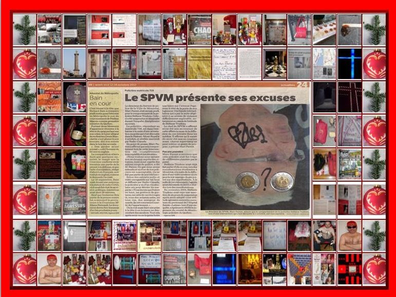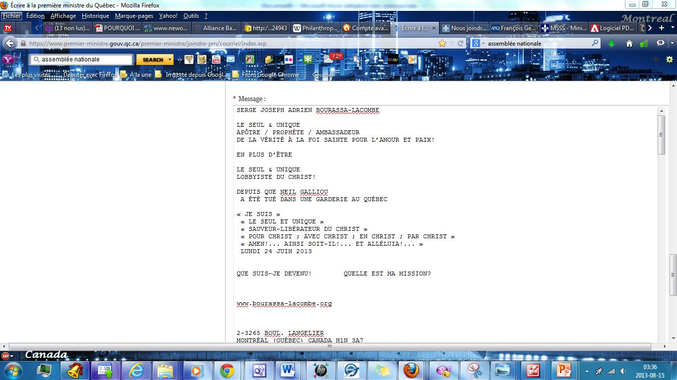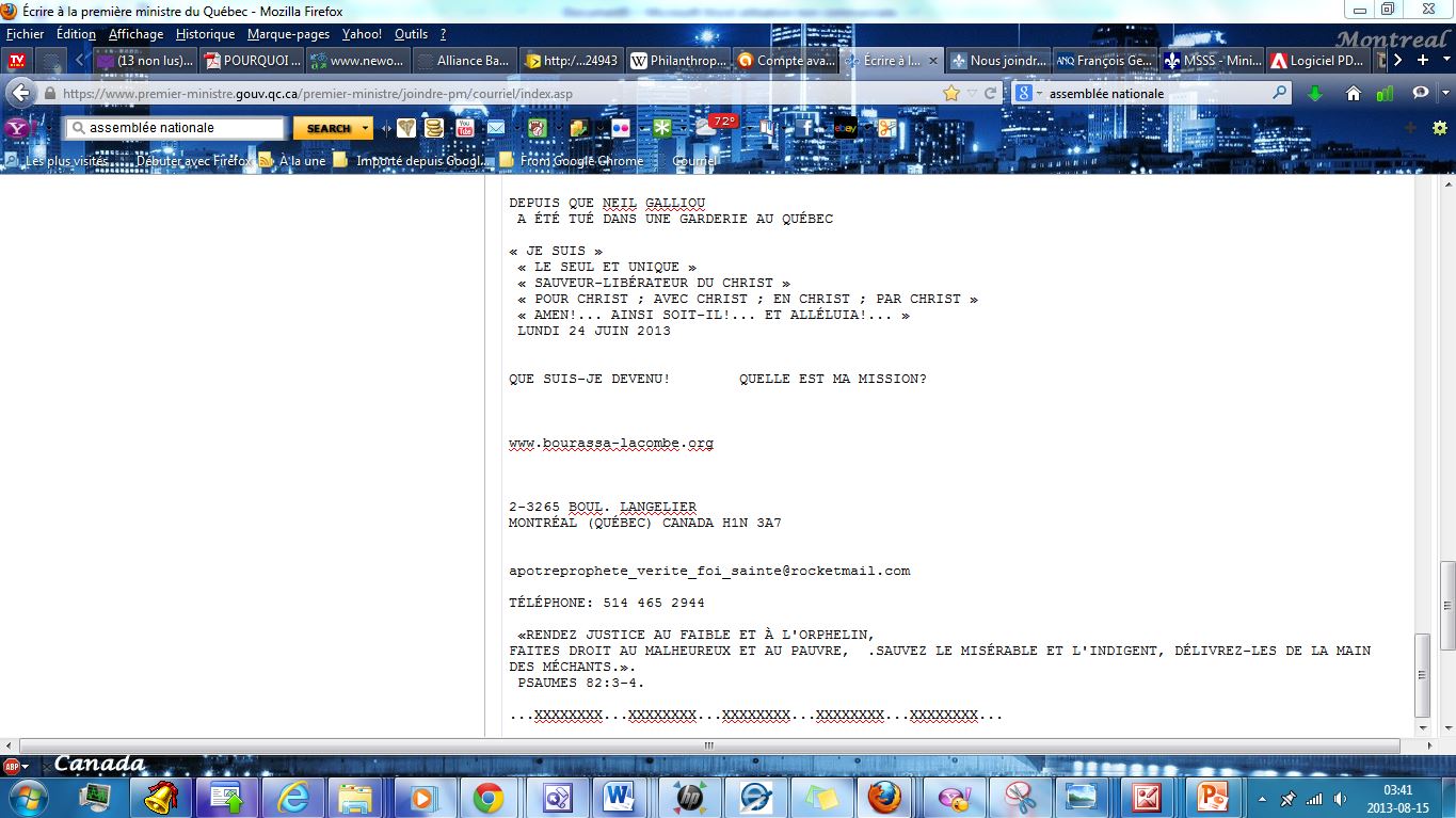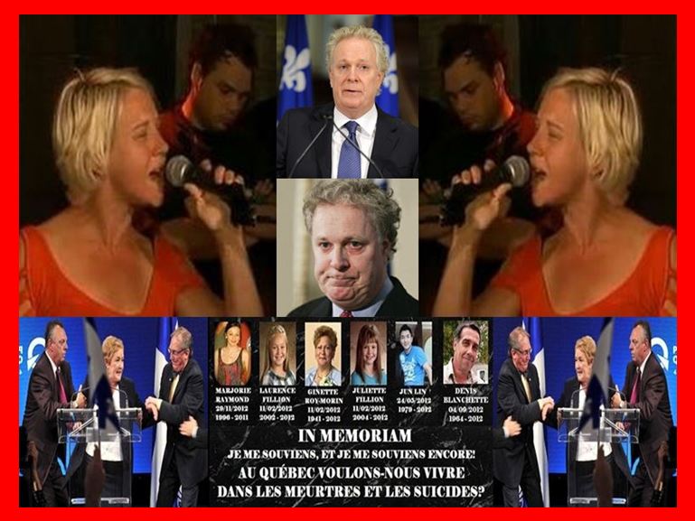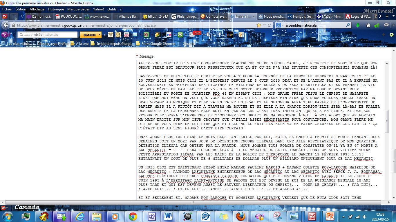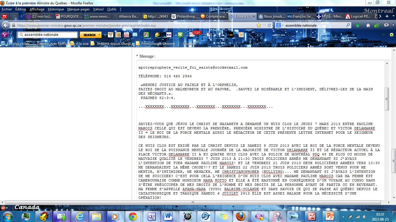 POURQUOI LA TRAGÉDIE DU LAC MÉGANTIC? IN MEMORIAm de LA POLICE DU POSTE DE MON QUARTIER LE PDQ 48 LORS du vendredi 7 juin 2013 21:30 ; TROIS POLICIERS ARMÉS ME DEMANDENT as-TU L'INTENTION D'ASSASSINER NOTRE PREMIÈRE MINISTRE PAULINE MAROIS? ; du vendredi matin 21 juin 2013 ; DEUX POLICIÈRES ME DEMANDENT : as-TU L'INTENTION D'ASSASSINER NOTRE PREMIÈRE MINISTRE PAULINE MAROIS? ; du SAMedi matin 22 juin 2013 ; UN POLICIER ME DEMANDE AU TRAVERS DU MOUSTIQUAIRE DE MA CUISINE SI ILS PEUVENT ENTRER PAR LA PORTE D'ENTRÉE POUR ME PARLER JE LUI RÉPONDS QUE OUI! ILS RÉUSSISSENT TOUT DE MÊME À SE RENDENT JUSQU'À LA PORTE DE MON APPARTEMENT SANS S'ANNONCER À L'ENTRÉE ET PRESSE LA SONNETTE RENDUS À MA PORTE JUSQU'À CE QUE J'AIE RÉPONDU À DEMI-VÊTU. CE MATIN LÀ... ILS M'ONT MENTI, ILS ONT TENTÉ DE M'INTIMIDER, ILS M'ONT MENACÉ ET CHRISTIANOPHOBÉ (bullying) [...] AVANT DE PARTIR EN ME DEMANDANT : as-TU L'INTENTION DE TE SUICIDER? du mardi matin 25 juin 2013 DEUX POLICIÈRES SONT VENUS POUR ME DEMANDER [...] JE ME SUIS ADRESSÉ À CELLE QUI ÉTAIT VENUE LE 21 JUIN 2013 ET JE LUI AI DIS QUE : [...] VEUILLEZ RASSURER MADAME PAULINE MAROIS NOTRE PREMIÈRE MINISTRE SOIT SANS INQUIÉTUDE CAR MON GRAND FRÈRE JÉSUS LE CHRIST DE NAZARETH ET MOI ONT VEUX QU'ELLE FASSE UN BEAU VOYAGE AU MEXIQUE ET ELLE VA EN FAIRE UN [...] EN REVENANT ELLE DEVRA S'OCCUPER DE MES DROITS DE MA PERSONNE À MOI, À MOI! CAR SI ELLE NE LE FAIT PAS MON GRAND FRÈRE ME DIT DE VOUS DIRE DE LUI DIRE QU'ELLE VA SE FAIRE CHAUFFER LE CUL PAR LUI. C'EST AU SENS FIGURÉ ÇA C'EST CERTAIN!