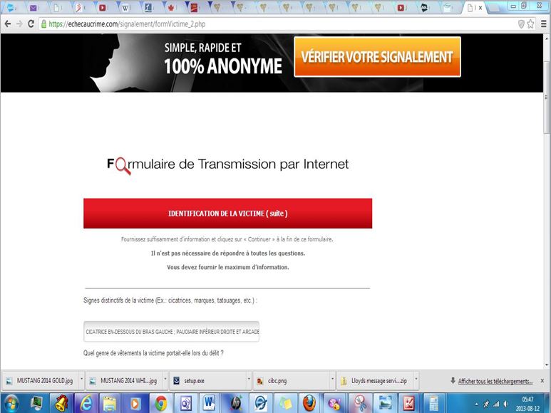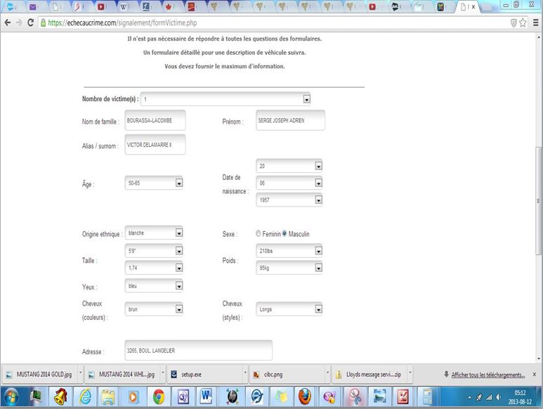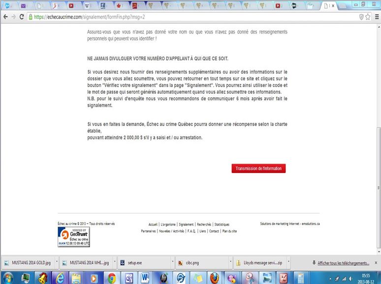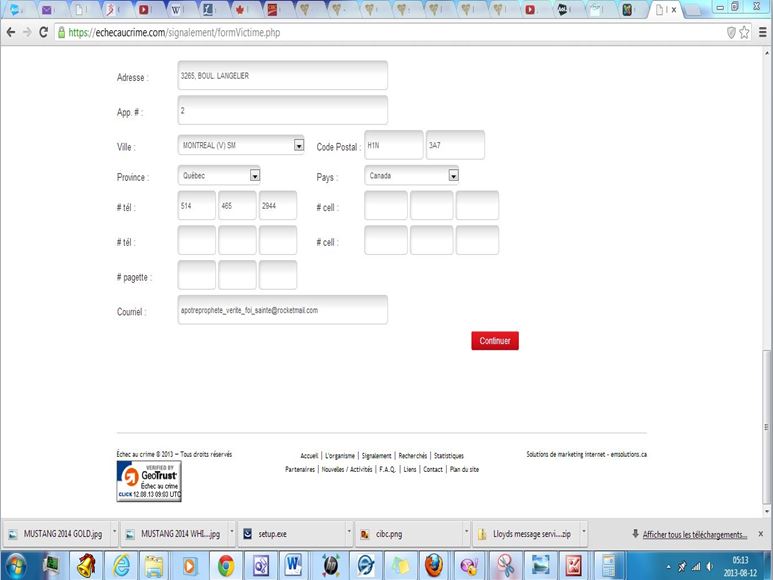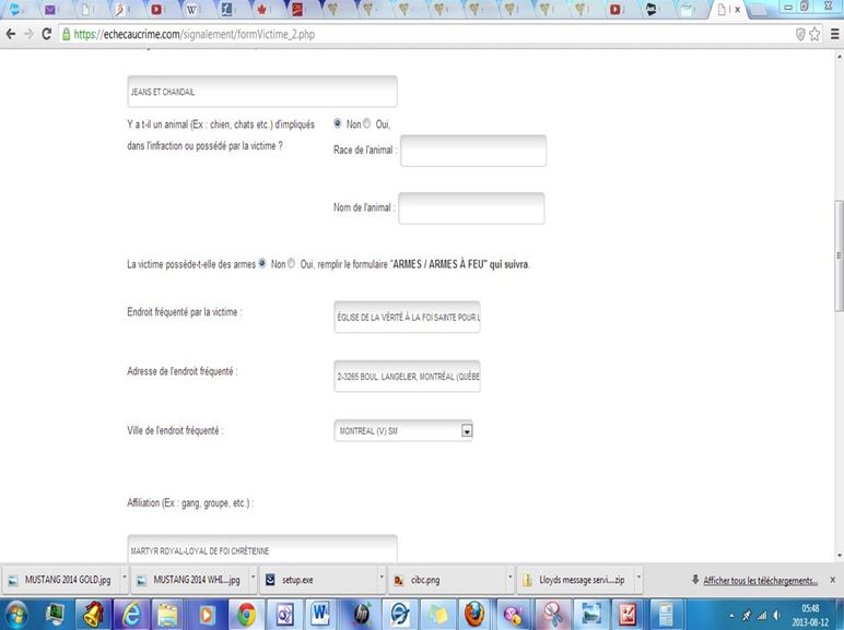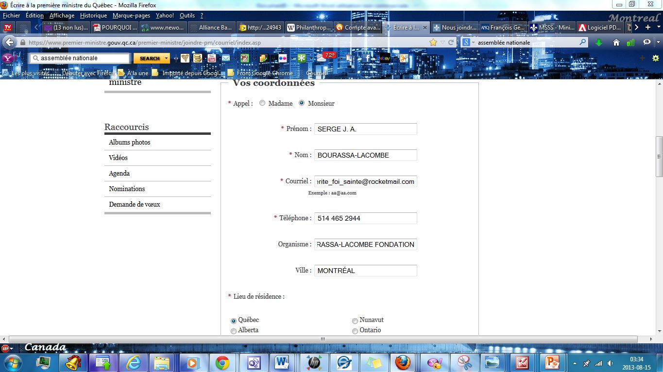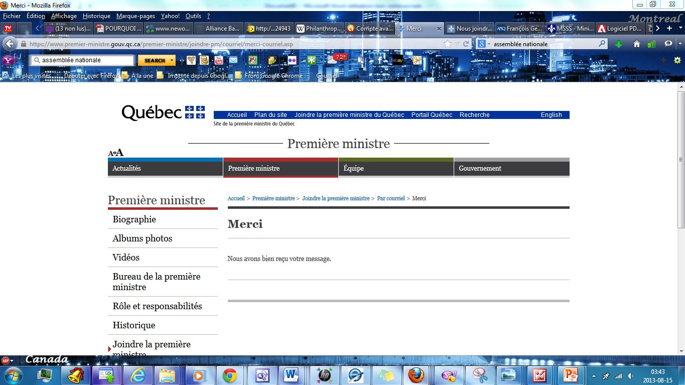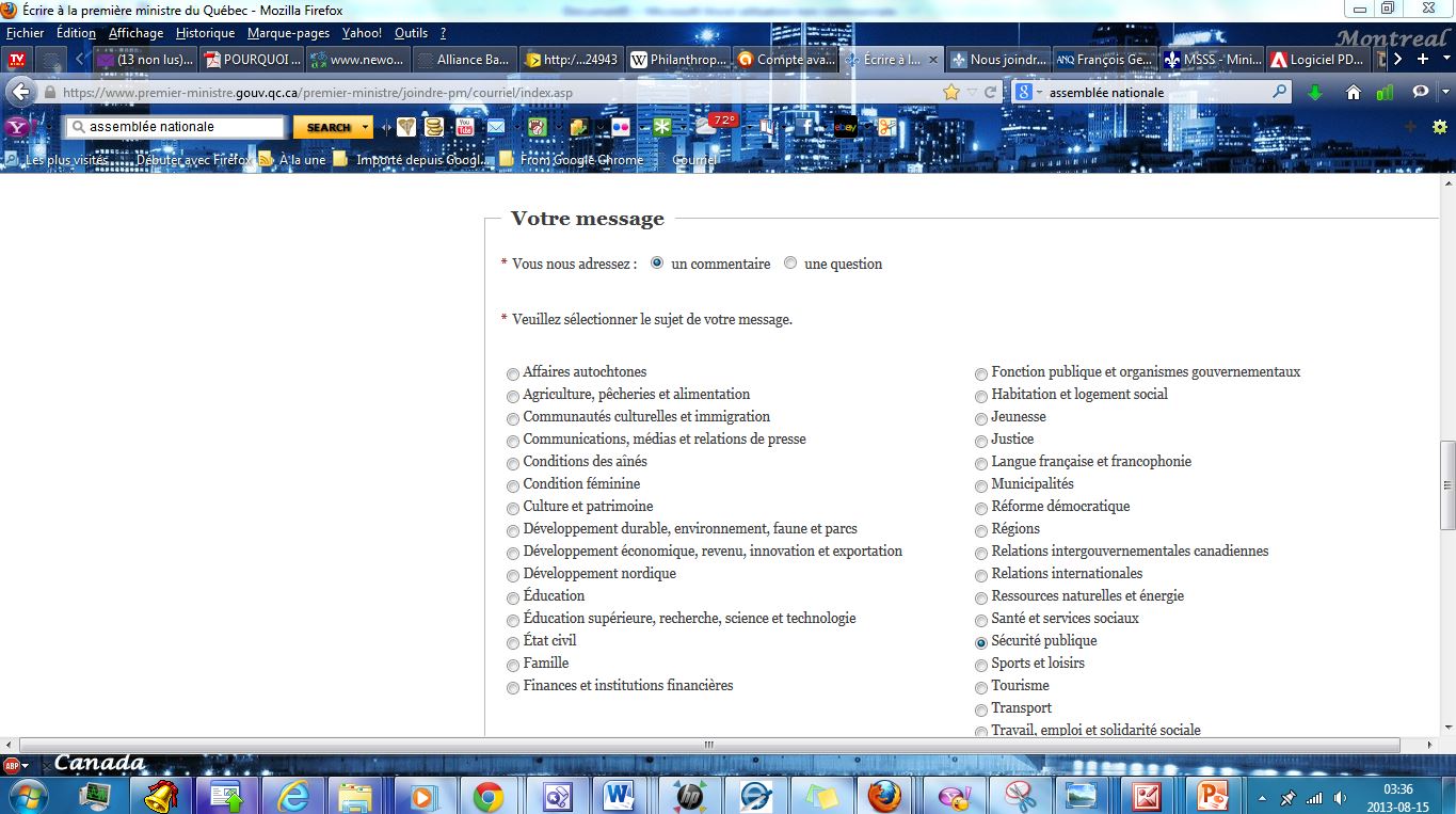 POURQUOI LA TRAGÉDIE DU LAC MÉGANTIC? IN MEMORIAm de LA POLICE DU POSTE DE MON QUARTIER LE PDQ 48 LORS du vendredi 7 juin 2013 21:30 ; TROIS POLICIERS ARMÉS ME DEMANDENT as-TU L'INTENTION D'ASSASSINER NOTRE PREMIÈRE MINISTRE PAULINE MAROIS? ; du vendredi matin 21 juin 2013 ; DEUX POLICIÈRES ME DEMANDENT : as-TU L'INTENTION D'ASSASSINER NOTRE PREMIÈRE MINISTRE PAULINE MAROIS? ; du SAMedi matin 22 juin 2013 ; UN POLICIER ME DEMANDE AU TRAVERS DU MOUSTIQUAIRE DE MA CUISINE SI ILS PEUVENT ENTRER PAR LA PORTE D'ENTRÉE POUR ME PARLER JE LUI RÉPONDS QUE OUI! ILS RÉUSSISSENT TOUT DE MÊME À SE RENDENT JUSQU'À LA PORTE DE MON APPARTEMENT SANS S'ANNONCER À L'ENTRÉE ET PRESSE LA SONNETTE RENDUS À MA PORTE JUSQU'À CE QUE J'AIE RÉPONDU À DEMI-VÊTU. CE MATIN LÀ... ILS M'ONT MENTI, ILS ONT TENTÉ DE M'INTIMIDER, ILS M'ONT MENACÉ ET CHRISTIANOPHOBÉ (bullying) [...] AVANT DE PARTIR EN ME DEMANDANT : as-TU L'INTENTION DE TE SUICIDER? du mardi matin 25 juin 2013 DEUX POLICIÈRES SONT VENUS POUR ME DEMANDER [...] JE ME SUIS ADRESSÉ À CELLE QUI ÉTAIT VENUE LE 21 JUIN 2013 ET JE LUI AI DIS QUE : [...] VEUILLEZ RASSURER MADAME PAULINE MAROIS NOTRE PREMIÈRE MINISTRE SOIT SANS INQUIÉTUDE CAR MON GRAND FRÈRE JÉSUS LE CHRIST DE NAZARETH ET MOI ONT VEUX QU'ELLE FASSE UN BEAU VOYAGE AU MEXIQUE ET ELLE VA EN FAIRE UN [...] EN REVENANT ELLE DEVRA S'OCCUPER DE MES DROITS DE MA PERSONNE À MOI, À MOI! CAR SI ELLE NE LE FAIT PAS MON GRAND FRÈRE ME DIT DE VOUS DIRE DE LUI DIRE QU'ELLE VA SE FAIRE CHAUFFER LE CUL PAR LUI. C'EST AU SENS FIGURÉ ÇA C'EST CERTAIN!