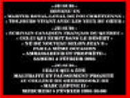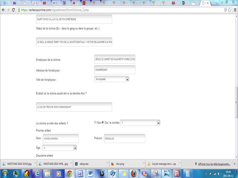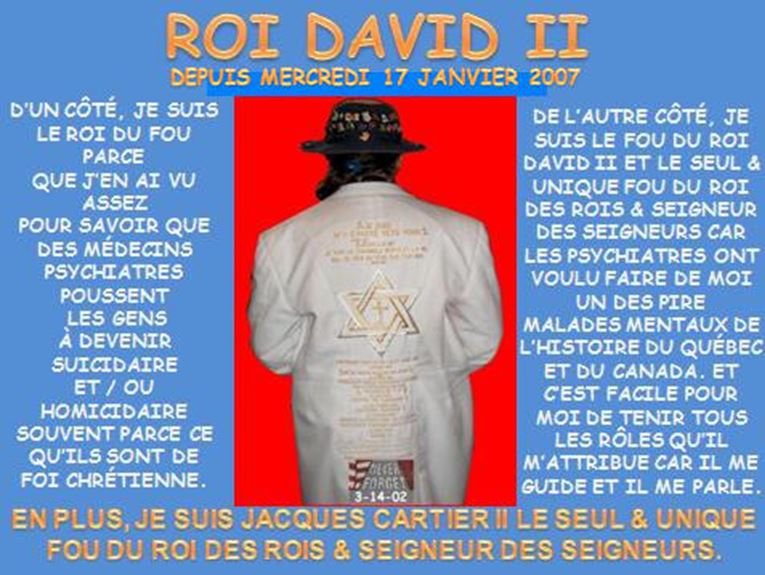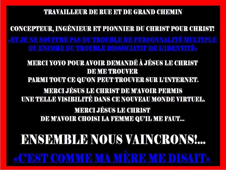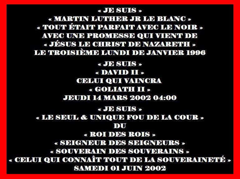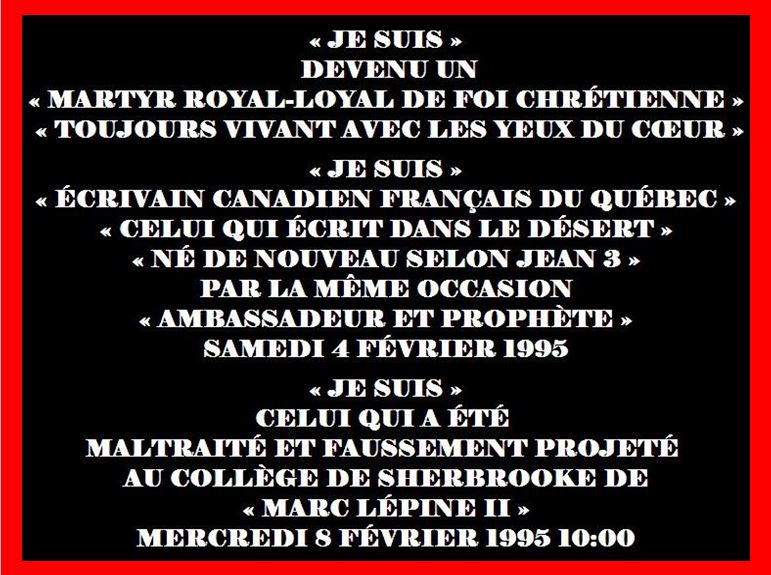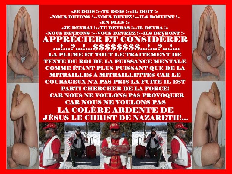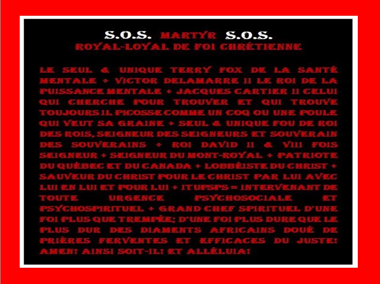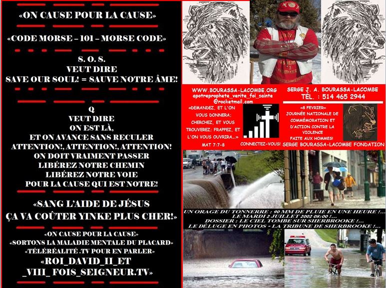D'ENQUÊTE p. s. c'est un «s. o. s. et un 911» en tant que martin luther king jr le blanc tout était parfait avec le noir et je vous rappelle que le docteur et pasteur martin luther king jr avait raison en disant : «une injustice commise quelque part est une menace pour la justice du monde entier!» le lac mégantic est-ce une conséquence des injustices commises à mon endroit! «le christ passe par moi pour vous écrire! et il me dit de vous dire que la conséquence non seulement elle est directe mais elle est aussi en mémoire de ce que tous les chrétiens catholiques, orthodoxes et protestants QUI ont fermé leurs yeux, leurs oreilles et leurs bouches avant et / ou pendant et / ou après mon repassage parmi eux!» permettez-moi de vous dire au train où sont allé les choses! que pouvons nous faire maintenant avec toute cette bêtise? et bien le christ veut sortir le taxage des écoles en se servant de toute cette maudite affaire et EN SE SERVANT DE toute cette sale histoire. et moi je suis partant depuis longtemps comme un joual vert dans le vent d'un nouveau printemps FRINGUANT MÊME L'AUTOMNE! qu'attendez-vous le déluge du saguenay, le triangle noir, le printemps érable, le lac mégantic CAR NOTRE SEIGNEUR DANS SA SOUVERAINETÉ PEUT PERMETTRE UNE FRAPPE À LA MÊME PLACE AFIN QUE LES GENOUX FLÉCHISSENT ET PLIENT. qui a raison? je n'ai pas tort et mon grand frère me le rendra très bien partout dans le monde où il me demandera d'embrasser la terre je le ferai pour sa gloire et le salut du monde car la terre a déjà tremblée pour moi à plusieurs reprises, oui! pour moi elle a tremblée! les signes ont marqués l'éternité à jamais, les cicatrices sont là!