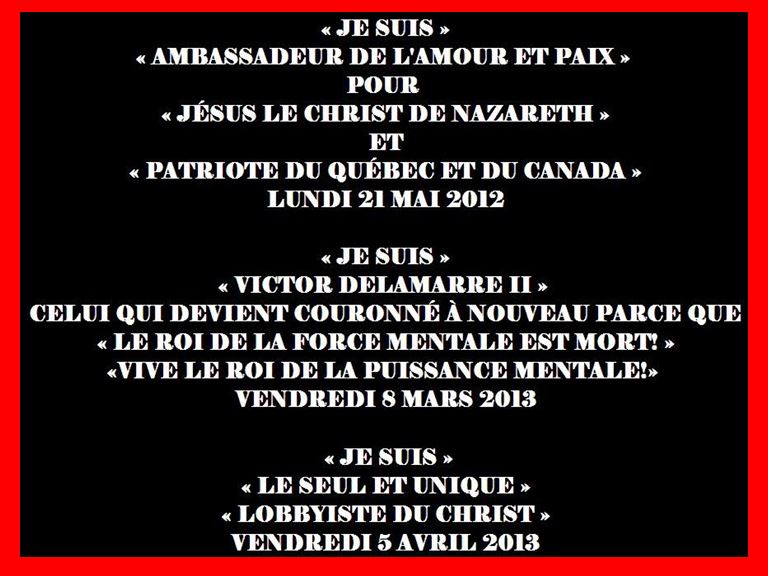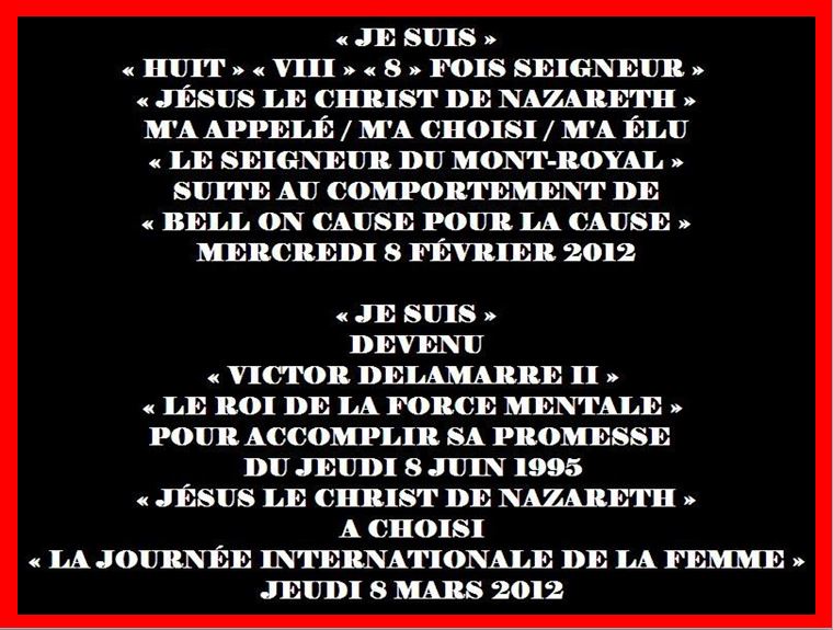 ...XXXXXXXX...XXXXXXXX...XXXXXXXX...XXXXXXXX...XXXXXXXX...XXXXXXXX... SAVIEZ-VOUS QUE JÉSUS LE CHRIST DE NAZARETH A DEMANDÉ UN HUIS CLOS LE JEUDI 7 MARS 2013 ENTRE PAULINE MAROIS CELLE QUI EST DEVENU LA PREMIÈRE, PREMIÈRE MINISTRE DE L’HISTOIRE DU QUÉBEC ET VICTOR DELAMARRE II = LE ROI DE LA FORCE MENTALE AUSSI LE RÉDACTEUR DE CETTE PRÉSENTE LETTRE INTERNET POUR LE SEIGNEUR DES SEIGNEURS.