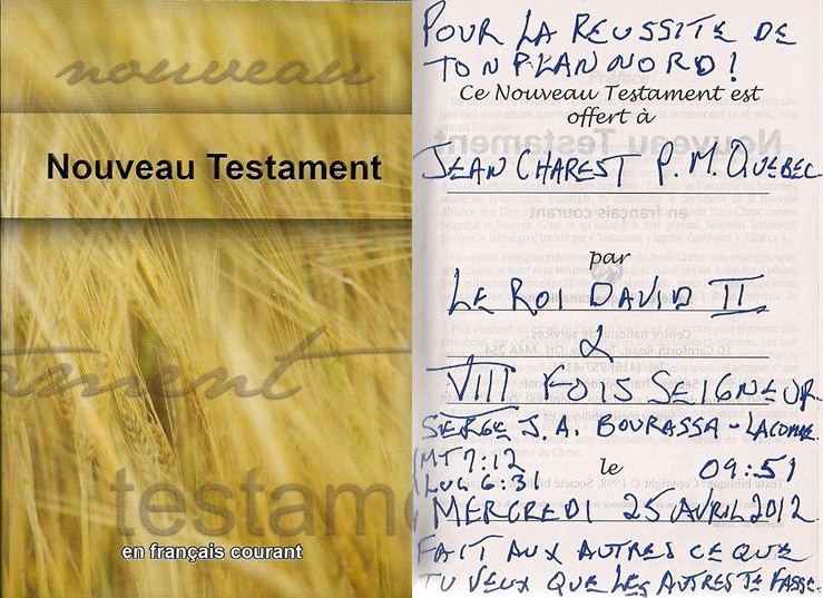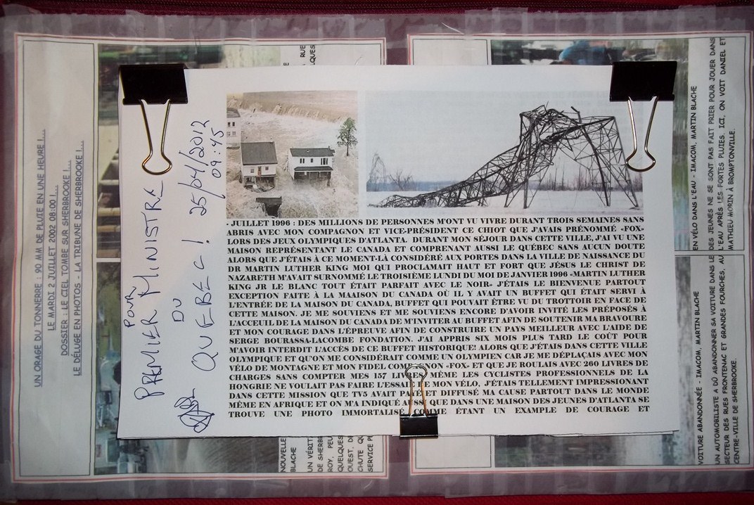 ...VIE J'ENTENDIS AUTRE CHOSE QUE MA PETITE VOIX INTÉRIEUR DE LA CONNAISSANCE DU BIEN ET DU MAL QUE L'ON REÇOIT DES NOTRE NAISSANCE. J'AI ÉTÉ À LA FOIS SURPRIS D'ENTENDRE DE «VIVE VOIX» DIEU (+) NOTRE PÈRE ET JE COMPRIS AU MÊME MOMENT L'IMPORTANCE DE SON APPEL POUR NOUS. VOICI CE QUE J'AI ENTENDU DE «VIVE VOIX» VOUS COMPRENDREZ FACILEMENT POURQUOI J'ATTRIBUE CETTE «VIVE VOIX» À NOTRE PÈRE PAR LA PORTÉE DE SON PREMIER MESSAGE: «NE PANIQUE PAS ICI CAR C'EST MOI QUI T'Y CONDUIT COMME JE SUIS CELUI QUI T'A PERMIS D'ACQUÉRIR TOUTE TES CONNAISSANCE EN SANTÉ ANIMALE. JE T'AI CONDUIS ICI CAR IL S'Y FAIT DE LA MAUVAISE MÉDECINE ET JE VEUX QUE ÇA ARRÊTE. ET AVEC TES CONNAISSANCE TU SAURAS LES TRAPPER COMME UNE SOURIE BLANCHE DE LABORATOIRE ILS NE POURRONT JAMAIS SANS SORTIR. TU VAS SOUFFRIR CAR CES GENS VONT TE TORTURER MAIS TU ES UN DE MES FILS ET JE TE LIBÉRERAI DE CES LIEUX MAUDIT AVANT «PÂQUES» [EN 1995 LE DIMANCHE DE PÂQUES ÉTAIT LE 16 AVRIL ALORS QUE J'AI ÉTÉ LIBÉRÉ PAR SA PUISSANCE LE MERCREDI 12 AVRIL 1995]. TU DEVRAS METTRE LE NOM DE FILLE DE TA MÈRE ENTRE TON PRÉNOM ET LE NOM DE FAMILLE DE TON PÈRE. TU DEVRAS CRÉER UNE FONDATION QUI PORTERA CE NOUVEAU NOM AFIN DE PRÉVENIR CELA À D'AUTRES PERSONNES EN DÉNONÇANT LA «MAFIA MÉDICALE» ET VAINCRE «SES MALADIES MENTALES» AFIN DE CONSTRUIRE UN PAYS MEILLEUR !... LA TÊTE D'OURSE QUE TU PORTE À TON COU DEVIENDRA LE LOGO DE CETTE FONDATION ET JE TE FERAI FAIRE LE TOUR DU MONDE DE TON VIVANT. TE SOUVIENS-TU DE TOUTE LES FOIS QUE TU ME DEMANDAS «POURQUOI MOI ? ET POURQUOI ENCORE MOI ?» MAINTENANT TU VAS COMPRENDRE POURQUOI J'AI DU TE METTRE À L'ÉPREUVE TOUT AU LONG DE TA VIE C'ÉTAIT POUR QUE TU SOIT BIEN PRÉPARÉ À CELLE-CI» J'AI ÉTÉ DÉLIVRÉ DE CE «CALVAIRE PSYCHIATRIQUE» LE 12 AVRIL 1995 SOIT QUATRE (4) JOURS AVANT LE DIMANCHE 16 AVRIL 1995. JE CROIS FERMEMENT QUE CETTE «VIVE VOIX» ÉTAIT LA VOIX DE DIEU (+) CAR J'AI ÉTÉ LIBÉRÉ AVANT PÂQUES, DE PLUS IL ME DIT: «T'ES UN DE MES FILS» ALORS IL EST LE PÈRE ET CE QUI ME DEMANDE DE FAIRE EST «BIEN» JE CROIS AUSSI FERMEMENT À «SA PAROLE» QUE L'APPEL QU'IL M'A DONNÉ LE 12 FÉVRIER 1995 EST IRRÉVOCABLE, SELON CE QUI EST ÉCRIT DANS TOUTE LES «SAINTES BIBLES DE LA TERRE»: PREMIÈREMENT, DANS L'ÉPÎTRE DE L'APÔTRE PAUL AUX ROMAINS CHAPITRE 11 VERSET 29: «CAR DIEU (+) NE SE REPENT PAS DE SES DONS ET DE SON APPEL.» DEUXIÈMEMENT, LORSQUE L'APÔTRE PAUL S'ADRESSE AUX ÉPHÉSIENS CHAPITRE 1 VERSET 18: «ET QU'IL ILLUMINE LES YEUX DE VOTRE CŒUR, POUR QUE VOUS SACHIEZ QUELLE EST L'ESPÉRANCE QUI S'ATTACHE À SON APPEL, QUELLE EST LA RICHESSE DE LA GLOIRE DE SON HÉRITAGE QU'IL RÉSERVE AUX SAINTS,» ET TROISIÈMEMENT LORSQUE L'APÔTRE PAUL PARLE AUX CORINTHIENS CHAPITRE 7 VERSET 17 DANS SA PREMIÈRE LETTRE: «SEULEMENT, QUE CHACUN MARCHE SELON LA PART QUE LE SEIGNEUR LUI A FAITE, SELON L'APPEL QU'IL A REÇU DE DIEU (+). C'EST AINSI QUE JE L'ORDONNE DANS TOUTES LES ÉGLISES.» ET JE SAIS RESPONSABLE CEUX QUI NOUS GOUVERNENT DEPUIS QU'ILS ONT OBTENU LE «POUVOIR D'AGIR» SOIT DEPUIS QU'ILS ONT ÉTÉ «MIS AU PARFUM DE CETTE HISTOIRE INCROYABLE» C'EST-À-DIRE DÈS QU'ILS ONT REÇU PAR COURRIER RECOMMANDÉ MON ENVOIE POSTAL DE SAINT-JOHN NB EXPÉDIÉ LE 3 NOVEMBRE 1995 QUI FUT ADRESSÉ À L'ASSOCIATION DES ÉTUDIANTS DU COLLÈGE DE SHERBROOKE (MAINTENANT CÉGEP DE SHERBROOKE) COPIE CONFORME À 57 PERSONNES. JE ME SOUVIENS QUE LORSQUE J’AI PRIS LA DÉCISION D’ALLER M’EXILER AUX ÉTATS-UNIS PENDANT 388 JOURS PARCE QUE J’AVAIS PEUR POUR MA SÉCURITÉ ET AFIN DE RÉDUIRE LE COUP DE LA SÉCURITÉ DE CELLES DES AUTRES. TANT OU TROP DE GENS C'ÉTAIENT MÊLÉ À CETTE HISTOIRE INCROYABLE AU QUÉBEC. J'AI DONC QUITTÉ MA PROVINCE LE VENDREDI 13 OCTOBRE DE L'AN 1995. À 23:59, JE FRANCHISSAIS LA FRONTIÈRE DU NOUVEAU-BRUNSWICK. EN TANT QUE président et contrôleur DE «SERGE BOURASSA-LACOMBE FONDATION» C'EST À SUSSEX, NOUVEAU-BRUNSWICK QUE MON AUTOBIOGRAPHIE SE TERMINA ET QUI PLUS EST, QUE CELLE-CI SE POSTA PAR COURRIER RECOMMANDÉ. CABINET DU MINISTRE DE LA SÉCURITÉ PUBLIQUE LE 23 NOVEMBRE 1995 MONSIEUR SERGE BOURASSA-LACOMBE 103, RUE OXFORD CRESCENT - APT. 105 LENNOXVILLE (QUÉBEC) J1M 2G3 MONSIEUR, LE MINISTRE DE LA SÉCURITÉ PUBLIQUE, MONSIEUR SERGE MÉNARD, A BIEN REÇU VOTRE LETTRE EN DATE DU 8 NOVEMBRE 1995 DANS LAQUELLE VOUS LUI FAITES PART DE LA CRÉATION DE SERGE BOURASSA LACOMBE FONDATION . DE PLUS, VOUS LUI EXPOSEZ CERTAINS FAITS ET SITUATIONS DANS LESQUELLES VOUS AVEZ ÉTÉ IMPLIQUÉ. LE MINISTRE EST SENSIBLE À LA SITUATION QUE VOUS LUI EXPOSEZ ET A PRIS BONNE NOTE DES OBJECTIFS DE VOTRE FONDATION. JE VOUS PRIE D'AGRÉER, MONSIEUR, L'EXPRESSION DE MES SENTIMENTS LES MEILLEURS. LE DIRECTEUR DE CABINET ADJOINT, ANDRÉ GARIÉPY, AVOCAT N\R: 3768-1 2525, BOUT. LAURIER, 5E ÉTAGE, SAINTE-FOY (QUÉBEC) (418) 643-2112, G1V 2L2 ÉTANT DONNÉ LE BUT DE LA «SERGE BOURASSA-LACOMBE FONDATION» TOUX CEUX QUI SONT AU COURANT DE CETTE HISTOIRE ET QUI ONT LE POUVOIR DE FAIRE QUELQUE CHOSE SONT RESPONSABLE DEVANT DIEU (+) DE LA «HAUSSE DES PROBLÈMES DE SANTÉ MENTALE DANS NOTRE SOCIÉTÉ» CAR JE ME SOUVIENS DU COMBAT QUE «TERRY FOX» A LIVRÉ POUR NOUS EN 1980 ET JE CROIS QUE SEUL LE MONDE POURVU D'UNE BONNE AUTOCRITIQUE SONT CAPABLE DE RECONNAÎTRE LE BÉNÉFICE APPORTÉ PAR SON «COURAGE FACE AU CANCER» SEUL, LES INSENSÉS NE VOUDRONT PAS TIRÉ AVANTAGE DE «MON COURAGE FACE À LA MAFIA MÉDICALE» SEUL, LES «GENS DE BIENS» RECONNAÎTRONT LA «MAFIA MÉDICALE» COMME ÉTANT RESPONSABLE D'UNE BONNE PARTIE DES PROBLÈME QUE NOUS VIVONS TOUS ACTUELLEMENT DANS LE MILIEU DE LA SANTÉ. MON CAS N'EST PAS UNIQUE VOICI POURQUOI: MONSIEUR MARCO FORTIER, CORRESPONDANT PARLEMENTAIRE À OTTAWA POUR LE JOURNAL DE MONTRÉAL S'EST VU REFUSER L'ACCÈS À L'AVION DU PREMIER MINISTRE JEAN CHRÉTIEN LE SAMEDI LE 29 SEPTEMBRE 2001 APRÈS AVOIR ÉTÉ MÉPRIS PAR LA (GRC) AVEC UN AUTRE MARCO FORTIER, CRIMINEL, NÉ LA MÊME DATE QUE LUI, LA MÊME A