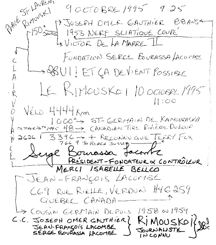 في يوم الأحد, يستثيرني ديسمبر - كانون الأوّل 11ث, 1994 في 08:30 أنا كنت قد استلمت هاتف من سيد إيفان دنيس, هذا واحدة في الحقيقة أنّ هو يريد أن يراقب ترينينغ بريود ي سريريّة. هو يقدّم أن يكتب حرف ل ي أنّ سيتلقّىني هو أن يقرأ قبل أن هو سيرسل هو إلى سيدة إلّيسن. في يوم الإثنين, ديسمبر - كانون الأوّل 12ث, 1994, تلقّىني هو أحمر الحرف أيّ يقول أنّ أنا أتلقّى ما من خبرة في الحصان حجر السّامة وأنّ هو سيكون في خطر وخطأ للواحدة أنّ يستلمني. هو النوع الحرف أنّ هم يؤلّفون أن يتلقّى رفض كتغريك. أنا أفوّض سيد إيفان دنيس أن يرسل هذا حرف لأنّ إتصالي في فلوريدا كان جدّا صلبة, عدّة أشخاص هناك ينتظر ل ي. ث سم دي سيدة إلّيسن جواب بي فإكس ب يقول إلى أستاذي أنّ وفقا ل إعتقاده التهاب ملتحمة على فأرة هذا يكون متعة كالتهاب ملتحمة على حصان حجر السّامة. ل ما سبب, سيد إيفان دنيس يؤخّرني النسخة من هذا حرف ويؤكّدني الموافقة من ترينينغ بريود ي في ديسمبر - كانون الأوّل 15ث, 1994 فقط. في ديسمبر - كانون الأوّل 25ث, 1994, يمشي أنا في مونتريال في وسط المدينة أن يستمتعبنفسي, أخيرا أنا ينهي في قضيب على سينت-دنيس شارع. أنا التقيت ل 36 إمرأة قديم, أم من ثلاثة يوونغ شلد, ترك بزوجه ثلاثون شهور أغو لأنّ هو تلقّى هبوط صغيرة هو أمّنني. أنا تلقّيت إحساس أنّ هذا إمرأة احتاج مساعدتي. هو كان رافقت بأخه مساء اليوم هناك. أنا سألت لذلك أخه أن يرىنا خارجا في أخته. يتوقّف يسأل شيء, يكتسب شيء وأنا أنت لأنّ أنا أجعل فقط مساعدة علاقة. فضلا عن في خمسة سنون, ساعد أنا ترمندووسلي الناس. هو يخلّ ترمندووسلي الناس الذي يكون دفعت أن يساعد أو أن يستردّ. يشكرني ديسمبر - كانون الأوّل 26ث, 1994, سيدة لن دوسّولت مساعد ممرّض رئيسيّة في المستشفى بيار بووشر من لونغيويل, ل يتلقّى يبديه أنّ هو استطاع سررت رجل بعد. أنا كان قبلت بسيدة دوسّولت على ال 15 وفي ال 16ث أبريل - نيسان, 1995, في هذا لحظة هناك جعل أنا المعرفة من هذا ثلاثة أطفال. أنا حتّى لعبت إحتكار مع القديم من فتىه. صديقي غردون بروس أتى أن يبلغني فوق هناك في هذا إستر يوم أن يذهب أن يتلقّى عشاء في المطعم إلى دوفل في 150, أسف مري-نّ في مونتريال, لأنّ هم يخدمون الدجاجة جيّدة يطبخ على جمعات في المدينة. هو ضروريّ أن يحجز (514) 843-3390 في وأن يسأل للمارك أسياد علامة أو إكسفير. أنا صلّيت س ثت الحلم السيدة دوسّولت يأتي يصحّ وبعض شهور أفتروردس هو قال إلى ي أنّ رأى هو غالبا بجدّيّة الرجل الّذي هو أمل أن يلتقي. في ديسمبر - كانون الأوّل 31ست, 1994, يذهب أنا مع صديقي إريك نوتبروون إلى القضيب مرج شربرووك أن ب احتفل النهاية من السنة والبداية من 1995. هو طقس ل ي وه منذ خمسة سنون الآن, ي الذي هبيتثلّي لا يشرب في هذا يقظة اليوم من السنة أنا بلوو-وب بعض شامبانيا زجاجات أيّ أنا أشارك مع صديقي. ال 1ست من سنة 1995, يذهب أنا إلى مونتريال مع صديقي جن-بيرّ شمبن. أنا أرى كلّي أسرة ويسأل أبي أن يباركني بما أنّ هو جعل هو ك أوسجس ي. في يناير - كانون الثّاني 2ند, 1995, يرى أنا ثانية صديقي لن دوسّولت, قبل يترك ب هيتش-هيكينغ نحو المدينة كيباك أن يزور واحدة من ي صديق لوس تيلّون مراجع حسابات للوزارة من الدخل كيباك. دعات أنا تلقّى يكون أن ينفق الأسبوع أولى يناير - كانون الثّاني مع ه, أنا يجعل معرفة مع بوي فريند ه إفريقيّة أبدوو أميدوو. ل هذا أسبوع, يلتقي أنا إمرأة من كرتير سينت-سكرمنت الذي يكون دعات مر-كلود. أنا أنفقت ا لوت الطاقة أن يساعد هذا سيدة في هو أن ينصرف من هذا هبوط. هو حتّى قادني إلى أمه اليوم أولى بما أنّ أنا التقيته. في يناير - كانون الثّاني 8ث, 1995, ذهب أنا إلى الخلف في شربرووك, غير أنّ قبل يترك, أنا أدعو صديقي أبدوو, لوس أس ولّ س ننسي نولن صديق لوس أن يأتي أن يزورني أت هوم قبل أن أنا أترك لمتمرّني في فلوريدا. في يوم الأربعاء, يناير - كانون الثّاني 11ث, 1995, استلم أنا عرض ال ترينينغ بريود في كيباك بالشركة صديق تحالف طبيّة, أنا ينخفض هذا عرض ب يفسّر أنّ كحولي داخليّة يسألني أن يذهب في فلوريدا. مهما, عندما س