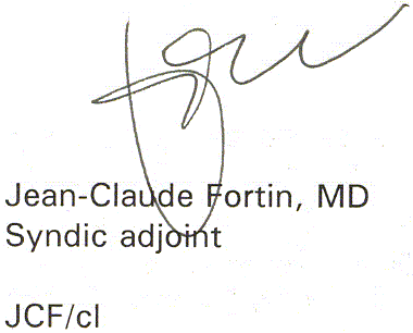 Monsieur, Nous accusons réception de plusieurs documents que vous déposés à la réception du Collège des médecins du Québec, le 21 juin 2004, et que vous identifiez comme étant les plaintes à l'endroit de 15 psychiatres, 8 médecins, 3 hôpitaux et 2 ambulanciers. Les documents remis sont constitués de 4 volumineux cahiers ainsi que d'un CD. Vous dénoncez les traitements qui vous ont été fournis par divers médecins et psychiatres dans divers établissements tels l'Hôpital Douglas, le CHUS Fleurimont et Hôtel-Dieu. Nous constatons également que vous semblez faire l'objet d'une ordonnance de traitement prononcée par la Cour supérieure pour une période de 1 an en avril 2003 et qui semble avoir été renouvelée pour une période de 3 ans au printemps 2004. À la lecture des documents soumis, nous ne pouvons pas retrouver d'indice de manquement déontologique qui pourrait justifier une enquête du Bureau du Syndic. Nous vous informons donc par la présence que nous ne donnerons pas suite à votre demande d'enquête . Nous vous prions d'agréer, Monsieur, l'expression de nos sentiments distingués.