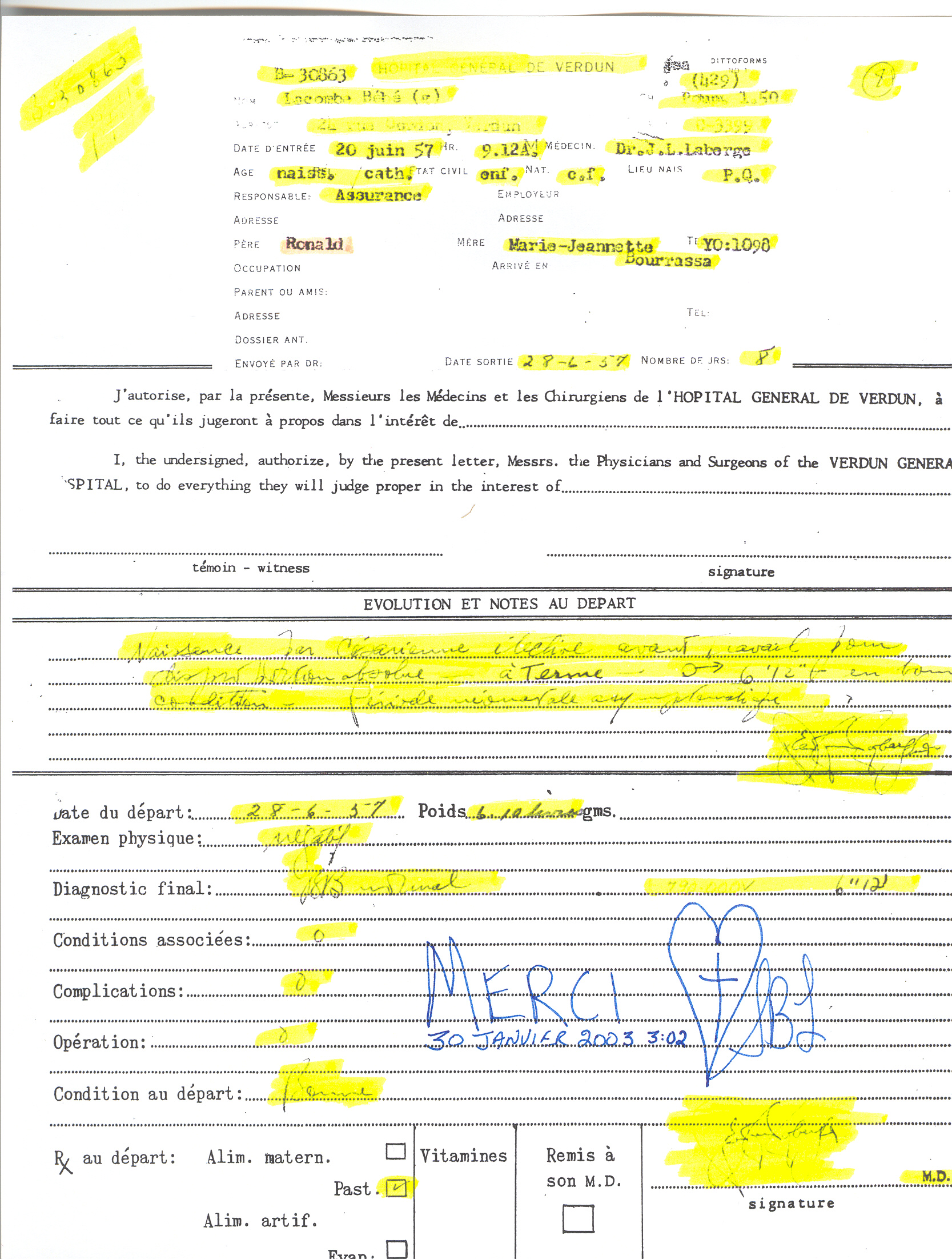 I am privileged to have in hand this page of history because it represents the beginning of my roots. Thank you Lord to have allowed me to know more. I make a point of thanking Dr. J L Laberge for having in the long term to carry out my birth by elective Caesarean before work and to have to detect an anomaly which could have put the life of my mother and/or mine in danger at the time of my birth. As you notice it on this medical report/ratio it was born with VERDUN (QUEBEC) CANADA on June 20, 1957 09:12 at the General Hospital from Verdun formerly also called Hospital CHRIST-ROI. I spent the first eight days of my life in this hospital, can that I left the hospital on June 28, 1957 weighing six books and ten ounces. Because I measured only six inches and half when I was born according to what Dr. Laberge wrote unless it desired is meant my weight with the birth which could be of six books and eight ounces. Though it is, you have the proof now that I am one miraculated as of the birth, it is thus normal that today I would have become a tool in the hands of GOD OUR FATHER. The contents of this page were analyzed by me on January 30, 2003 to 03:02.