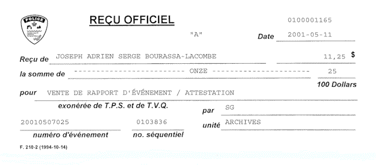 Charge - Death threat towards the personnel of the 9th floor Event of the SPCUM: 20010507-025 Friday, May 04 2001, I go to the Caisse populaire Desjardins West of Villeray is in their Center of St. Lawrence service, 8535, boulevard the St. Lawrence Montreal (Quebec) H2P 2M9 Telephone: (514) 382-6096. It be 15h10 when I learn that the schedule just to change, i.e. that rather than de closed at 4:00PM it closed at 2:00PM. On the other hand they invite us to ring them between 2:00PM and 4:00PM to receive a service, I ring and a lady answer me that they are now closed Friday at 2:00PM however Jarry East they are open their until 4:00PM to offer a service of cashier. I thus arrive at the Caisse populaire Desjardins of Villeray West - Transit: 815-30219, 205, street Jarry East, Montreal, (Quebec) H2P 1T6 Telephone: (514) 382-6096 to learn that they are open until 2:00Pm to obtain the service of a cashier and until 4:00PM for all other service. I must thus used their automatic teller machine, it is 3:25PM. I deposit my Welfare check of 755.42 $ bus I am classified by the Social Welfare like living with a severe employment constraint. Thereafter, I quickly realize which I am in the incapacity to withdraw more than 300 $. I am a little to oppose by this constraint and I say to myself whereas I will be able to recover the 455.42 $ next Monday. Monday on May 7th 2001, I go to the Caisse populaire Desjardins - Transit: 815-30500, 5-100, Promenade, Complexes Desjardins, Post-office box 244 Desjardins Branch, Montreal (Quebec) H5B 1B4 Telephone: (514) 281-7101. I then learn by the cashier that the 455.42 $ coming from Social Welfare are frozen for the six next days. Knowing that I asked already several times at the Caisse populaire Desjardins Sherbrooke-East - Transit: 815-50037, 2, street Bowen South, Sherbrooke, (Quebec) J1G 2C5 Telephone : (819) 565-9991 not to do that, but rather to allow me to withdraw at the automatic cashier the approximate value of the amount of the sum which the Social Welfare pays me monthly. I went to the 39e floor of the Complex rather than assume the expenses of a long distance call towards the Caisse populaire Desjardins which cannot satisfy my request. It was 12:10PM when I met the receptionist, I identify me with my card of business to her, moreover, I explain her the behaviour of the Caisse populaire Desjardins Sherbrooke-East as they freeze my social assistance check. She suggests me to deposit a formal complaint against the Caisse populaire Desjardins Sherbrooke-East. To be done, she says to me that I will have to return in the same building, on the 9th floor around 1:30PM and to ask either Line A. Pomerleau or Monique Leduc at the complaints service. Before leaving her, I had taken the time to told her that : as Terry Fox wanted to overcome cancer after having lost a leg of this disease, it is legitimate for me to overcome the mental illnesses after having lived : sequestration illegal during 57 days, public misdeeds, manufacture of forgery, use of forgery, ways of facts, harassing criminal, physical and mental torture, chemical torture (Lithium, Haldol, Rivotril, Dolmane, Ativan, Cogentin, Mellaril and Stelazine), attempt at murder per overdose of legal drugs, plot and persecution forcing an exile. I took the time to support my statements by showing her the various articles of newspapers which were published on this topics as well as the Web page on paper clearly showing out of orange the forgery of my medical report. I behave as I do everywhere else, I acted with the professionalism of a promotional expert. The whole occurs in five minutes at most because I speak to her when she was not occupied at the front desk. I am back thus towards 1:17PM, I ask a woman who works with the security to show me the way to go to the 9th floor. It is significant to know that I wear my official jacket thus we can see registered on this one: «Serge Bourassa-Lacombe's Foundation - Victor DeLamarre II - Martin Luther King Jr The White Nothing Was Wrong With The Black.» I arrived on the 9th floor towards 1:20PM, I seek for the complaints office and I realize that there is no indication for that office. At this point in time arrives 3 agents of security by the elevator and another by the staircase. The man and the woman of security which I had crossed at the lobby of the ground floor were on the 9th floor with they others. One told me that the receptionist of the 39e floor had said to them that I had to utter death threats at the place of the personnel of the 9th floor. One of the agents asks to me whether I can positively identify me using an identity card, I then show him my passport and my driver license. I ask this agent to identify him, he says to me to be called Pierre Beaudoin, Director of the security and invited me to take is telephone number (514) 281-1870. I register the whole in my electronic organizer Sharp ZQ-180, they check if a complaint was formulated officially. Claude Desjardins, Chef of the Security for the Confederation of the Movements of the Caisse populaire Desjardins confirms it by telecommunication. The police officers are on the way and while waiting for their arrival, one of the agents also speaks by telecommunication with ambulance men. The agents of district Pascal Arsenault Number 3624 and Samuel Baker Number 2546 of the police station # 21 1180, street Sainte-Elisabeth, Montreal (Quebec) H2X 3C4 Telephone : (514) 280-0121 Fax : (514): 280-0621 arrived there at or towards 1:45PM. The agent Fournier questions them, Pierre Beaudoin the Director of Security confirm the charges was real. The agent Fournier requires of me to identified me with an identity card. I present my passport to him as my drivers license. I also explain to him that my name was changed on July 12th, 1996 by the Director of the Civil State Me Guy Lavigne. The agent Fournier notices the beauty of my official jacket, I then place myself back against all these people so that they can see t