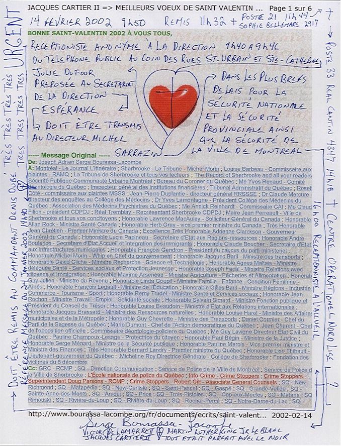 ----- Original Message ----- Subject: JACQUES CARTIER II =» INVITE YOU TO CLICK ON THIS ANIMATED HEART AND WISH YOU IN 2002 A LOVE HOPE ALL YEAR AROUND AND TAKE THE OPPORTUNITY TO UPDATE YOU! Who conscientiously will read this letter from the beginning to the end including everything as recent documents which are very important for the national security of our country. As all those one who had written the dictation which I had transmitted by telephone to them on January 14th - 15th - 16th, 2002. It's a historic dictation because it was the first time that I passed a message by this way hoping to convince people in a Repentance to counter the perverse effects of this REBELLION SPIRIT which exists towards the FOUNDATION SERGE BOURASSA-LACOMBE since the beginning of its creation! «Words will always fly away, but writings will always stay» As well as: «Any truth isn't good to say, as any truth is good to read» «THE