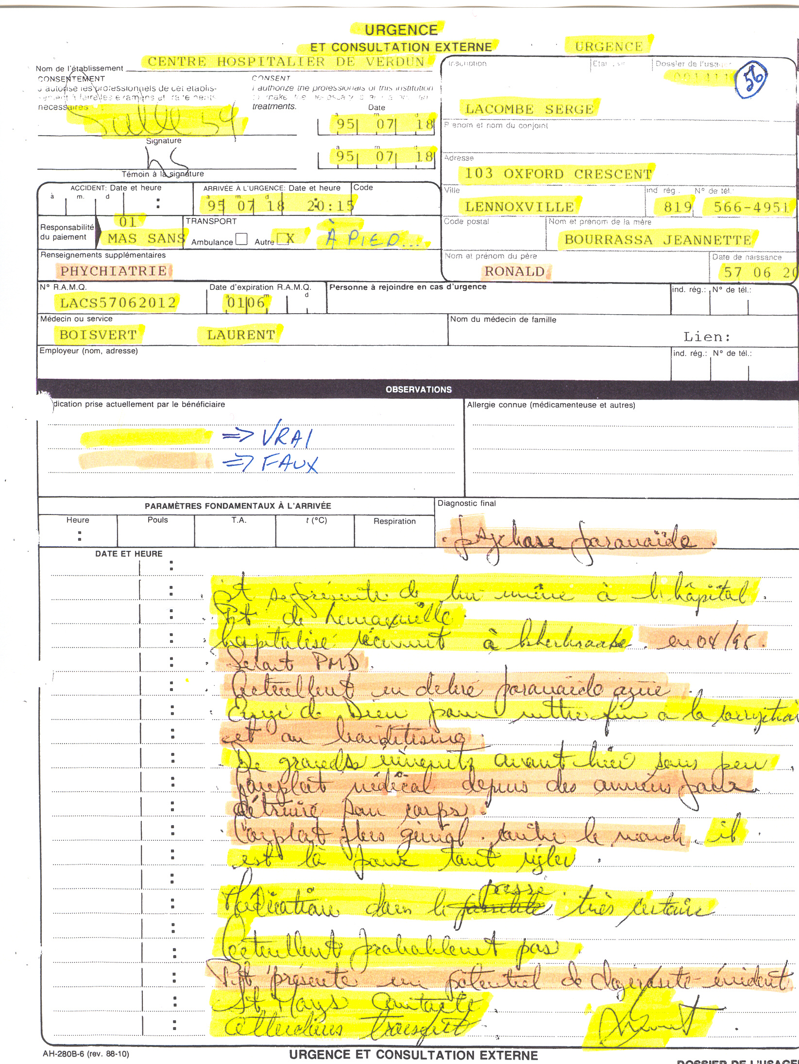 Se acuerda bienestar llegado muy al Hospital de Verdun el 18 de julio de 1995 entre la mesa 20:38 y el crepúsculo 21:14. para incluir el estado de mi llegada al Hospital, es necesario saber que este día allí se ha rechazado en cinco clínicas médica. Con todo, estaba bien muy vestido y muy propio de mi persona además tener en mi posesión mi tarjeta de seguro enfermedad con mi fotografía. Mis padres me llamaban el sin refugios de lujo, mientras que se aturdía a mis amigos todos ante todo este asunto. Hecho que debe tenerse en cuenta esta segunda página de este informe numerado de 56 a 59 puerta la paginación 56, se ve muy bien informado por el Doctor Laurent Boisvert del Centro Hospitalario de Verdun que me presenté mi incluso al Hospital. Además, la revelación de una profecía que esto se realiza, que se realizado, que va a realizarse y que se realizará por la GRACIA de DIOS por la HERENCIA que el REY de los reyes y SEÑOR de los señores nos dio: "enviado de DIOS para poner fin a la corrupción y grandes acontecimientos tendrán lugar pronto y es allí para regular todo" Medicación anteriormente muy determinada, actualmente probablemente no. Agradezco a DIOS NUESTRO-PADRE he permitido que esté revelado después de 70 meses. El Doctor Boisvert escrito también: psicosis paranoide, hospitalizado en abril de 1995, sería PMD, actualmente en delirio paranoide agudo. Conspiración médica desde años para destruir su cuerpo. Conspiración más general contra el mundo. Paciente presente un potencial de peligrosidad evidente. Deseo agradecer a DIOS NUESTRO-PADRE haber permitido al Doctor Laurent Boisvert haber llegado incluso a escribir en particular lo que es rojo y graso. Ya que estas observaciones nunca salieron de mi boca en todo tiempo, en todo lugar, y en toda circunstancia. Y los testigos son numerosos. Observan como mi lo que marcar con rotulador fluorescente en yema de huevo como la veracidad de mi declaración cima al Doctor Laurent Boisvert lo que quiere ser también una Profecía: "enviado de DIOS para poner fin a la corrupción, grandes acontecimientos tendrán lugar pronto, son allí para regularlo todo." Se ve esto que pasé a ser después de 7 años y medio por la GRACIA de DIOS. Deben saber que el tiempo para DIOS es muy importante según SU VOLUNTAD y no los suyos: «pero los cielos y la tierra actuales están reservados por su palabra para el fuego, guardados para el día del juicio y de la destrucción de los impíos. El día del Señor Pero, amados, no ignoréis esto: que para el Señor un día es como mil años, y mil años como un día. 9El Señor no se tarda en cumplir su promesa, según algunos entienden la tardanza, sino que es paciente para con vosotros, no queriendo que nadie perezca, sino que todos vengan al arrepentimiento.» 2 Pedro 3:7-9 Me acuerdo muy bien de esperar pacientemente en la sala de espera. Me acuerdo muy bien de este día para no tener ni almorzar, ni cenar, ni cena a causa de una injusticia social terrible. Conocen el ayuno y he ayunado muy a la longitud del día ya que mis pies requerían de aceptarse por la medicina, a pesar del hecho de que poseía toda pero conocimiento en Salud Animal. No conseguía tomar cuidado de mis pies p que DIOS no lo permitía. Sabía por el contrario que mis pies sufrían han ido demasiado. Eso hacía desde mi salido del CENTRO HOSPITALARIO UNIVERSITARIO de SHERBROOKE que iba varios kilómetros al día. Mis pies sufrían de pies de atletas severo acompañado de seta microscópica. El Doctor Laurent Boisvert vino a mi encuentro hacia 22:15 luego lo trajo en una parte cerrado. El Doctor nos sabía solo, sin embargo no lo éramos ya que DIOS estaba con mi, SUS HIJOS JESÚS-CRISTO de NAZARETH el que se parió VIRGEN MARÍA estaba con mi y la HERENCIA que lo dejó o incluso el ESPÍRITU-SANTO. Ya que se le escribe: «Gracia y paz os sean multiplicadas en el conocimiento de Dios y de Jesús nuestro Señor. Virtudes del cristiano Pues su divino poder nos ha concedido todo cuanto concierne a la vida y a la piedad, mediante el verdadero conocimiento de aquel que nos llamó por su gloria y excelencia, por medio de las cuales nos ha concedido sus preciosas y maravillosas promesas, a fin de que por ellas lleguéis a ser partícipes de la naturaleza divina, habiendo escapado de la corrupción que hay en el mundo por causa de la concupiscencia.» 1 Pedro 1:2-4 El Doctor Boisvert me planteó la siguiente cuestión: "Es lo que yo puede hacer para ti?" Más que de pedirme muestra pues tus pies. Retiro rápidamente mi zapato así que la parte baja que elevo en este momento allí en mi pie derecho, luego yo consultado mi pie derecho de mis dos manos para elevarlo a la altura de la cara del Doctor Boisvert. Le digo en el mismo momento: "R' guarda a Doctor, R' guarda a Doctor, mi pie los dos son similares." Luego deposito mi pie en tierra y le vuelvo a la espalda trasladando mis pantalones, bajándolos hasta en parte baja de las rodillas agarrando también mis bajo prenda de vestir al paso diciéndole: "R' guarda a Doctor, R' guarda a Doctor, nunca he tenido la entrepierna heredado así mismo de mi vida debido a una injusticia social." Destaco mis pantalones y vuelvo a poner la parte baja y el zapato que había retirado para demostrarle mis problemas cutáneos. Ya que iba sobre bombillas desde hace varias semanas. Le explico que a raíz de un cruce de identidad entre mi y otro individuo, fui conduzco al CENTRO HOSPITALARIO UNIVERSITARIO de SHERBROOKE un lugar o soy que se guardó 57 días sin resolución de corto y que hay contra mi voluntad torturas químicas terrible: Litio, Haldol, Dalmane, Rivotril, Ativan... "" Y que me gustaría que para tener acceso a mi informe médico el Hospital de Sherbrooke me pide pasar por un médico. Le pide entonces llamar por teléfono al CHUS para hacer venir mi expediente médica CHUS 398 068 para que se lo pueda lo observado juntos. Le digo que una Fundación existe y llevo mi nombre s