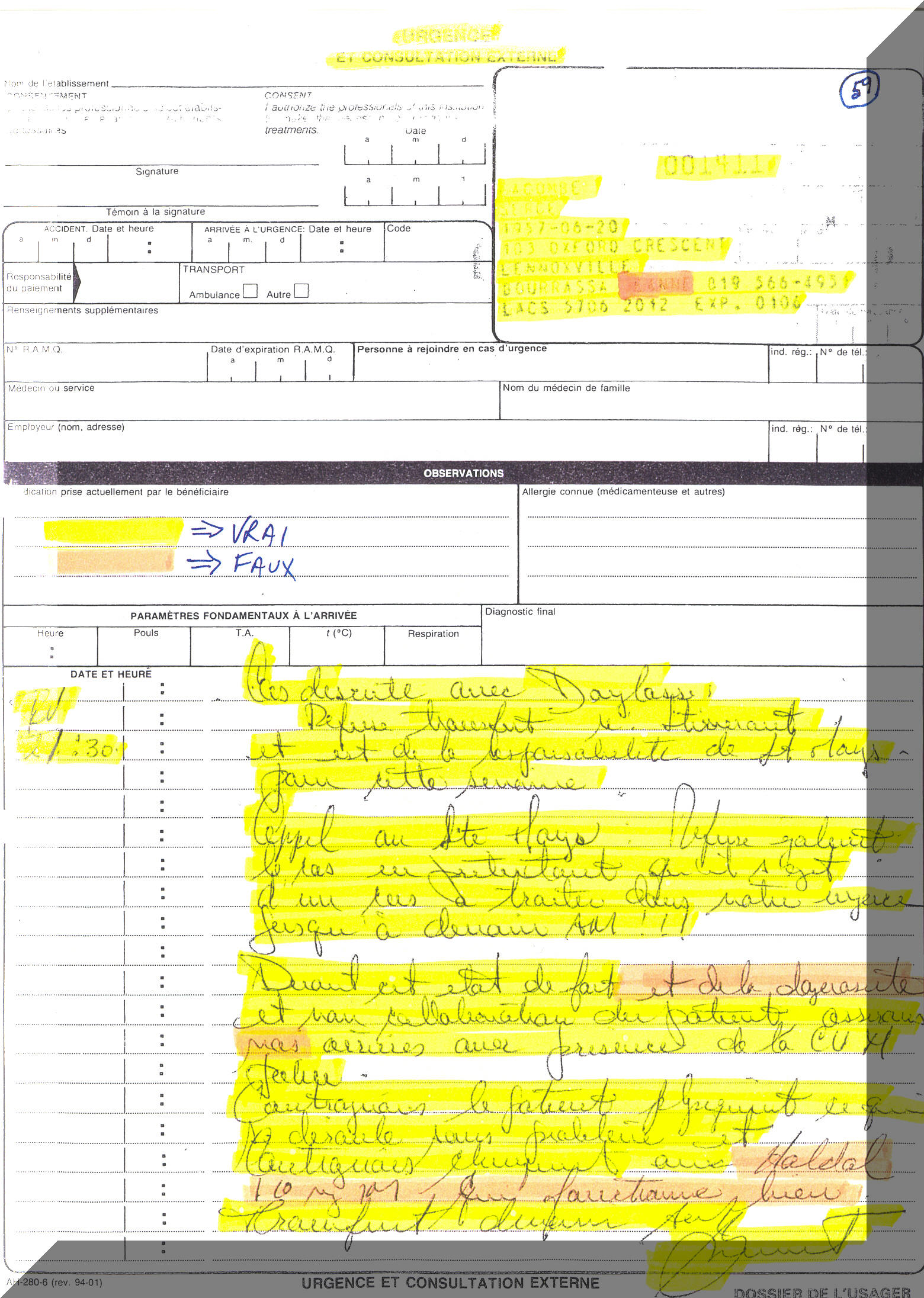 Se acuerda bienestar llegado muy al Hospital de Verdun el 18 de julio de 1995 entre la mesa 20:38 y el crepúsculo 21:14. para incluir el estado de mi llegada al Hospital, es necesario saber que este día allí se ha rechazado en cinco clínicas médica. Con todo, estaba bien muy vestido y muy propio de mi persona además tener en mi posesión mi tarjeta de seguro enfermedad con mi fotografía. Mis padres me llamaban el sin refugios de lujo, mientras que se aturdía a mis amigos todos ante todo este asunto. Hecho que debe tenerse en cuenta la primera página de este informe numerado de 56 a 59 puerta la paginación 59, puede considerar la cosa como un incidente sin perjuicio. Se ve bien muy el resumen de un planteamiento entre el Doctor Laurent Boisvert del Centro Hospitalario de Verdun y el Hospital Douglas de Verdun así que el Hospital St-Mary' s. Se puede leer también en esta página un comentario muy perjudicial en el objetivo de convertirse en cómplice después del hecho: Ante este estado de hecho y la peligrosidad y no colaboración del paciente garantizan nuestras partes con presencia del CUM policía. Me acuerdo de llegar al hospital promovido final por el sistema médico a lo largo de este día, por el contrario nunca no he presentado de la peligrosidad ya que había sido paciente desde mi venido en este hospital. Me acuerdo de presentarme a la recepción de la urgencia. No se me no perdía en ningún caso en mi estado psicológico, te es decir terriblemente mal a los pies y me acuerdo que yo tenía hambre demasiado mal de ser servido por el sistema de salud. Presento mi tarjeta de seguro enfermedad el a designada a la recepción para que me registra. Durante que registra, retiro mi zapato y la parte baja de mi pie derecho para que pueda mostrarle mi pie, aumentando mi pierna perpendicularmente a mi cuerpo él para mostrar que me tenía mal al pie y no a la cabeza. En efecto tenía 8 vendajes por pie causado por bombilla, sobre bombilla, sobre bombilla + fongus (seta) + pie de atleta (o incluso atlético fútbol). Las bombillas entre carne que es los más dolorosos. Termina el registro y me indica de dirigirme en la sala de espera pidiéndome ser paciente que el médico de guardia debería verme dentro de alrededor de una hora o una hora y media. Le respondo entonces que la perseverancia y la paciencia son dos virtudes que poseo desde mi infancia. Por el contrario, a la luz de la lectura de esta página 59 se da cuenta de que el equipo médico vio con la ayuda del número de mi tarjeta de seguro enfermedad que tenía antecedentes psiquiátricos al CENTRO HOSPITALARIO de SHERBROOKE sin por ello conocer las razones. Cuando el Doctor Laurent Boisvert escribe que quería asegurado sus partes con la presencia de la policía del CUM. Miente ya que soy yo quien lo había pedido a raíz de la no lucidez comportamental del Doctor Boisvert. Verán porqué en las páginas siguientes. Es necesario que sepan también que el 11 de febrero de 1995, se había comprobado y menosprecio para otro individuo por el Servicio de Policía de Sherbrooke después de ser que me he convertido en víctima de fechoría pública a mi lugar lo que me condujo al Centro Hospitalario de Sherbrooke CHUS 398.068 sin resolución de tribunal. En este día del 11 de febrero de 1995 se me condenó se me juzgaba sin y es mi deber de ciudadano exigir que justicia se me vuelva. Deben saber que a salir del Hospital de Sherbrooke el 12 de abril de 1995, tenía una cosa que descubrir: ¿Cómo y por qué eso me había llegado? Y todos los responsables no querían hacerse descubrir entonces la persecución comenzaron a partir de mi salida del CENTRO HOSPITALARIO de SHERBROOKE. Cuando se persigue a una persona no se imagina serlo pueda que lo es realmente. No hay pues en este individuo de psicosis paranoide ya que se persigue realmente. ¡Imaginar un poco una persona que se hace afectar violentamente a la cara, esta persona no se imagina haber sido afectada puesto que sangra abundantemente! Como Presidente de la FUNDACIÓN SERGIO BOURASSA-LACOMBE desde hace ocho años ya, creo que el tiempo acabó de desengañar y désoccu este medio de la Salud demasiado mucho tiempo conservado mística y oculta. Muy de acceso, creo que mis amigos los diccionarios: El Pequeño Larousse y el Pequeño Robert así que el Webster y todos Diccionarios médicos me ayudarán a exponer el nivel de mis pensamientos. Creo que se utiliza el término "PARANOIA" sobre se utiliza y/o mal en nuestra sociedad. Según mi amigo el PEQUEÑO LAROUSSE para el término "PARANOIA": Nombre femenino (palabra griega que significa desorden de la razón). Psicosis caracterizada por un orgullo exagerado, del egoísmo, la sobrestimación mi, la desconfianza, la susceptibilidad, la agresividad y que genera una manía persecutoria. persecución: no femenino 1. Acciones de perseguir. || Tormento físico o moral infligido con obstinación. Las persecuciones sufridas por los primeros cristianos. 2. Por extensión Fastidio, maldad que se hace sufrir a qqn. 3. PSYCHO Manía persecutoria: delirio de interpretación de una persona que cree ser el objeto de malevolencias sistemáticas. obstinación: nombre femenino Voluntad perseverante, dura. orgullo: nombre masculino 1. Opiniones demasiado ventajosos sí mismo, de su importancia. 2. (en buena parte.) Sentimiento legítimo de su valor, de su dignidad. 3. (Afr. subsah.) Orgullo de China: arbusto decorativo (césalpiniacées) a flores amarillas y rojas. egoísmo: nombre masculino Amor exclusivo sí; disposición que debe buscarse exclusivamente su placer y su interés personales. "el egoísmo es un veneno de la amistad" (Balzac). Ant. altruismo, generosidad. sobrestimación mi: nombre femenino, darse mucha importancia desconfianza: nombre femenino, disposición a ser desconfiando; estado de la persona que se desconfía. Sus argumentos despertaron mi desconfianza. susceptibilidad: nombre femenino 1. Caracteres de una persona que se