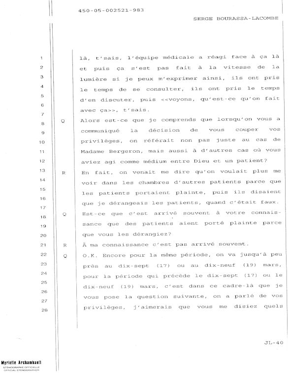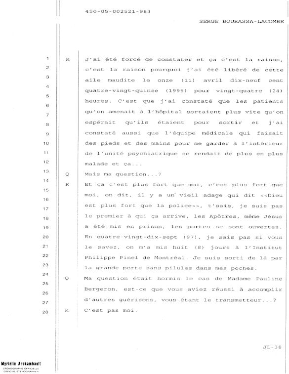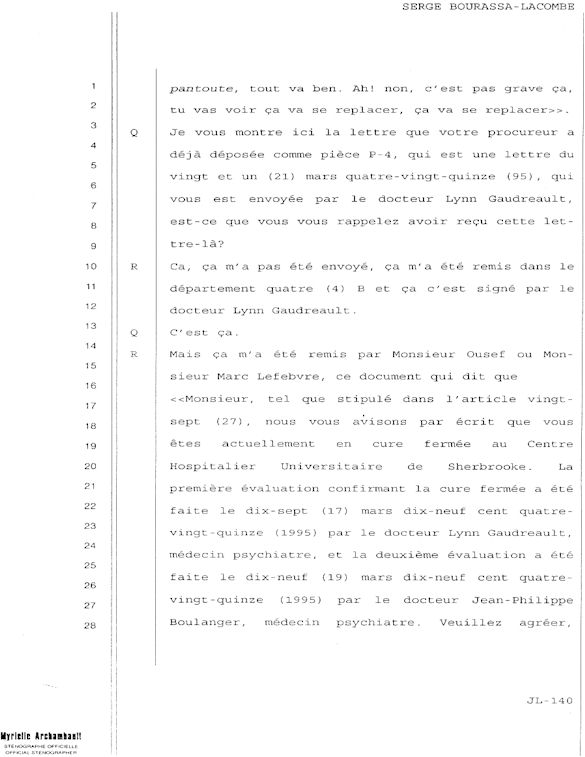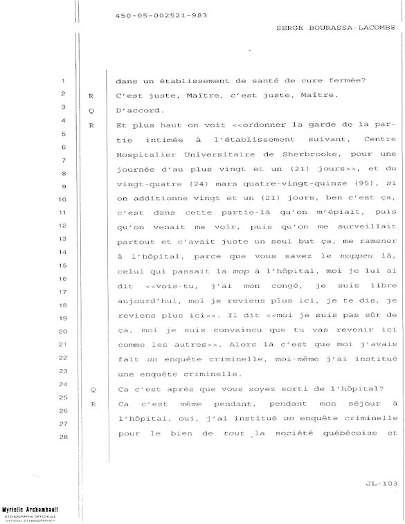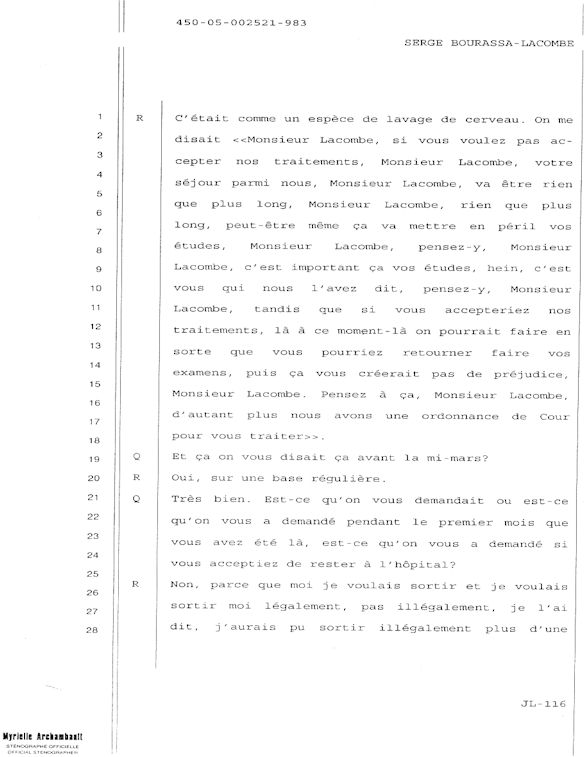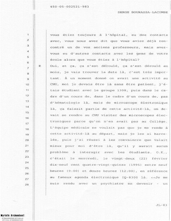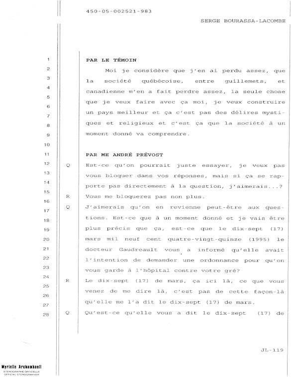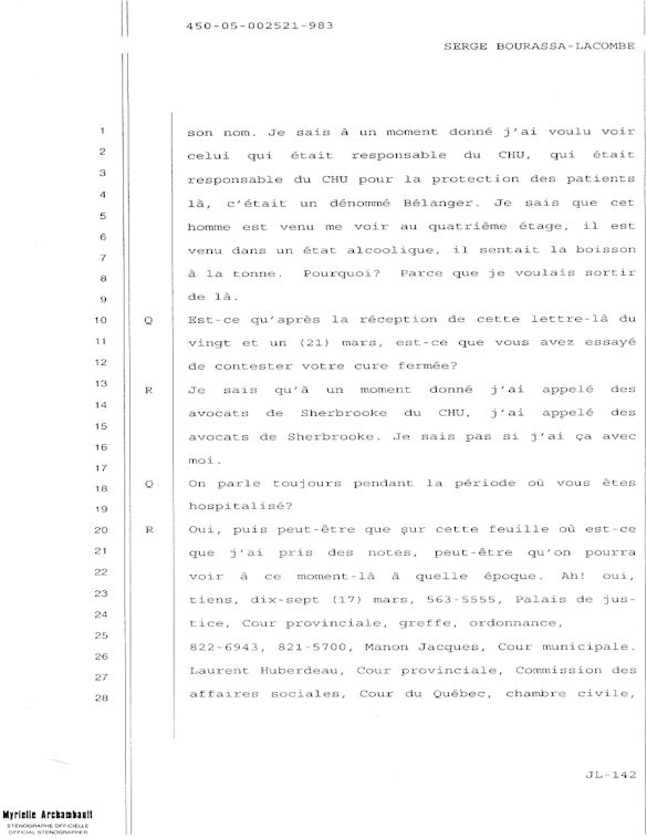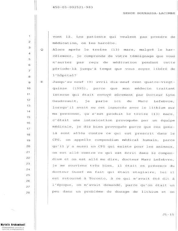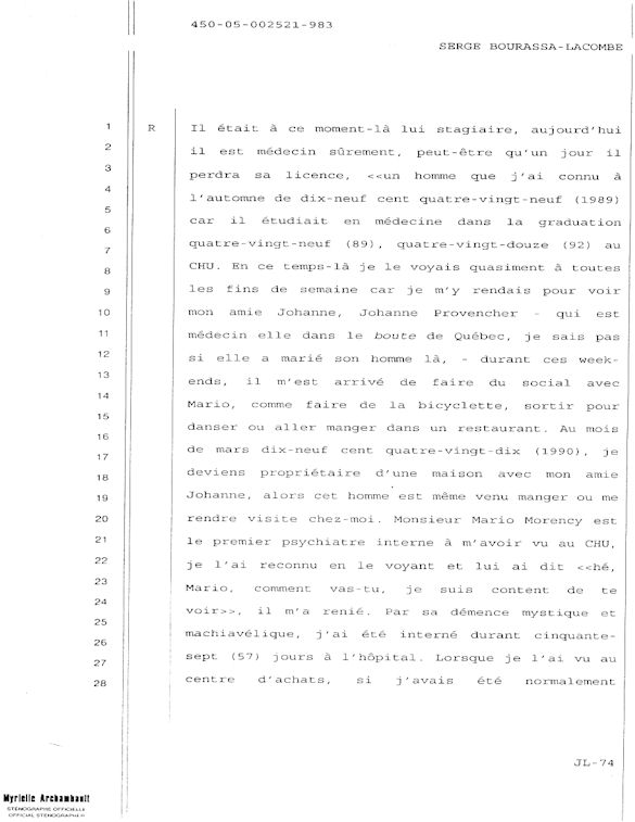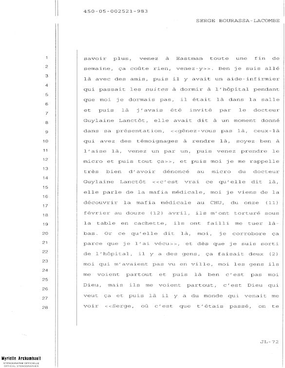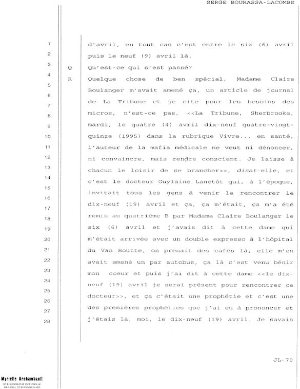 COMUNICADO DE PRENSA DEL MARTES 27 DE JUNIO DE 2000 - LA TRIBUNA DE SHERBROOKE - ESCASEZ DE PSIQUIATRAS AL CHUS - DURANTE LOS 10 ÚLTIMOS MESES, SEIS DE LOS 18 MIEMBROS DEL EQUIPO DE ESPECIALISTAS DEL DEPARTAMENTO DE PSIQUIATRÍA DEL CENTRO HOSPITALARIO UNIVERSITARIO DE SHERBROOKE VOLVIERON A PONER SU DIMISIÓN. - 30 - A SERGE JOSÉ ADRIEN BOURASSA-LACOMBE LE QUISIERA SABER: ¿SE IMPLICABAN EN EL EXPEDIENTE DEL CHUS 398.068? ¿SE ENFRENTARON AL POTENCIAL DE PELIGROSIDAD DEL MEDIO (O INCLUSO MAFIA MÉDICA)? SI ALGÚN EL POSEE INFORMACIÓN QUE PUEDE AYUDARME A OBTENER JUSTICIA ANTE EL CUERPO MÉDICO IMPLICADO EN EL EXPEDIENTE DEL CHUS 398 068. ESTAS REVELACIONES SE APRECIARÁN MUY PARA CONVENCER LOS CULPABLES ARREPENTIRSE E INCLUIR QUE LA VERDAD QUE ES DICHA CELIDONIA EL CUERPO Y CURADA EL ALMA. ENTONCES ES MEJOR PARA ELLOS QUE LA VERDAD ESTÉ REVELADA LO MÁS BIEN POSIBLE, YA QUE JÉSUS LE CHRIST PONDRÁ UN DÍA EN LUZ LO QUE SE OCULTA EN LAS OSCURIDAD, Y QUE MANIFESTARÁ LAS INTENCIONES DE LOS C?URS. ¡ENTONCES CADA UNO RECIBIRÁ DE DIOS LA ALABANZA QUE SE LE DEBERÁ!