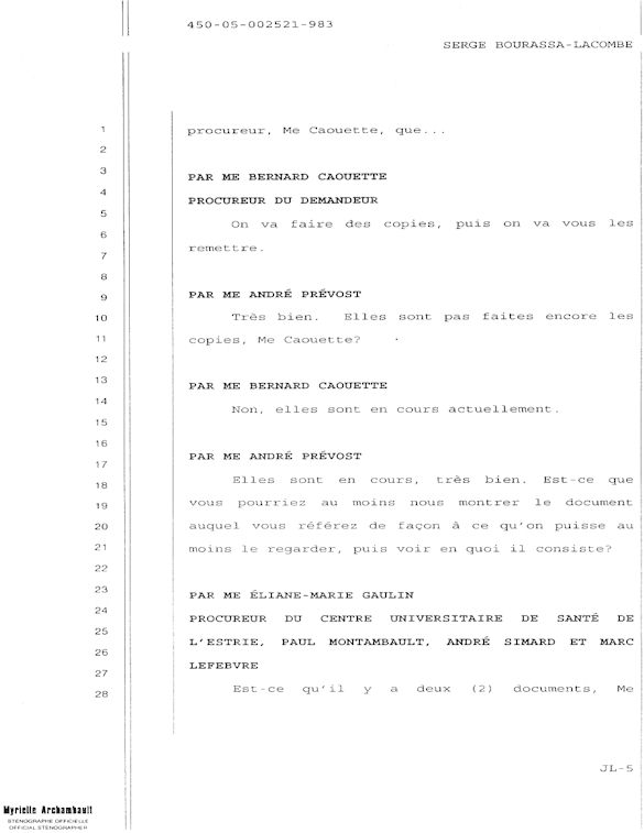 PRÉSENT: NOM DES PARTIES: SERGE BOURASSA-LAC0MBE Demandeur - c. - CENTRE UNIVERSITAIRE DE SANTÉ DE L'ESTRIE et LYNN GAUDREAULT et JEAN-PHILIPPE BOULANGER et CLAUDE ARBOUR et PAUL MONTAMBAULT et ANDRÉ SIMARD et MARC LEFEBVRE Défendeurs COMPARUTIONS: ME BERNARD CAOUETTE PROCUREUR DU DEMANDEUR ME ÉLIANE-MARIE GAULIN PROCUREUR DU CENTRE UNIVERSITAIRE DE SANTÉ DE L'ESTRIE, PAUL MONTAMBAULT, ANDRÉ SIMARD ET MARC LEFEBVRE