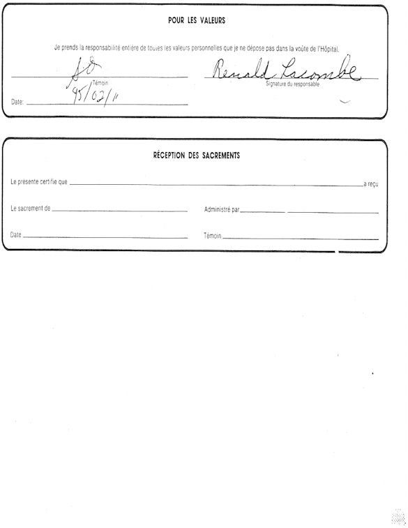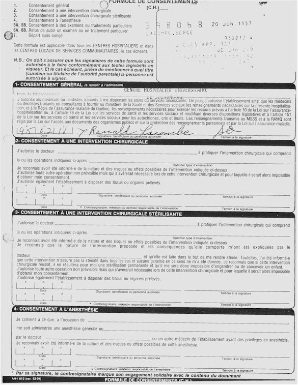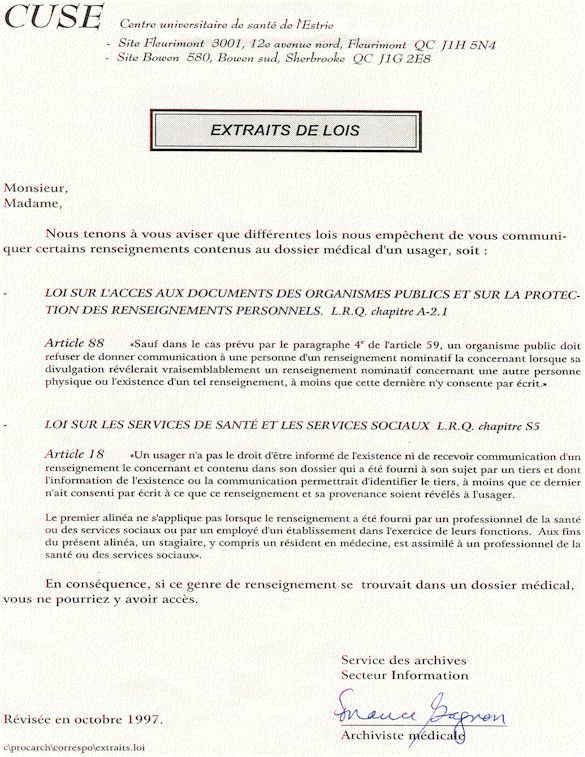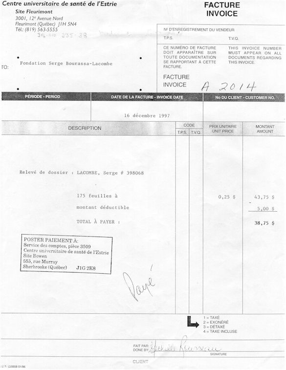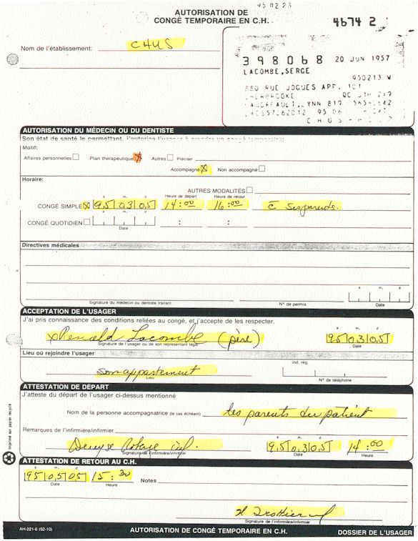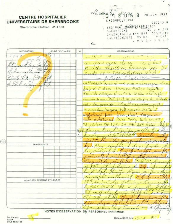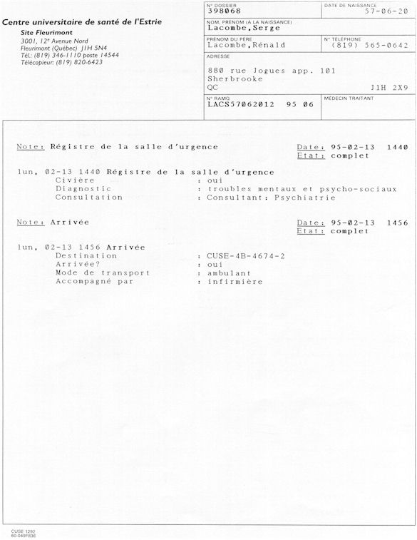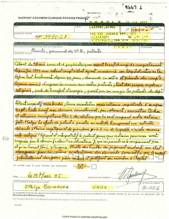 You understand now why since April 1995, I ask those whichcontrol us that a public investigation be instituted in the psychiatric medical world in order to save: human lives. More especially as I remember to have lived the whole after being arrested following a legal error of identity and being imprisoned in spite of me in the University Hospital complex of Sherbrooke (CHUS/CUSE) without ordinance of court during 57 days, it is as in this hospital as I was tortured chemically during 31 days. I remember to have also lived in the Hospital complex of Verdun (CHA) the evening of the 18 and during the night of July 19, 1995. Then 434 days of exile apart from Quebec including 388 days in the United States. I remember to have lived 26 days of prison including eight days at the institute Philip Pinel of Montreal.