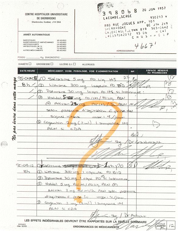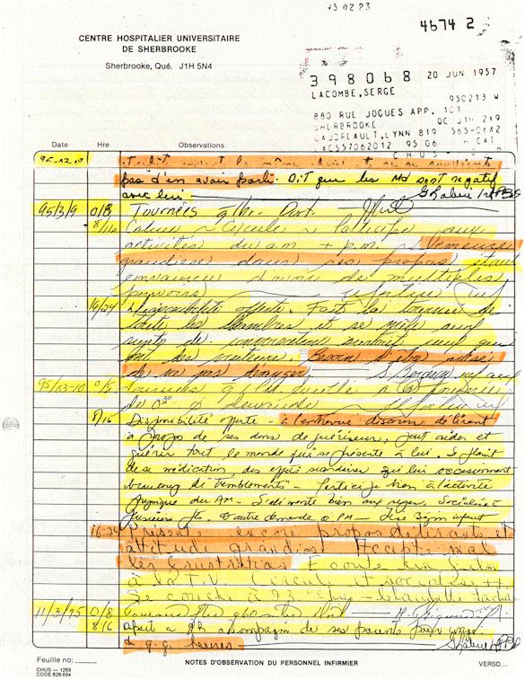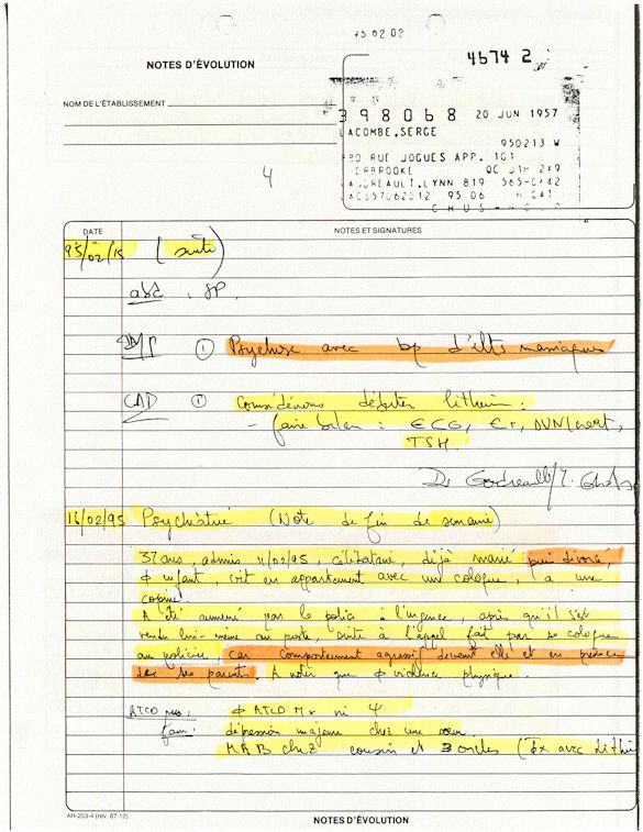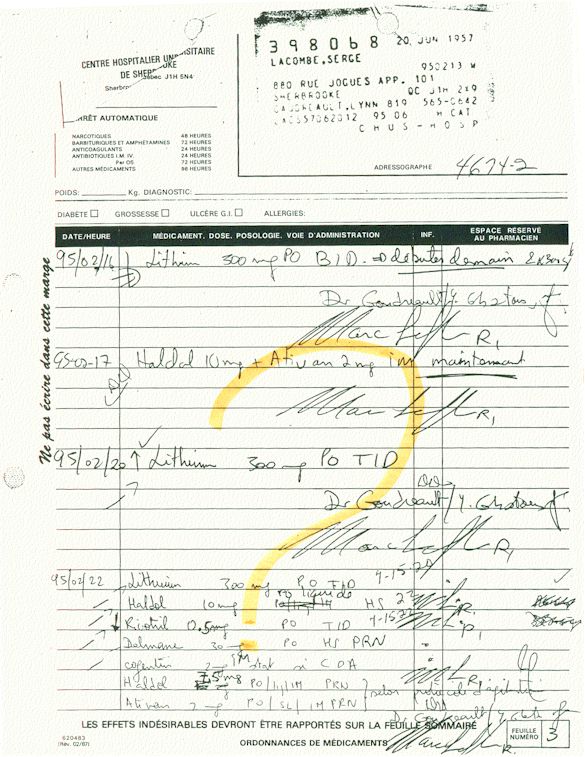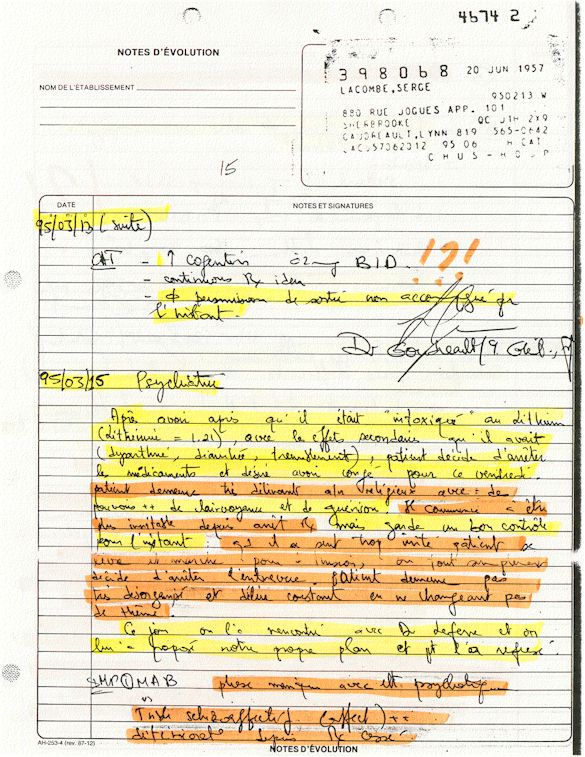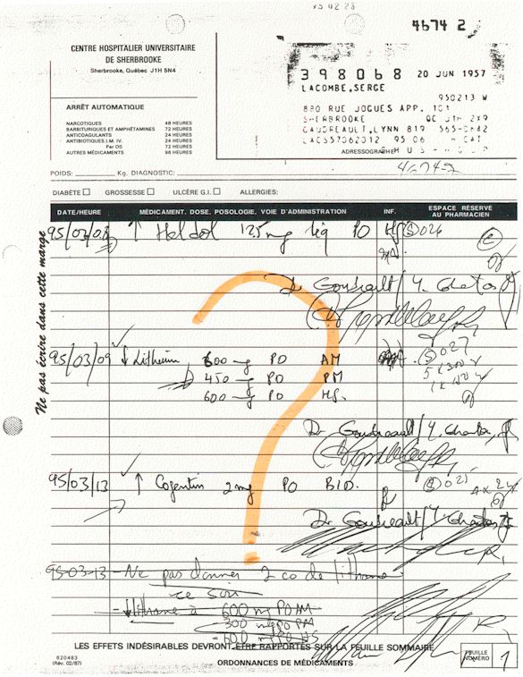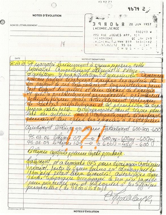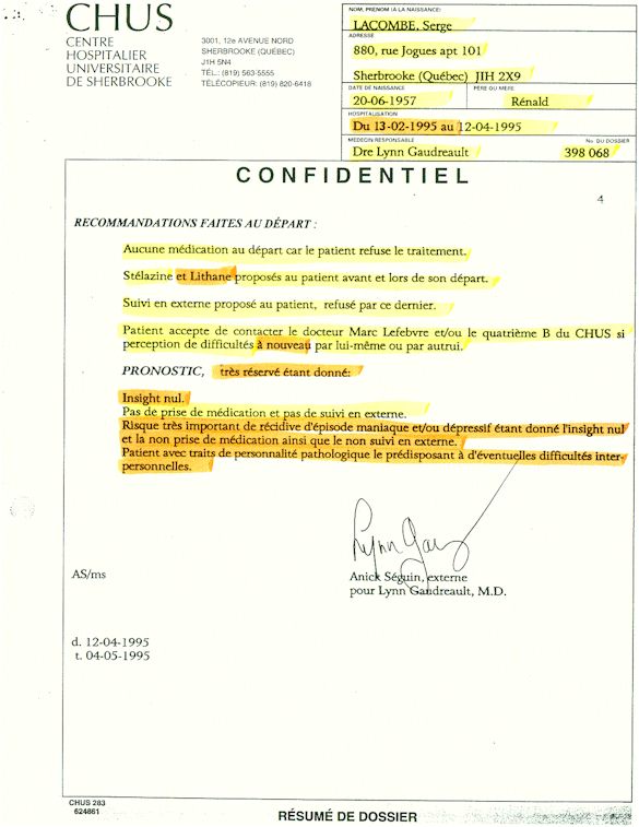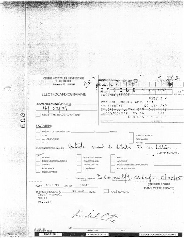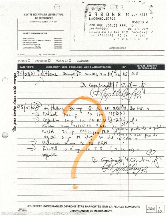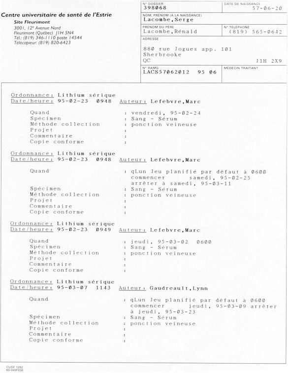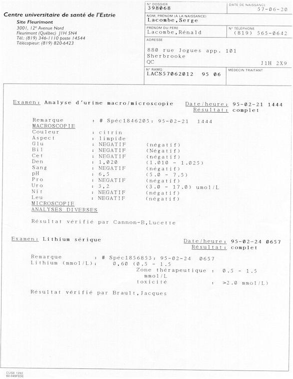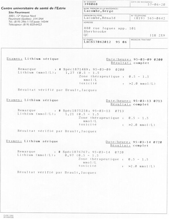 Analyse Sérique de Lithium - 270295 / 060395 - Lithium Seric Analysis Analyse Sérique de Lithium - 090395 / 140395 - Lithium Seric Analysis Analyse Sérique de Lithium - 150395 / 220395 - Lithium Seric Analysis Tension Artérielle, Changement de médecin et Congé - Blood Pressure, Doctor Changing and Departure Témoignage contre le CHUS de Bourassa-Lacombe sous serment lors de l’interrogatoire qui c'était tenu au Palais de Justice de Sherbrooke devant la COUR SUPÉRIEURE DU QUÉBEC 450-05-002521-983 soit les 25 & 30 novembre, 9 décembre 1998 & 9 décembre 2003. - Evidence counters CHUS of Bourassa-Lacombe under solemn promise during the cross-examination which it was kept in the Law courts of Sherbrooke before the court the UPPER OF QUEBEC 450-05-002521-983 am on November 25th and 30th, December 9th, 1998 and December 9th, 2003. -  Testimonio se opone él CHUS de Bourassa-Lacombe bajo juramento en el momento del interrogatorio que esto estaba obligado al Palacio de Justicia de Sherbrooke delante del SUPERIOR CORTE DE QUEBEC 450-05-002521-983 sea el 25 y 30 de noviembre, el 9 de diciembre de 1998 y 9 de diciembre de 2003.