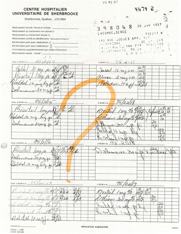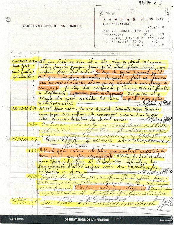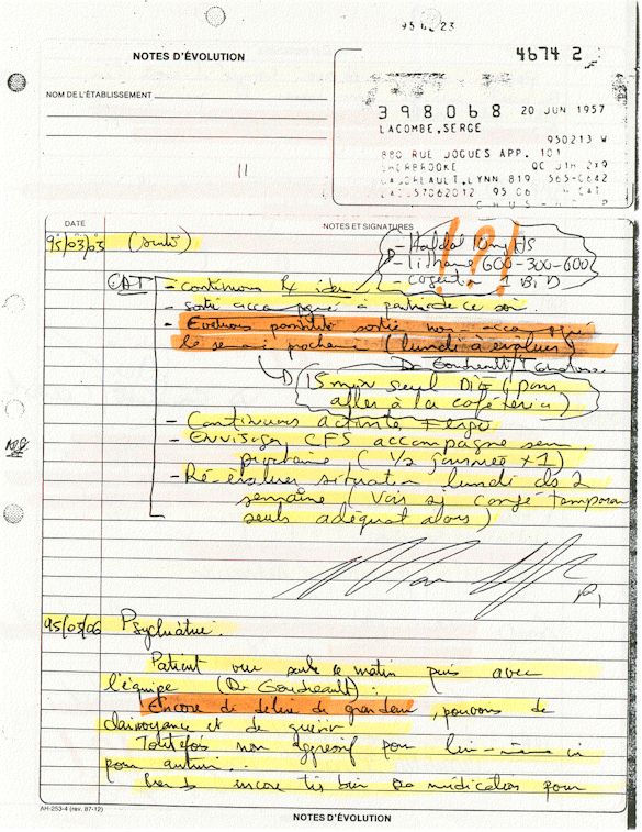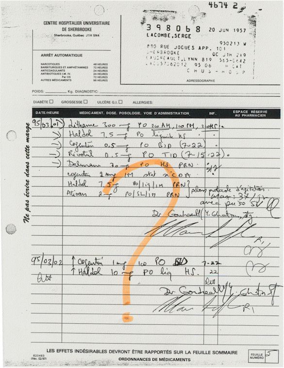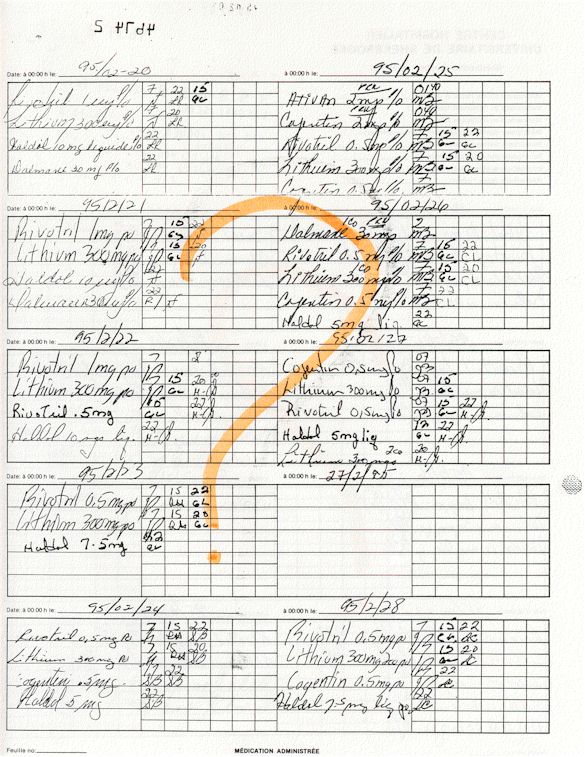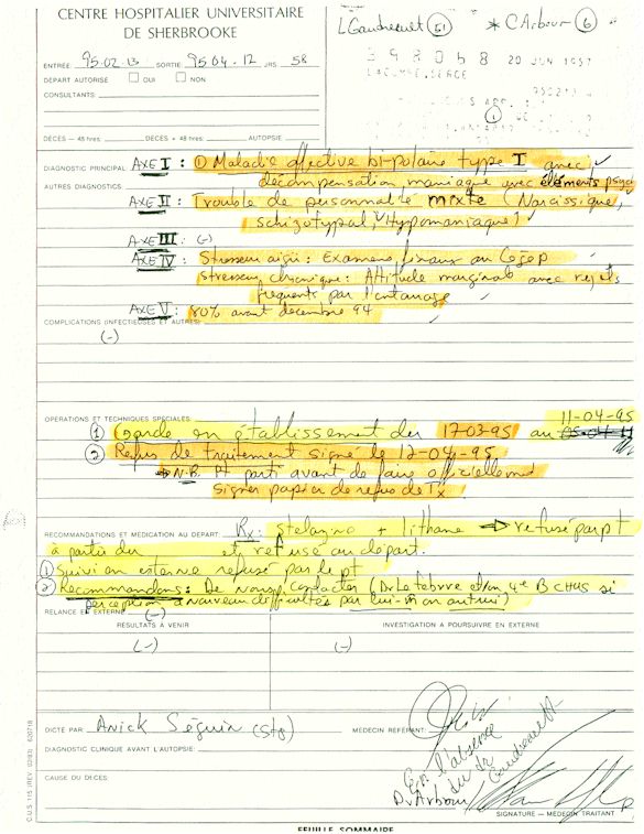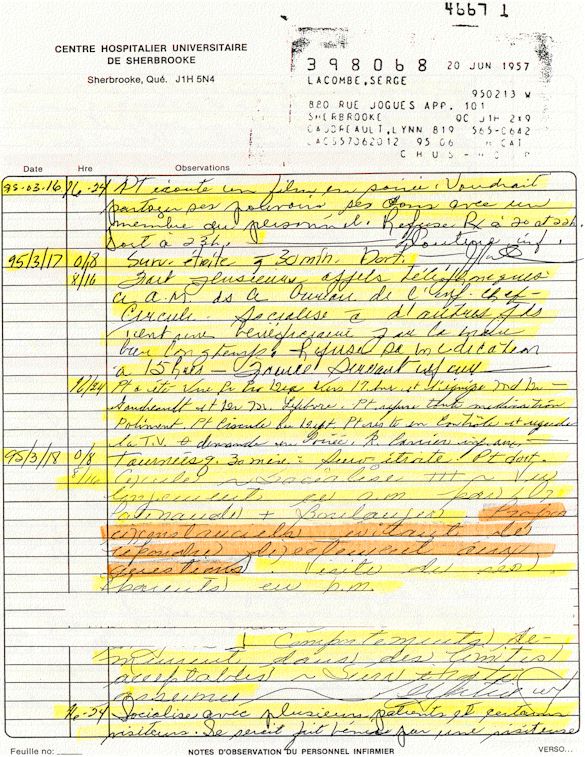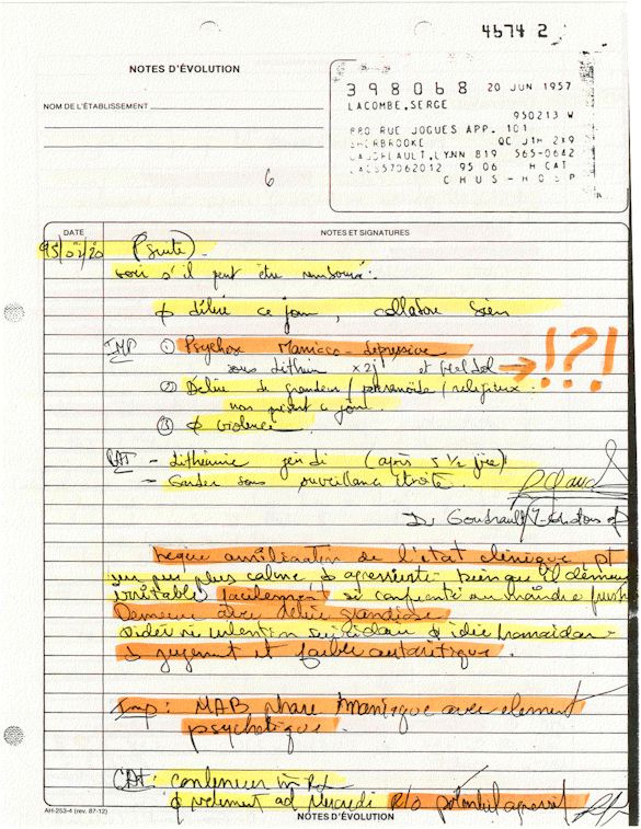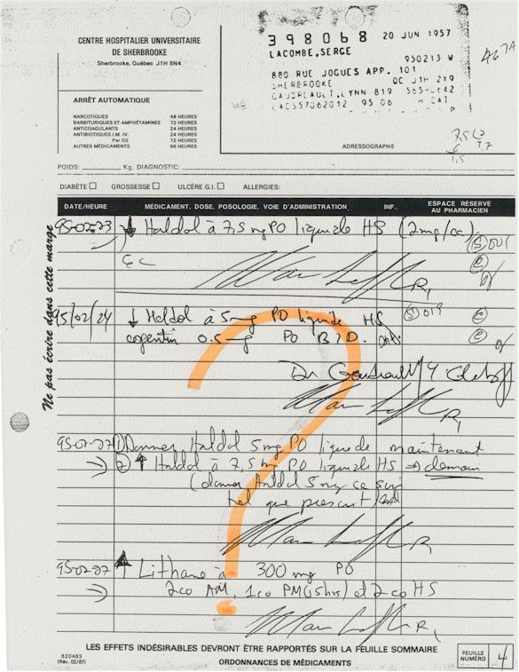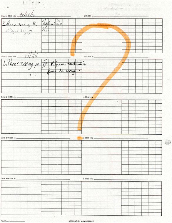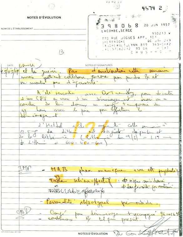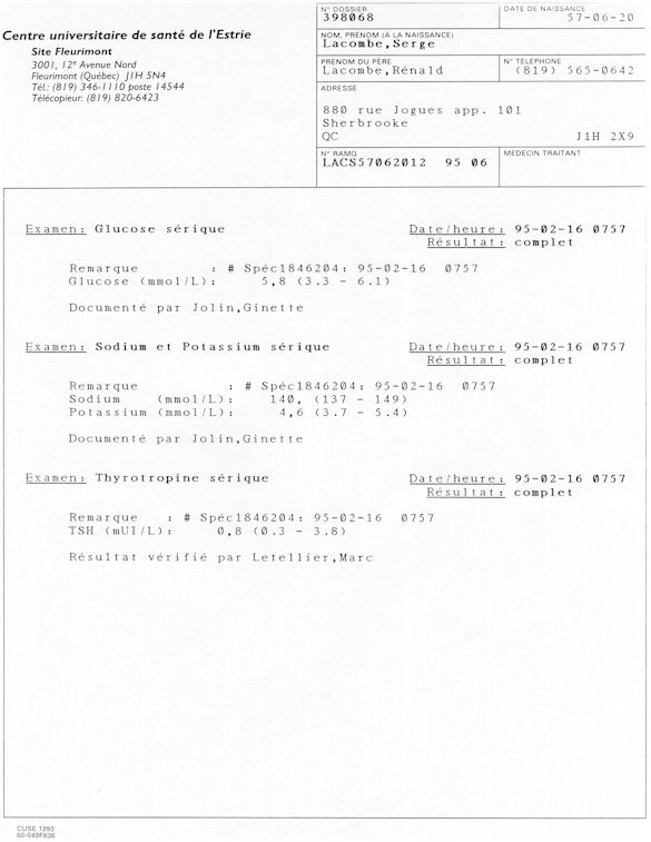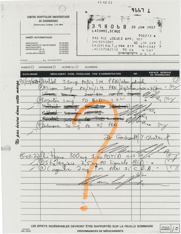 Analyse Sérique de Lithium - 270295 / 060395 - Lithium Seric Analysis Analyse Sérique de Lithium - 090395 / 140395 - Lithium Seric Analysis Analyse Sérique de Lithium - 150395 / 220395 - Lithium Seric Analysis Tension Artérielle, Changement de médecin et Congé - Blood Pressure, Doctor Changing and Departure Témoignage contre le CHUS de Bourassa-Lacombe sous serment lors de l’interrogatoire qui c'était tenu au Palais de Justice de Sherbrooke devant la COUR SUPÉRIEURE DU QUÉBEC 450-05-002521-983 soit les 25 & 30 novembre, 9 décembre 1998 & 9 décembre 2003. - Evidence counters CHUS of Bourassa-Lacombe under solemn promise during the cross-examination which it was kept in the Law courts of Sherbrooke before the court the UPPER OF QUEBEC 450-05-002521-983 am on November 25th and 30th, December 9th, 1998 and December 9th, 2003. -  Testimonio se opone él CHUS de Bourassa-Lacombe bajo juramento en el momento del interrogatorio que esto estaba obligado al Palacio de Justicia de Sherbrooke delante del SUPERIOR CORTE DE QUEBEC 450-05-002521-983 sea el 25 y 30 de noviembre, el 9 de diciembre de 1998 y 9 de diciembre de 2003.