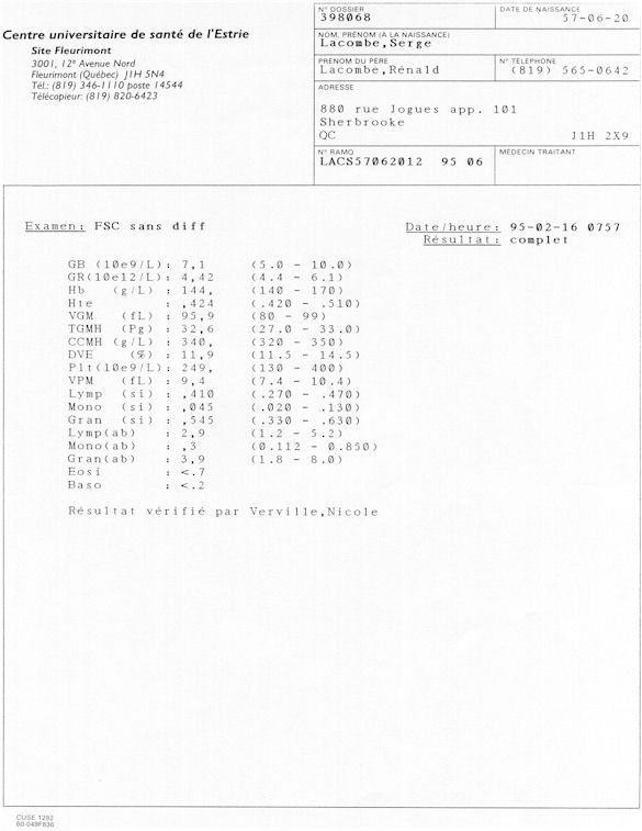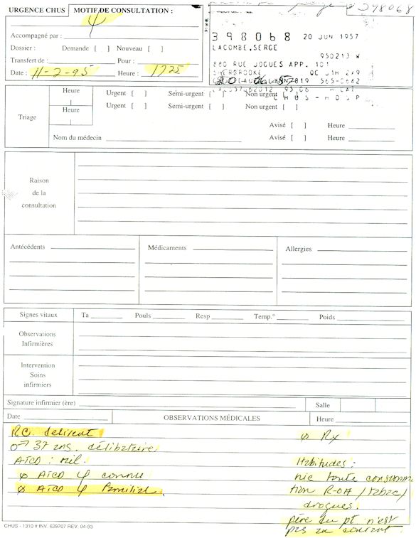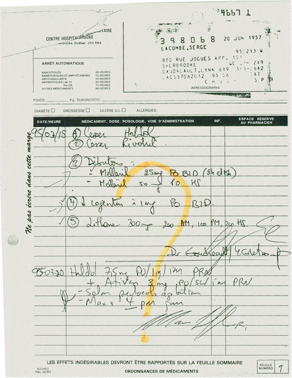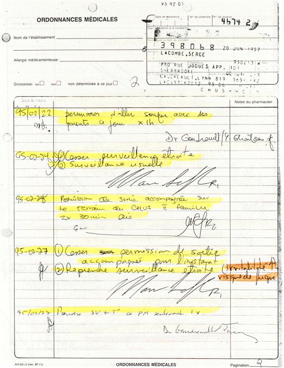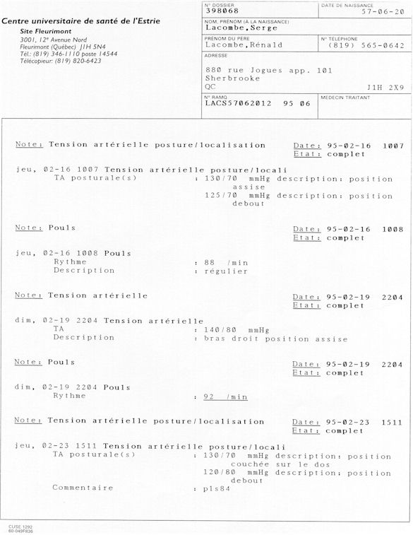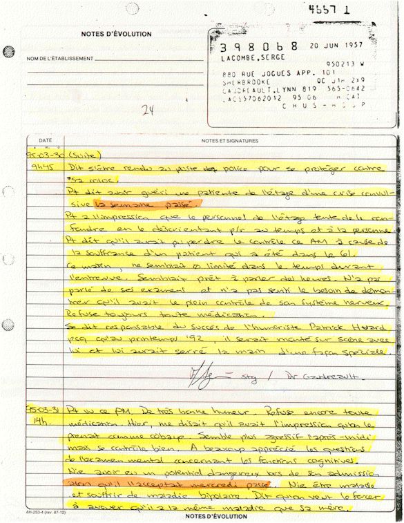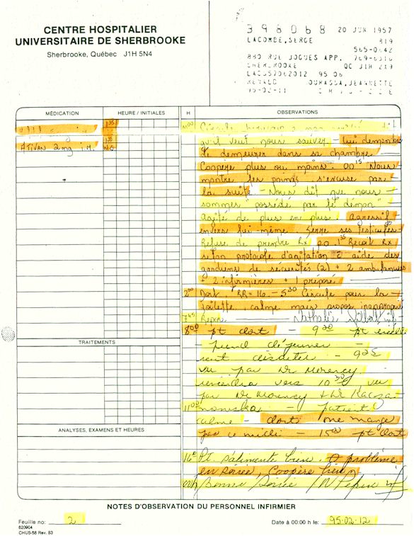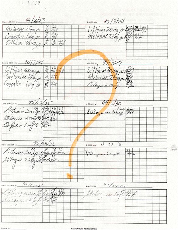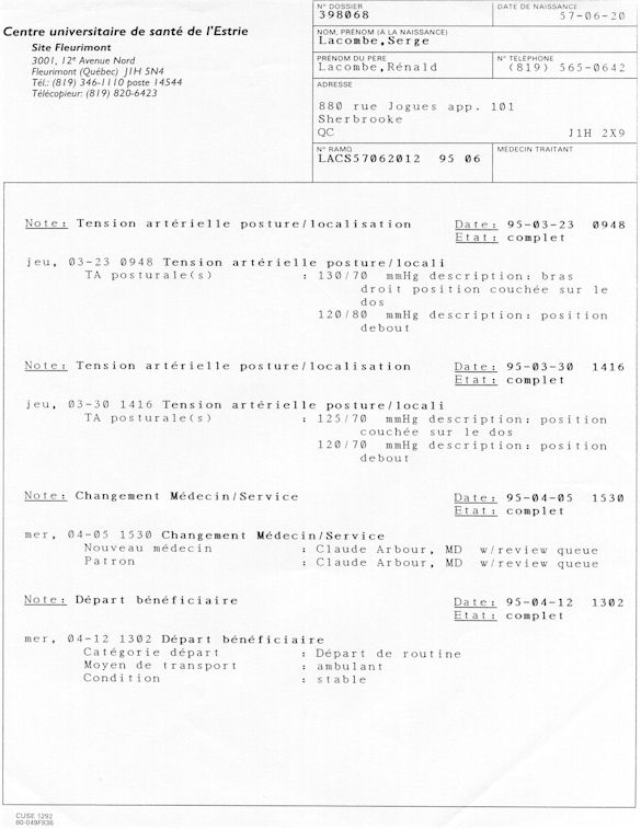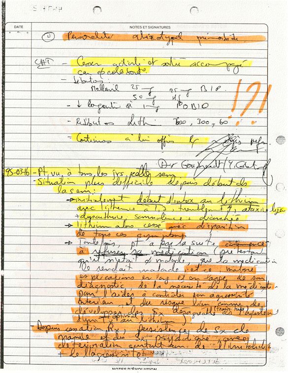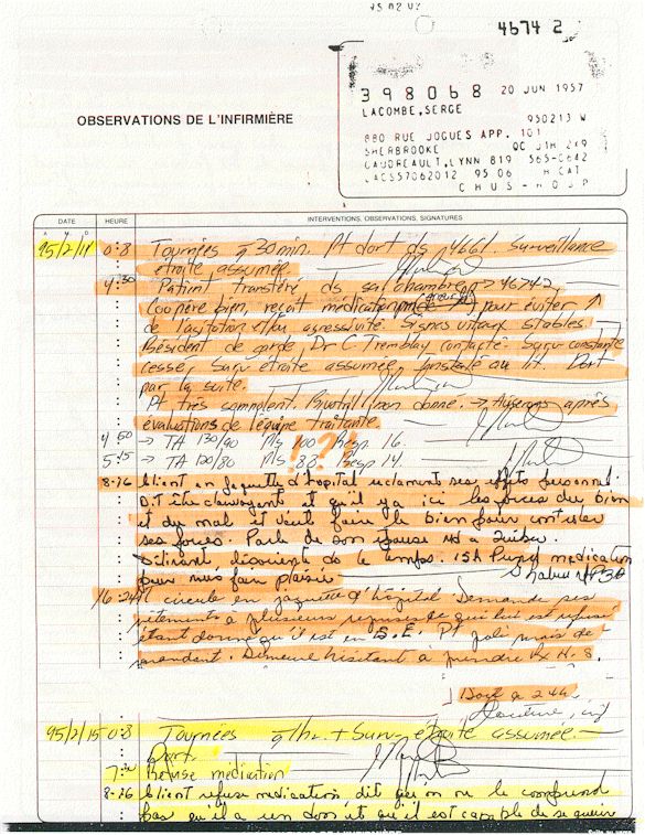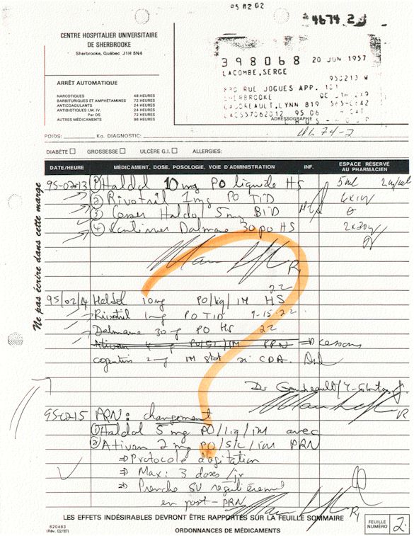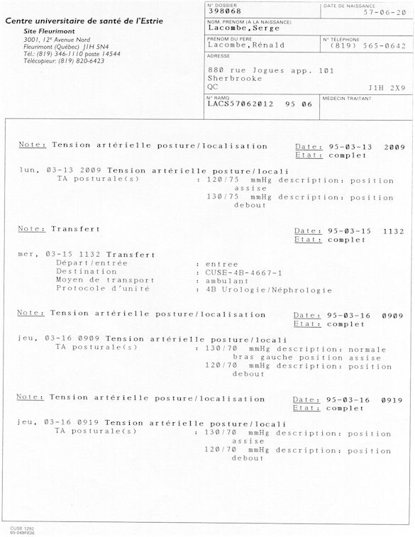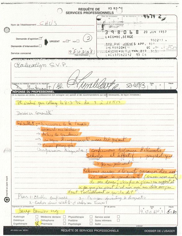 Analyse Sérique de Lithium - 270295 / 060395 - Lithium Seric Analysis Analyse Sérique de Lithium - 090395 / 140395 - Lithium Seric Analysis Analyse Sérique de Lithium - 150395 / 220395 - Lithium Seric Analysis Tension Artérielle, Changement de médecin et Congé - Blood Pressure, Doctor Changing and Departure Témoignage contre le CHUS de Bourassa-Lacombe sous serment lors de l’interrogatoire qui c'était tenu au Palais de Justice de Sherbrooke devant la COUR SUPÉRIEURE DU QUÉBEC 450-05-002521-983 soit les 25 & 30 novembre, 9 décembre 1998 & 9 décembre 2003. - Evidence counters CHUS of Bourassa-Lacombe under solemn promise during the cross-examination which it was kept in the Law courts of Sherbrooke before the court the UPPER OF QUEBEC 450-05-002521-983 am on November 25th and 30th, December 9th, 1998 and December 9th, 2003. -  Testimonio se opone él CHUS de Bourassa-Lacombe bajo juramento en el momento del interrogatorio que esto estaba obligado al Palacio de Justicia de Sherbrooke delante del SUPERIOR CORTE DE QUEBEC 450-05-002521-983 sea el 25 y 30 de noviembre, el 9 de diciembre de 1998 y 9 de diciembre de 2003.