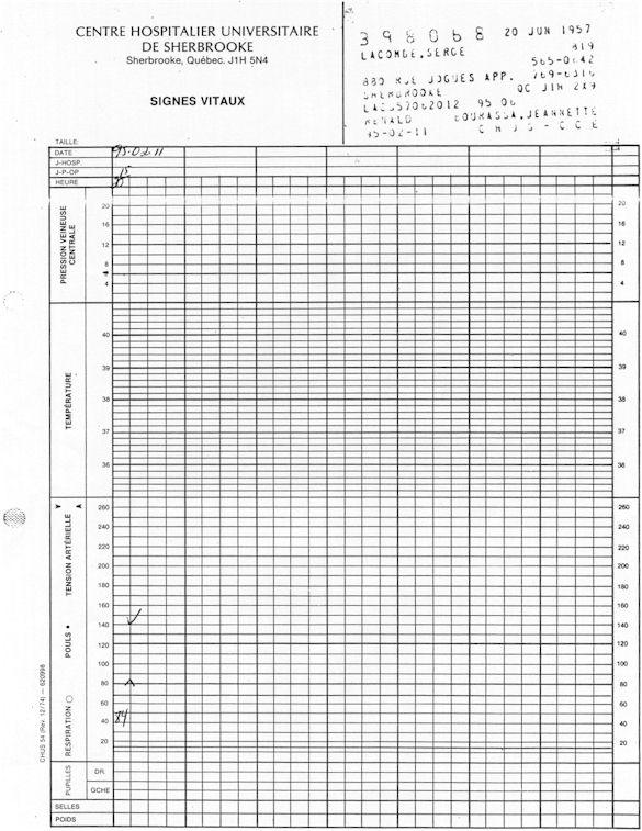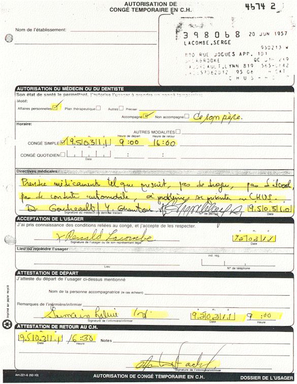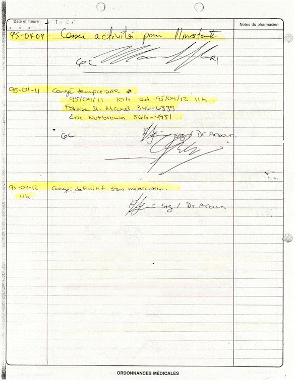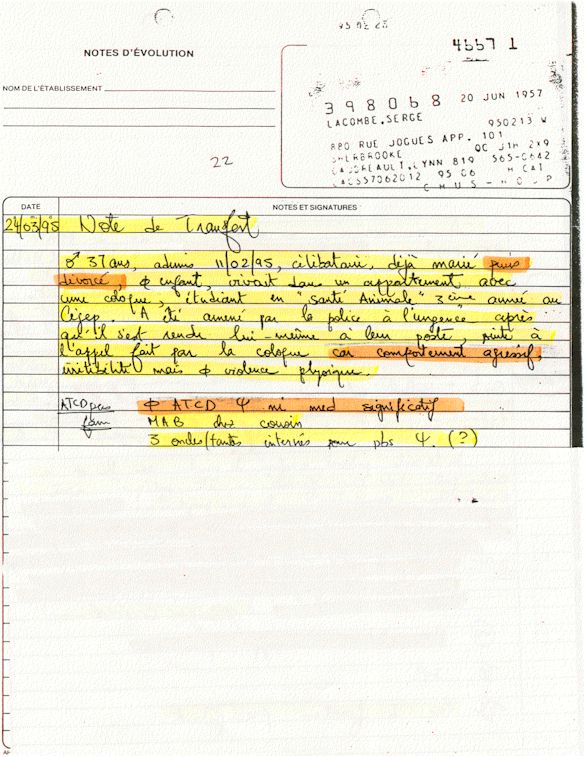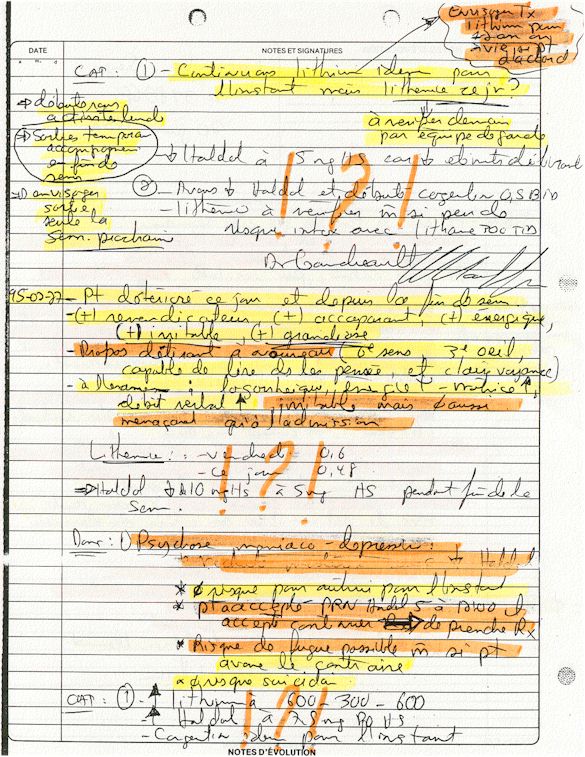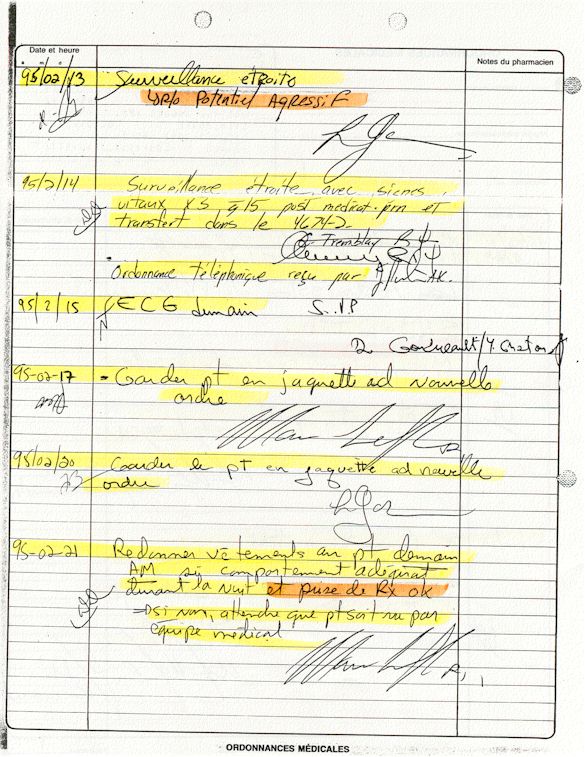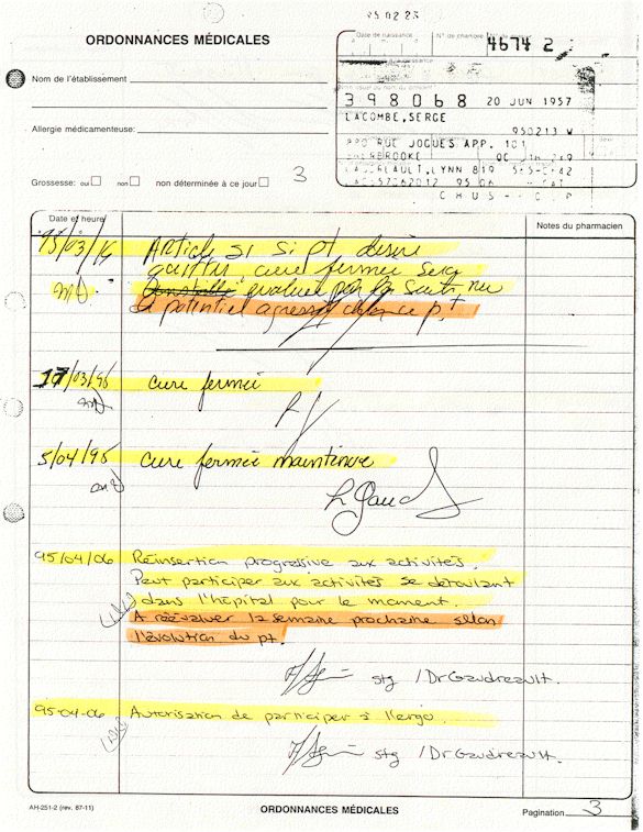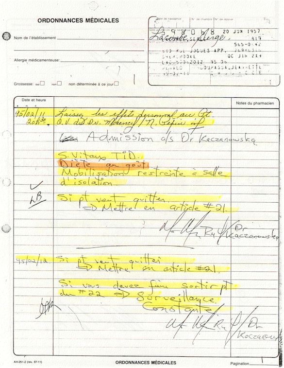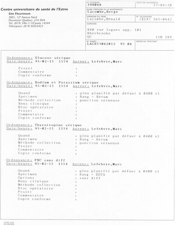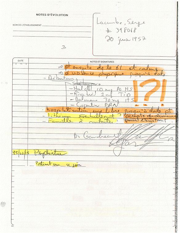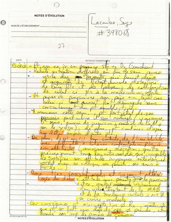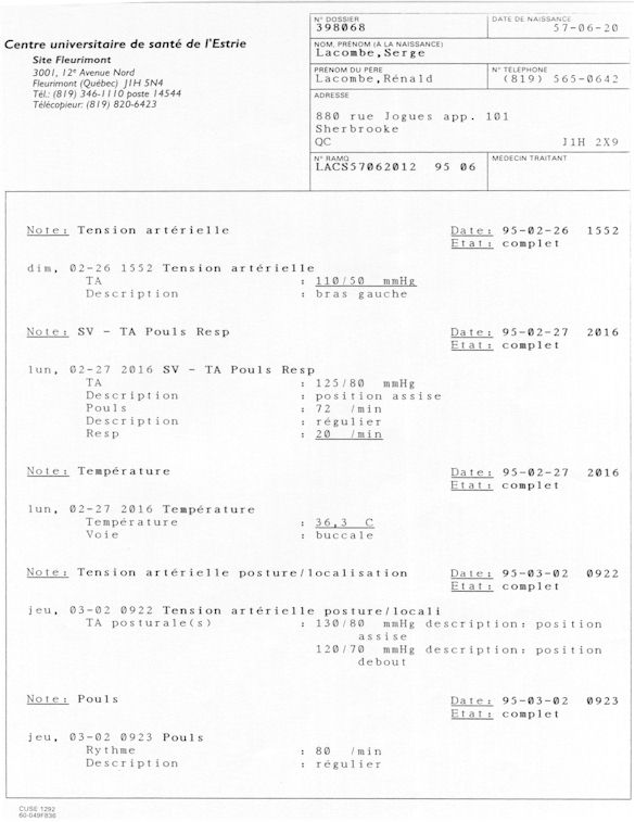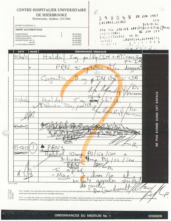 Analyse Sérique de Lithium - 270295 / 060395 - Lithium Seric Analysis Analyse Sérique de Lithium - 090395 / 140395 - Lithium Seric Analysis Analyse Sérique de Lithium - 150395 / 220395 - Lithium Seric Analysis Tension Artérielle, Changement de médecin et Congé - Blood Pressure, Doctor Changing and Departure Témoignage contre le CHUS de Bourassa-Lacombe sous serment lors de l’interrogatoire qui c'était tenu au Palais de Justice de Sherbrooke devant la COUR SUPÉRIEURE DU QUÉBEC 450-05-002521-983 soit les 25 & 30 novembre, 9 décembre 1998 & 9 décembre 2003. - Evidence counters CHUS of Bourassa-Lacombe under solemn promise during the cross-examination which it was kept in the Law courts of Sherbrooke before the court the UPPER OF QUEBEC 450-05-002521-983 am on November 25th and 30th, December 9th, 1998 and December 9th, 2003. -  Testimonio se opone él CHUS de Bourassa-Lacombe bajo juramento en el momento del interrogatorio que esto estaba obligado al Palacio de Justicia de Sherbrooke delante del SUPERIOR CORTE DE QUEBEC 450-05-002521-983 sea el 25 y 30 de noviembre, el 9 de diciembre de 1998 y 9 de diciembre de 2003.