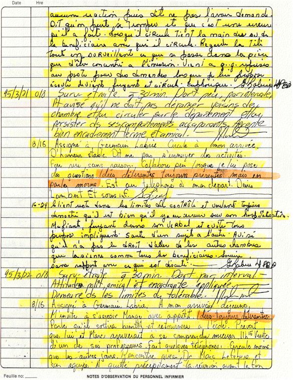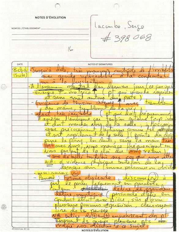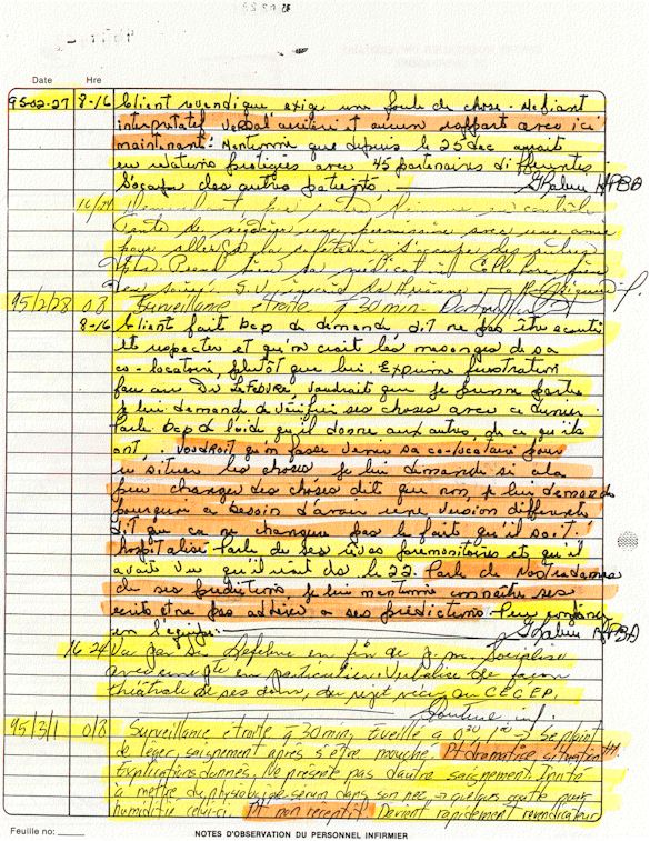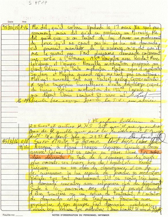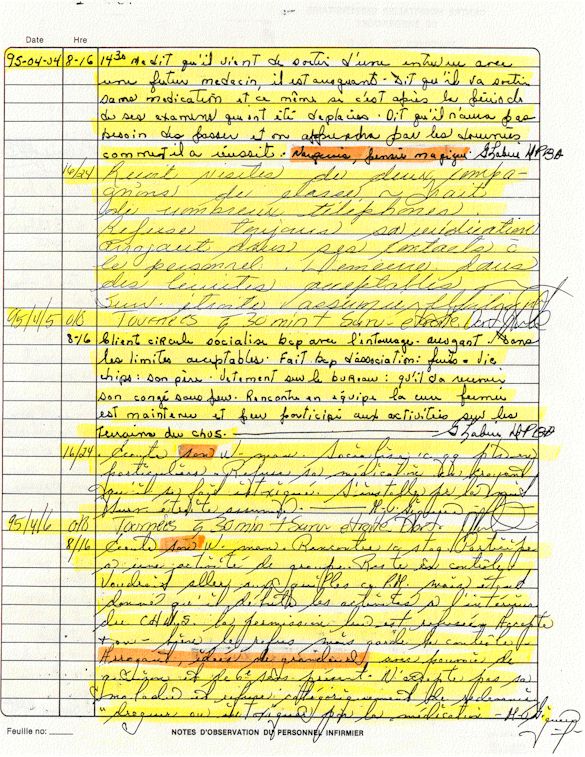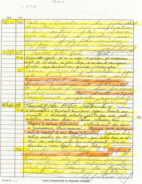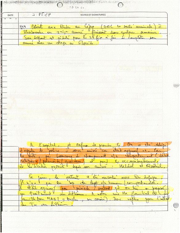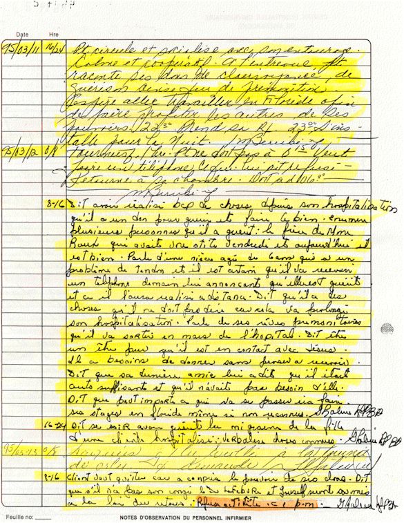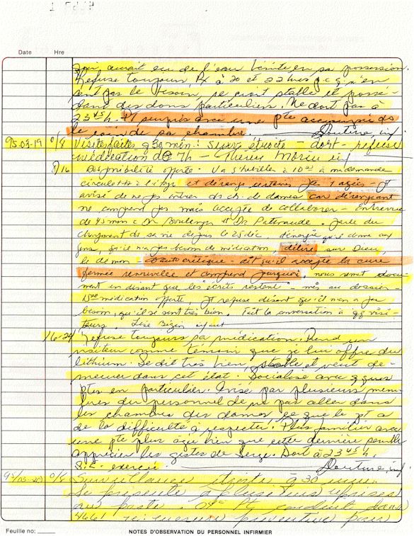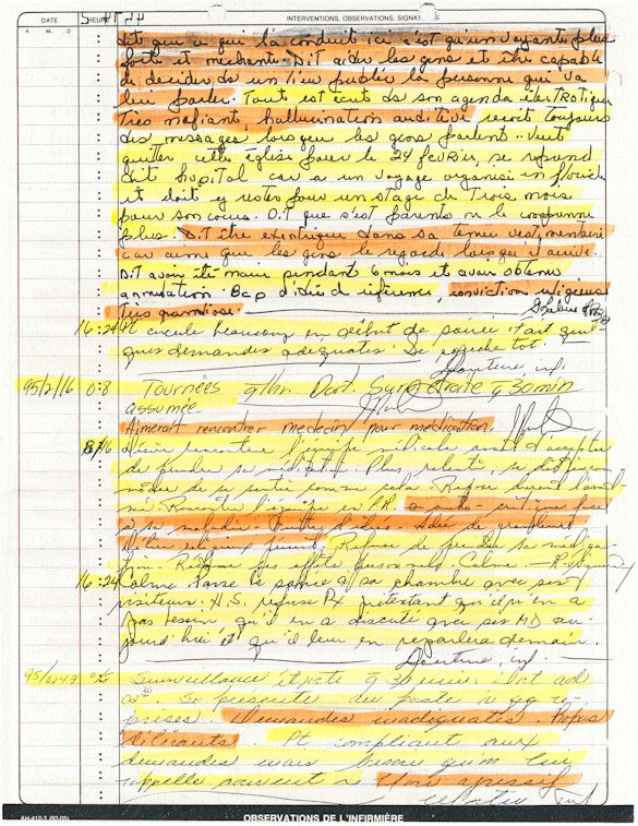 Observation de l'Infirmière - 16a - Observation of the Nurse Régistre de la Salle d'Urgence - Register of the Emergency Room Évaluation Admission Psychiatrie - Psychiatric Admission Evaluation Électrocardiogramme - Electrocardiogram Électrocardiogramme - Electrocardiogram