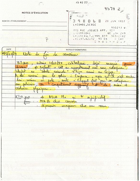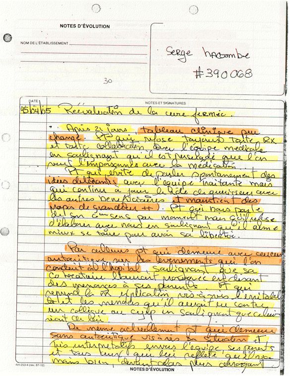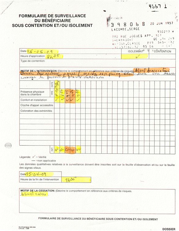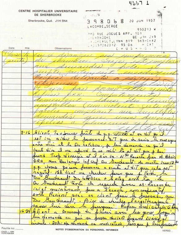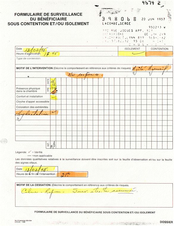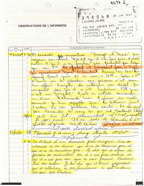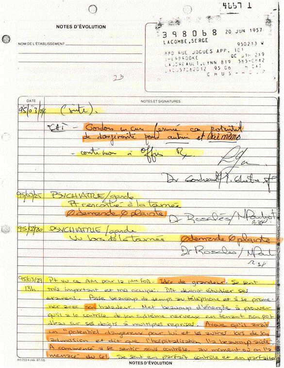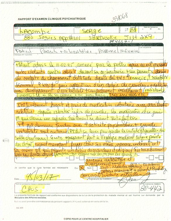 Comprenden ahora porqué desde el mes de abril de 1995, pido a los que lo controlen que una investigación pública esté instituida en el mundo médico psiquiátrico con el fin de salvar: vidas humanas. Sobre todo teniendo en cuenta que me acuerdo de vivir el muy después de haber sido decidido a raíz de un error de antecedentes judiciales y haber sido encarcelado a pesar mío en el Centro Hospitalario Universitario de Sherbrooke (CHUS/CUSE) sin resolución de tribunal durante 57 días, es también en este hospital que se torturó químicamente durante 31 días. Me acuerdo de vivir también en el Centro Hospitalario de Verdun (CHA) la tarde 18 y de la noche del 19 de julio 1995. luego 434 días de exilio en exterior de Quebec incluidos 388 días en los Estados Unidos. Me acuerdo de vivir 26 días de prisión incluidos ocho días al instituto Philip Pinel de Montreal.