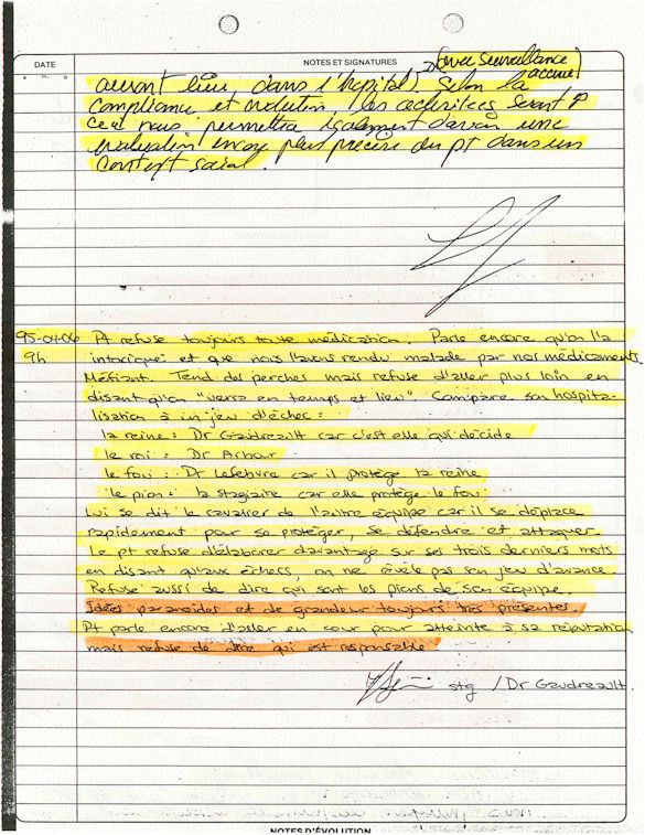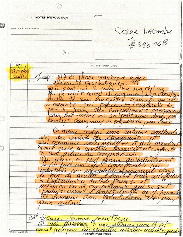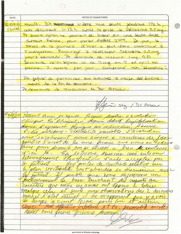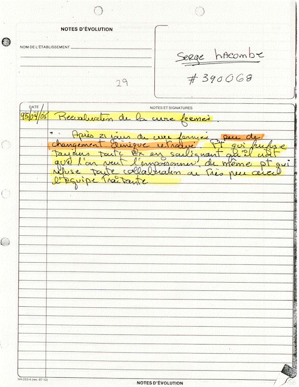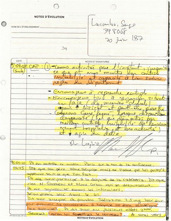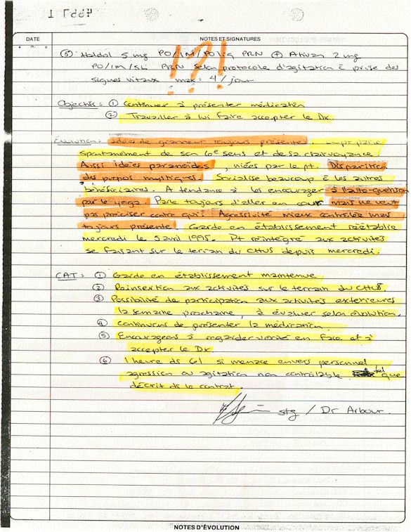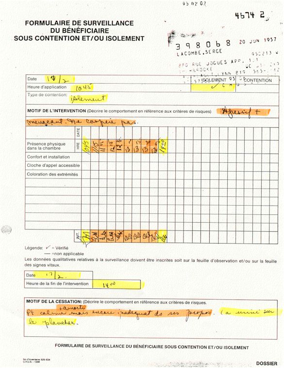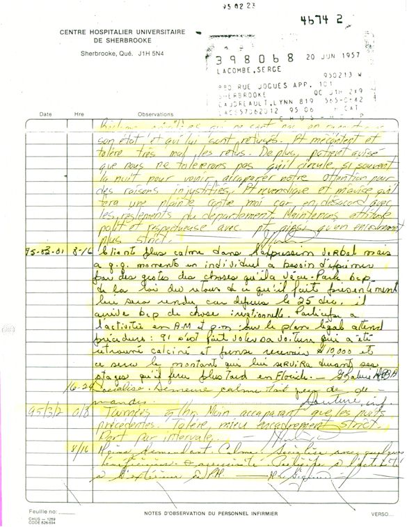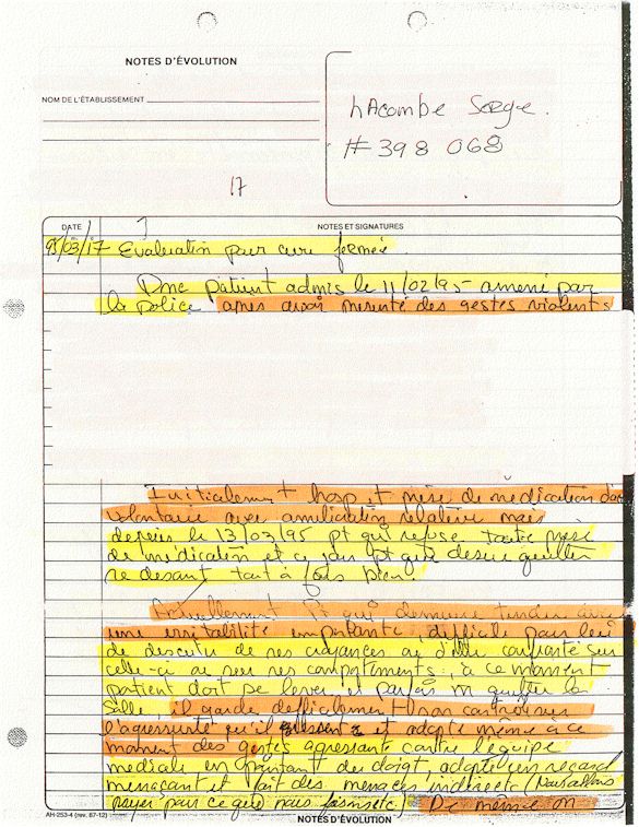 Comprenden ahora porqué desde el mes de abril de 1995, pido a los que lo controlen que una investigación pública esté instituida en el mundo médico psiquiátrico con el fin de salvar: vidas humanas. Sobre todo teniendo en cuenta que me acuerdo de vivir el muy después de haber sido decidido a raíz de un error de antecedentes judiciales y haber sido encarcelado a pesar mío en el Centro Hospitalario Universitario de Sherbrooke (CHUS/CUSE) sin resolución de tribunal durante 57 días, es también en este hospital que se torturó químicamente durante 31 días. Me acuerdo de vivir también en el Centro Hospitalario de Verdun (CHA) la tarde 18 y de la noche del 19 de julio 1995. luego 434 días de exilio en exterior de Quebec incluidos 388 días en los Estados Unidos. Me acuerdo de vivir 26 días de prisión incluidos ocho días al instituto Philip Pinel de Montreal.