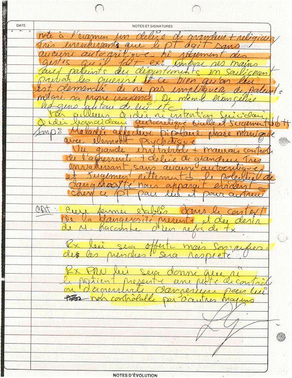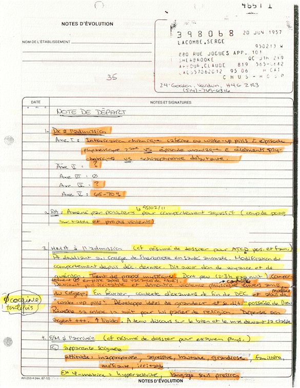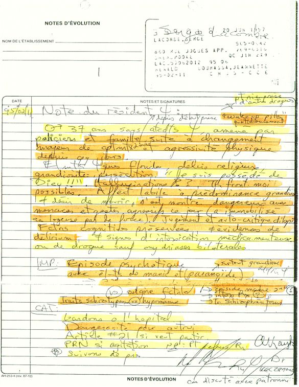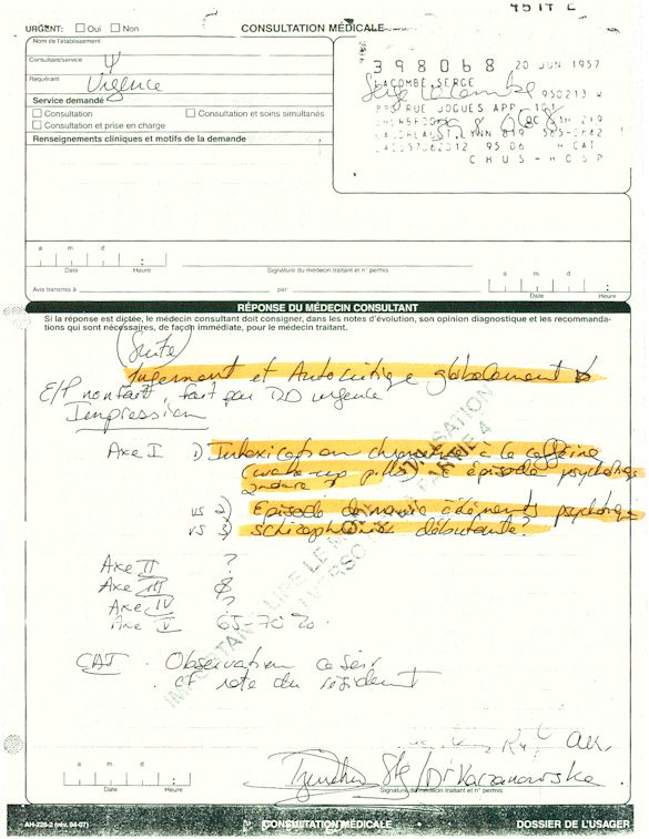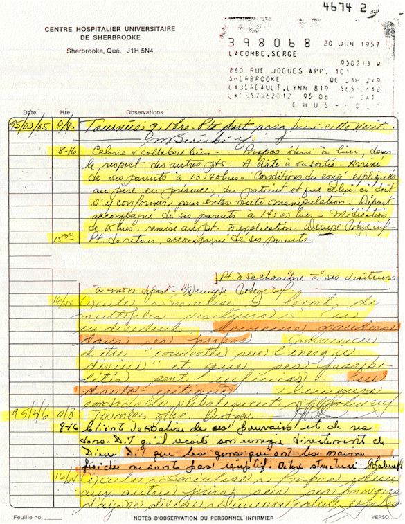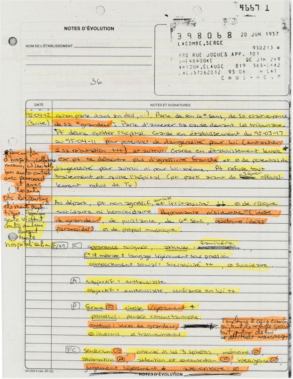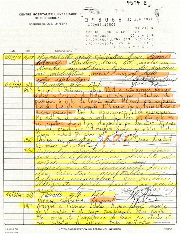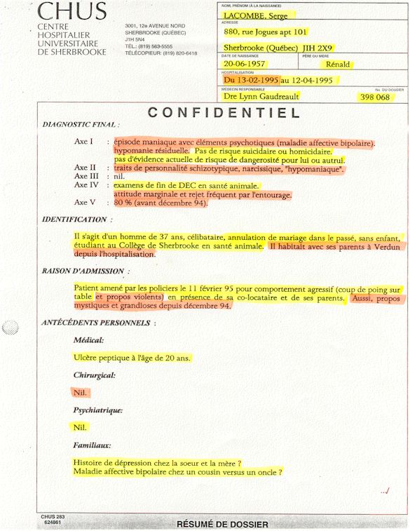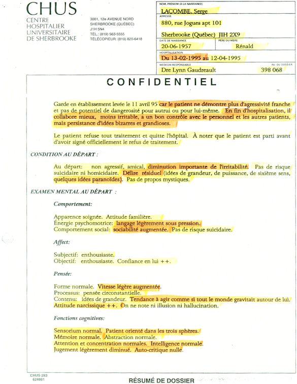 Ce dossier médical doit alors obligatoirement perdre sa teneur confidentiel. C'est pour cette raison qu'aujourd'hui, je prends la décision devant DIEU et devant les hommes de rendre publique le contenu intégral de mon dossier médical «CHUS 398068» afin de venir en aide à tous ceux qui souffrent de maladies mentales légales et/ou illégales. De plus, je tiens que la divulgation de ce dossier qui est le mien soit en hommage à tous ceux qui sont mort d'une dose létale de drogues légales.