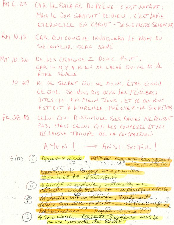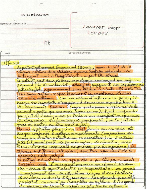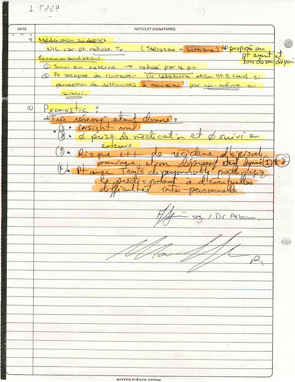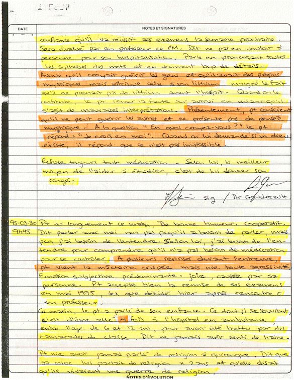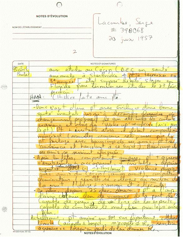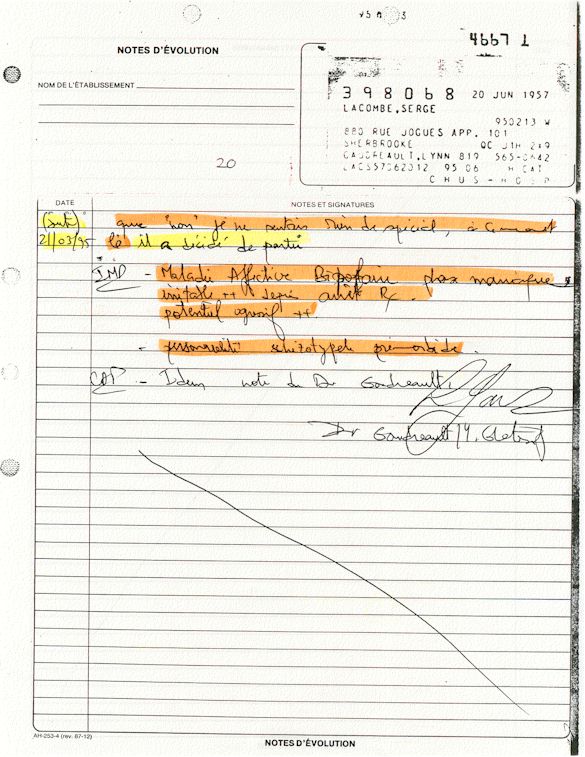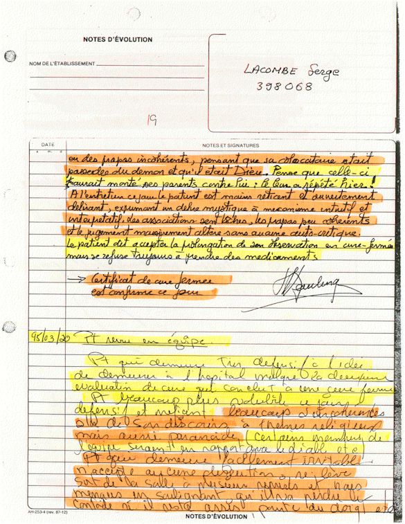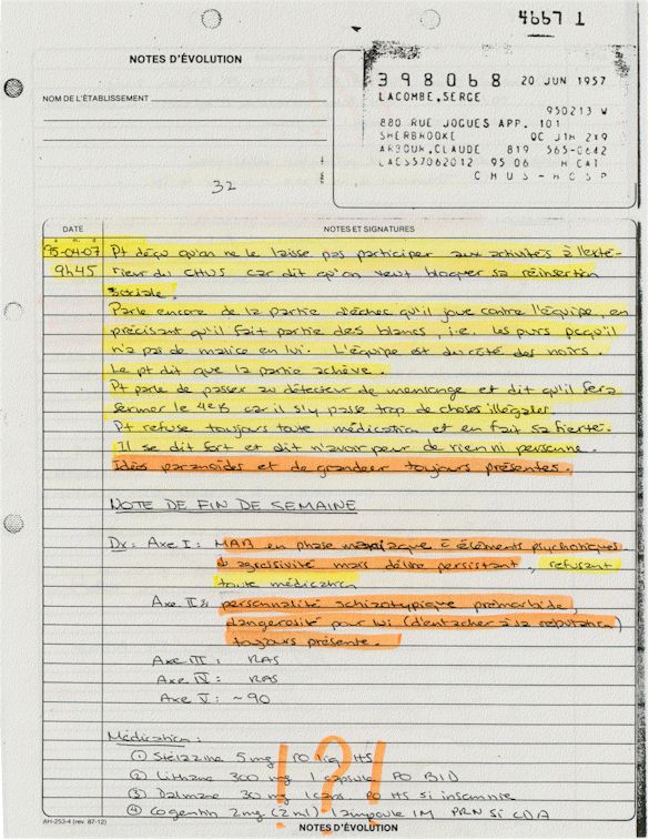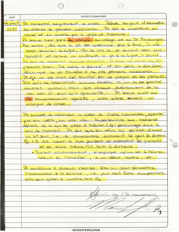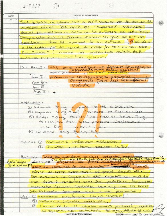 Ce dossier médical doit alors obligatoirement perdre sa teneur confidentiel. C'est pour cette raison qu'aujourd'hui, je prends la décision devant DIEU et devant les hommes de rendre publique le contenu intégral de mon dossier médical «CHUS 398068» afin de venir en aide à tous ceux qui souffrent de maladies mentales légales et/ou illégales. De plus, je tiens que la divulgation de ce dossier qui est le mien soit en hommage à tous ceux qui sont mort d'une dose létale de drogues légales.