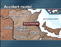 Un accident survenu dimanche matin dans la région de Bouctouche, au Nouveau-Brunswick, a fait quatre morts. Les trois hommes et la femme, tous âgés dans la vingtaine, se trouvaient dans le même véhicule qui a fait une violente embardée sur la route 515. Selon les premières constatations, la vitesse excessive semble être à l'origine de la tragédie. L'identité des victimes n'a pas été divulguée, mais on sait qu'elles sont toutes de la région de Kent. Copyright © 1998-2003 Groupe TVA inc. - Tout droits réservés |