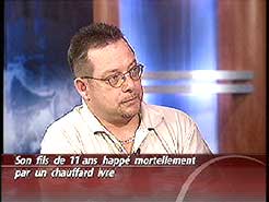 À Valleyfield, le père de Benoît Dupras, ce garçon de 11 ans tué par un récidiviste de l'alcool au volant, entame une campagne contre les chauffards. Selon Mario Dupras, la mort de son fils doit dissuader les automobilistes de conduire en état d'ébriété. Il promet d'ailleurs de s'en charger personnellement en surveillant lui-même les environs des bars de Valleyfield. M. Dupras a acheté un véhicule et compte l'identifier comme une voiture de patrouille en y apposant l'inscription: «L'alcool au volant tue». Le père de Benoît se dit incapable de pardonner à Yvon Arsenault, responsable de la mort de son fils. «Le curé à l'église m'a demandé mon pardon... je ne suis pas capable...» En vidéo, Georges Pothier s'entretient avec Mario Dupras. Copyright © 1998-2003 Groupe TVA inc. - Tout droits réservés |