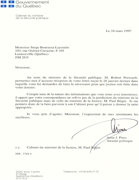 Monsieur, Au nom du ministre de la Sécurité publique, M. Robert Perreault, permettez-moi d'accuser réception de votre lettre reçue le 28 janvier dernier dans laquelle vous lui demandez de faire le nécessaire pour que justice soit faite dans votre dossier. Compte tenu de la nature des informations que vous nous avez transmises, il appert que votre correspondance ne relève pas de la juridiction du ministre de la Sécurité publique mais de celle du ministre de la Justice, M. Paul Bégin. Je me permets donc de la faire parvenir à son Cabinet pour qu'il puisse y donner la suite appropriée. Je vous prie d'agréer, Monsieur, l'expression de mes sentiments les meilleurs.