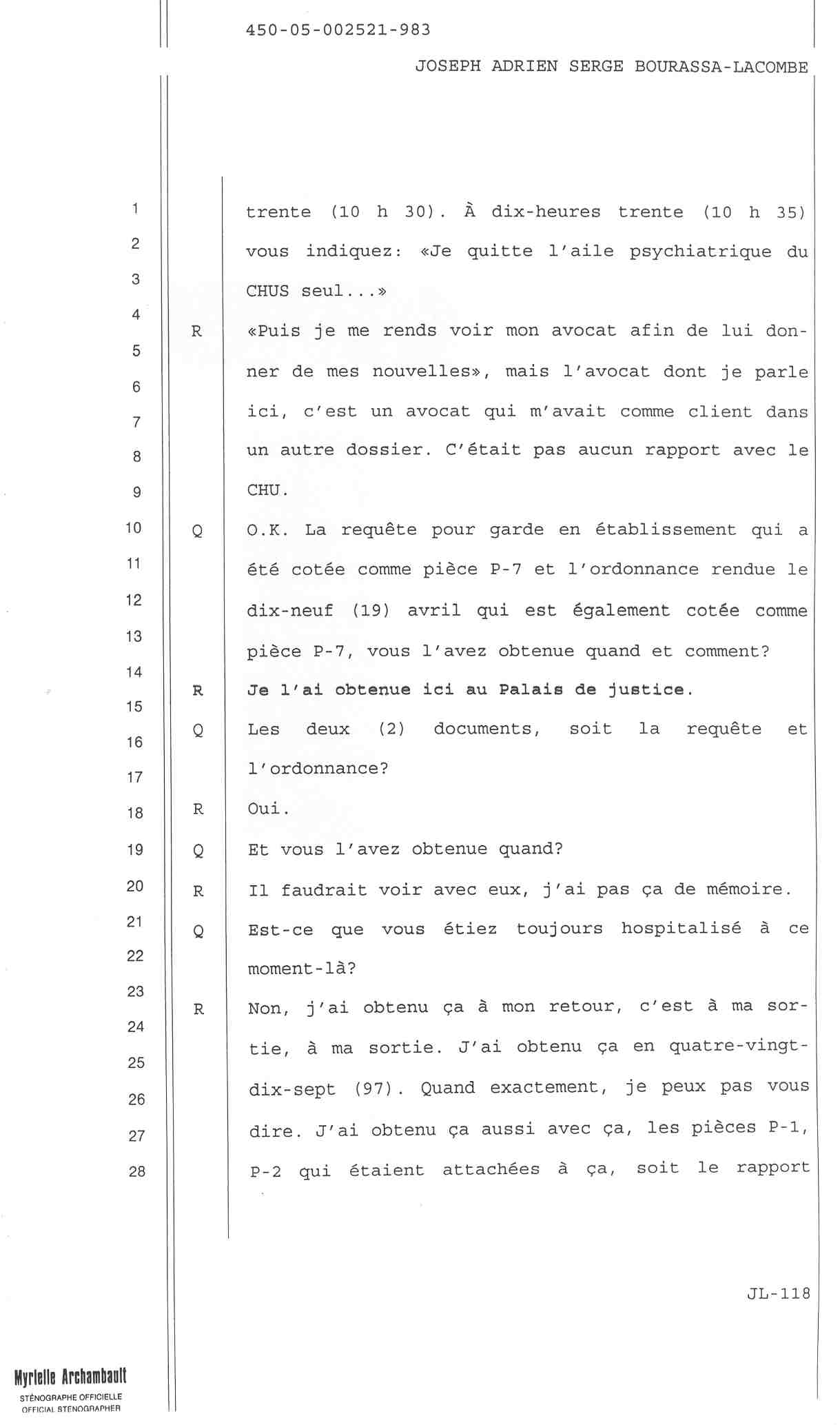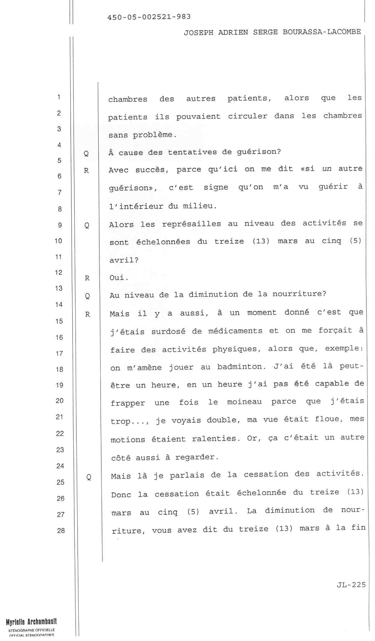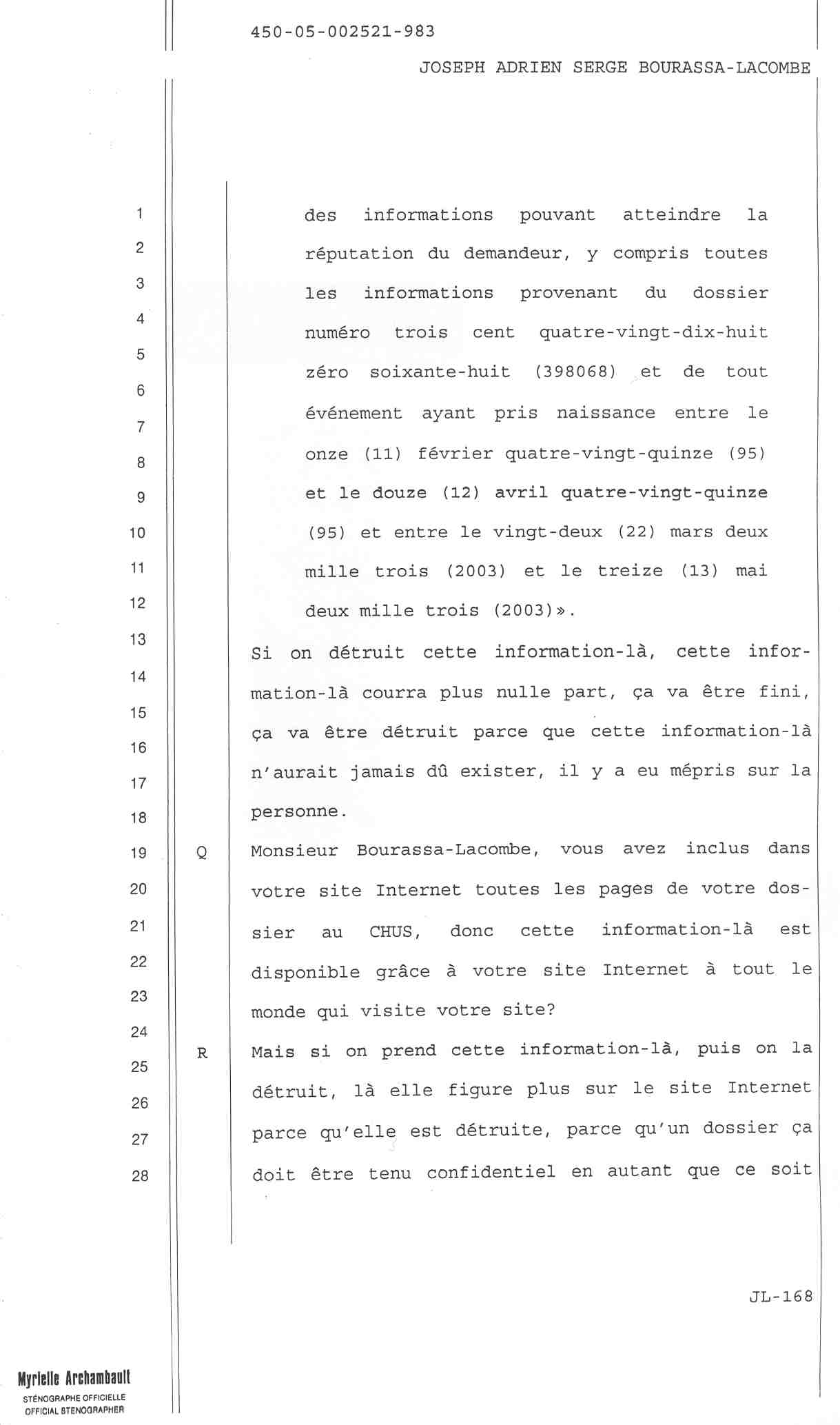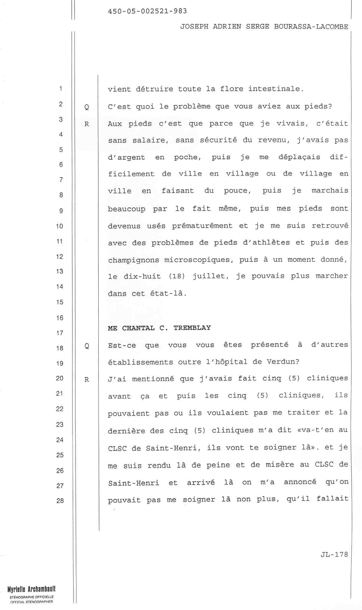EN MÉMOIRE DU 04 JUILLET 1996 LORSQUE JE VIVAIS EN EXILE ET À LA QUÊTE DE MA PROPRE NOURRITURE, J'AI EFFECTUÉ UNE LIVRAISON SPÉCIALE AU XXVIE CONGRÈS INTERNATIONAL DE DROIT ET DE SANTÉ MENTALE QUI C'EST DÉROULÉ À MONTRÉAL DU 4 AU 6 JUILLET 2001 À L'ATTENTION DU DR PAUL-ANDRÉ LAFLEUR, DG DE L'INSTITUT PHILIPPE PINEL DE MONTRÉAL. J'AI DÉPOSÉ COMME OFFRANDE, 800 CARTES D'AFFAIRES DE LA FONDATION SERGE BOURASSA-LACOMBE SOIT UNE CARTE POUR CHAQUE CONGRESSISTE ATTENDU À CE CONGRÈS, 1 KILOGRAMME DE FILET DE SOLE POURRI ET 3 MORCEAUX DE GÂTEAU DES ANGES POUR QUE LE DR LAFLEUR UN DES ORGANISATEURS DE L'ÉVÉNEMENT COMPRENNE QU'IL AURAIT MIEUX VALU AU NOM DES DROITS DE L'HOMME ET DE LA SANTÉ MENTALE D'INVITER LA FONDATION SERGE BOURASSA-LACOMBE AFIN QUE LES CONGRESSISTES PUISSENT BÉNÉFICIER DE L'EXPERTISE SPÉCIALISÉE EN SANTÉ MENTALE DE SON PRÉSIDENT AFIN DE VOIR UNE DIMINUTION DE LA CRIMINALITÉ, DE RÉCIDIVE CRIMINELLE ET DE SUICIDE POUR CONSTRUIRE UN PAYS MEILLEUR. IL FAUT QUE VOUS SACHIEZ QUE CETTE MISSION SERA IMPOSSIBLE, TANT QU'IL N'Y AURA PAS DE REPENTANCE FAITE À MON ENDROIT DANS LES DOSSIERS MÉDICAUX DU : CENTRE HOSPITALIER UNIVERSITAIRE DE SHERBROOKE, DU CENTRE HOSPITALIER DE VERDUN, DU CENTRE HOSPITALIER DE ST. MARY ET DE L'INSTITUT PHILIPPE PINEL DE MONTRÉAL. AUSSI POUR AVOIR MULTIPLIÉ LES ACTIONS CRIMINELLES DIRIGÉES CONTRE MA PERSONNE EN AGISSANT SANS JUGEMENT DE LA COUR, DE M'AVOIR LAISSER VIVRE SANS ABRI ET SANS NOURRITURE PENDANT PLUS DE TROIS ANS.