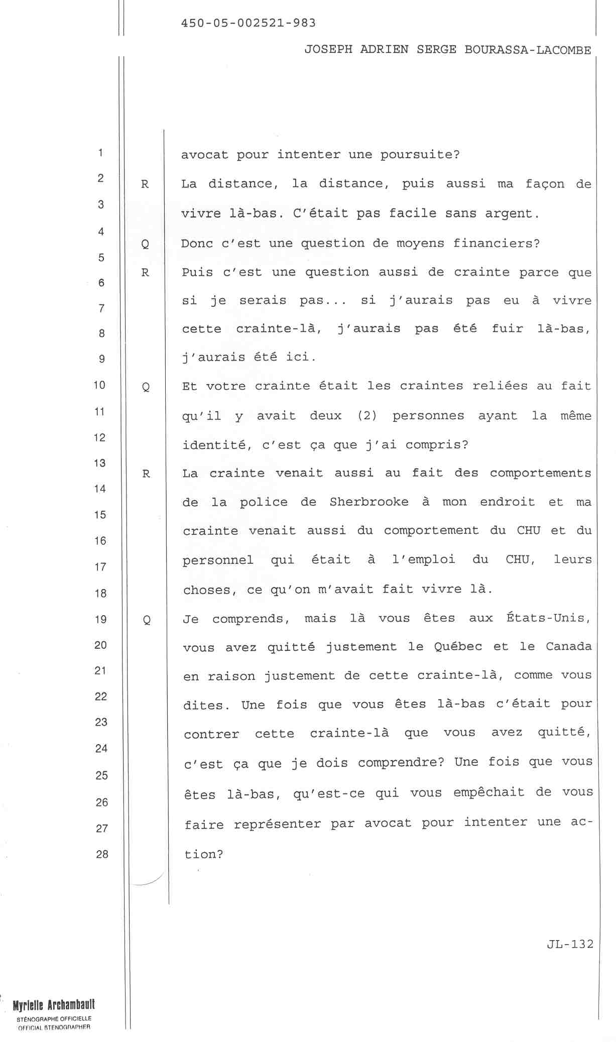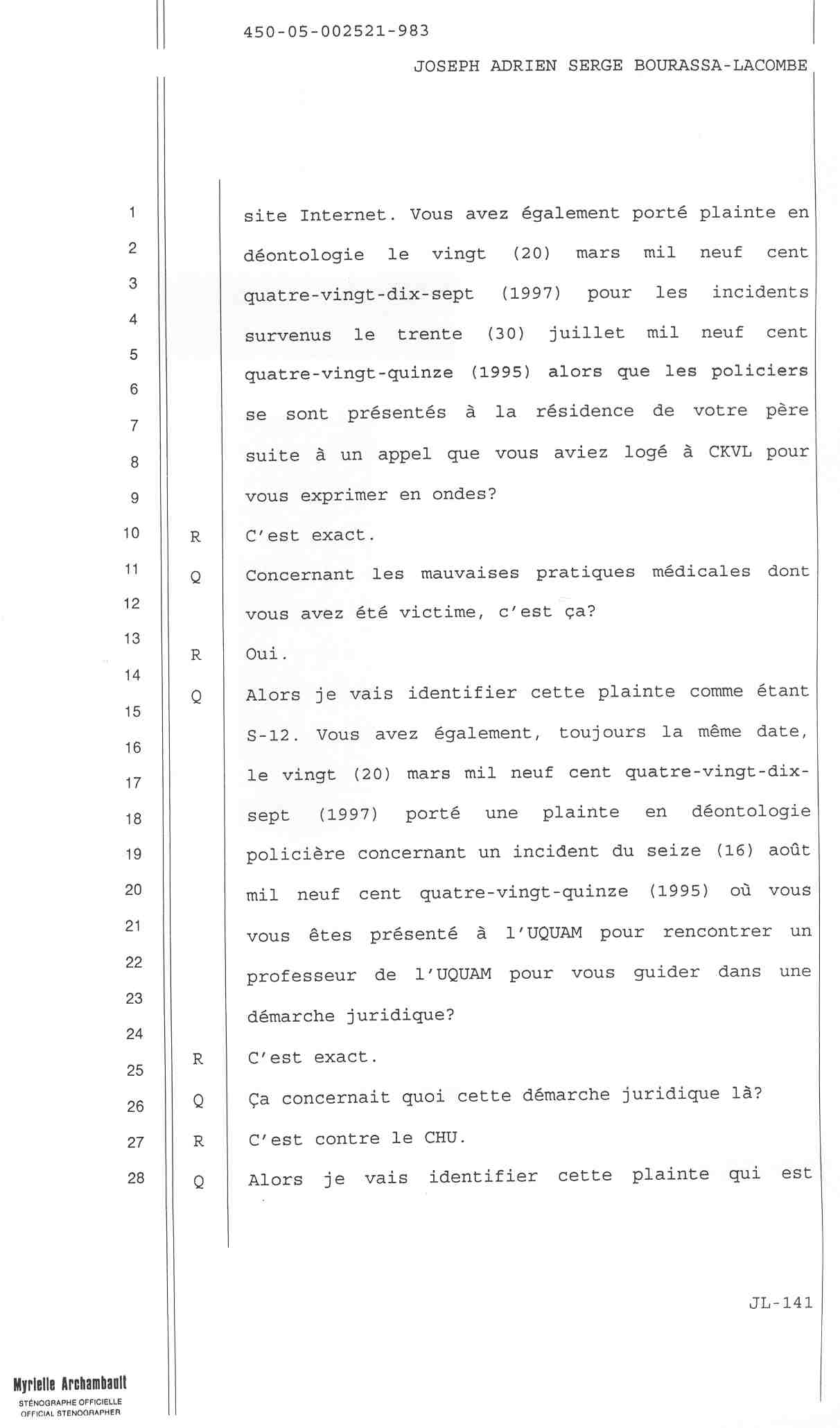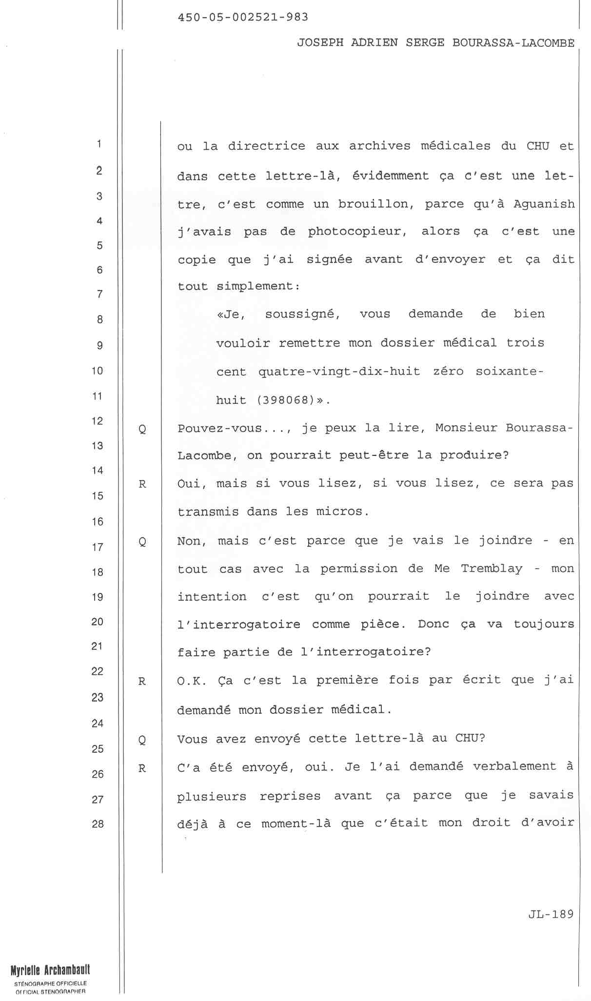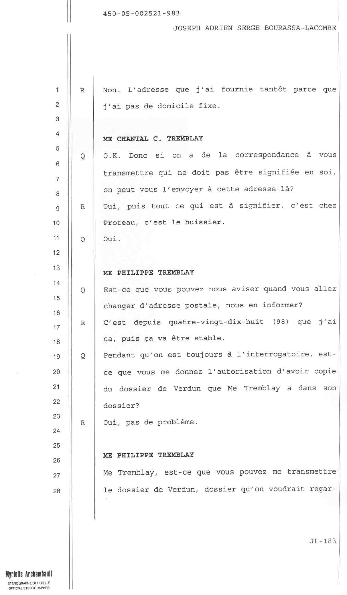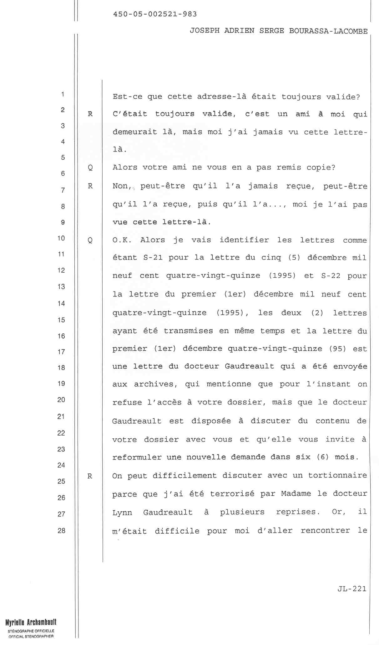 EN MÉMOIRE DU 04 JUILLET 1996 LORSQUE JE VIVAIS EN EXILE ET À LA QUÊTE DE MA PROPRE NOURRITURE, J'AI EFFECTUÉ UNE LIVRAISON SPÉCIALE AU XXVIE CONGRÈS INTERNATIONAL DE DROIT ET DE SANTÉ MENTALE QUI C'EST DÉROULÉ À MONTRÉAL DU 4 AU 6 JUILLET 2001 À L'ATTENTION DU DR PAUL-ANDRÉ LAFLEUR, DG DE L'INSTITUT PHILIPPE PINEL DE MONTRÉAL. J'AI DÉPOSÉ COMME OFFRANDE, 800 CARTES D'AFFAIRES DE LA FONDATION SERGE BOURASSA-LACOMBE SOIT UNE CARTE POUR CHAQUE CONGRESSISTE ATTENDU À CE CONGRÈS, 1 KILOGRAMME DE FILET DE SOLE POURRI ET 3 MORCEAUX DE GÂTEAU DES ANGES POUR QUE LE DR LAFLEUR UN DES ORGANISATEURS DE L'ÉVÉNEMENT COMPRENNE QU'IL AURAIT MIEUX VALU AU NOM DES DROITS DE L'HOMME ET DE LA SANTÉ MENTALE D'INVITER LA FONDATION SERGE BOURASSA-LACOMBE AFIN QUE LES CONGRESSISTES PUISSENT BÉNÉFICIER DE L'EXPERTISE SPÉCIALISÉE EN SANTÉ MENTALE DE SON PRÉSIDENT AFIN DE VOIR UNE DIMINUTION DE LA CRIMINALITÉ, DE RÉCIDIVE CRIMINELLE ET DE SUICIDE POUR CONSTRUIRE UN PAYS MEILLEUR. IL FAUT QUE VOUS SACHIEZ QUE CETTE MISSION SERA IMPOSSIBLE, TANT QU'IL N'Y AURA PAS DE REPENTANCE FAITE À MON ENDROIT DANS LES DOSSIERS MÉDICAUX DU : CENTRE HOSPITALIER UNIVERSITAIRE DE SHERBROOKE, DU CENTRE HOSPITALIER DE VERDUN, DU CENTRE HOSPITALIER DE ST. MARY ET DE L'INSTITUT PHILIPPE PINEL DE MONTRÉAL. AUSSI POUR AVOIR MULTIPLIÉ LES ACTIONS CRIMINELLES DIRIGÉES CONTRE MA PERSONNE EN AGISSANT SANS JUGEMENT DE LA COUR, DE M'AVOIR LAISSER VIVRE SANS ABRI ET SANS NOURRITURE PENDANT PLUS DE TROIS ANS.