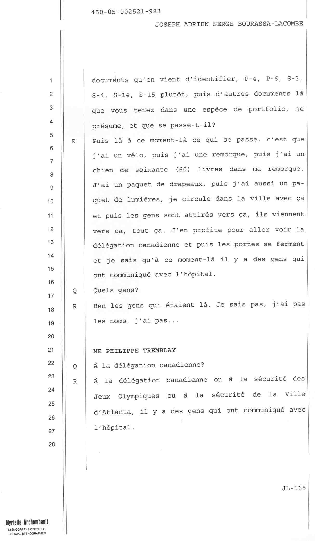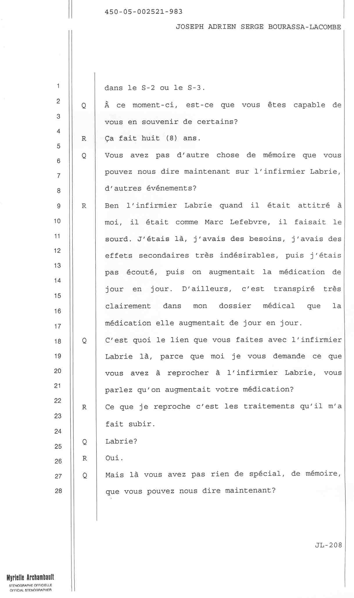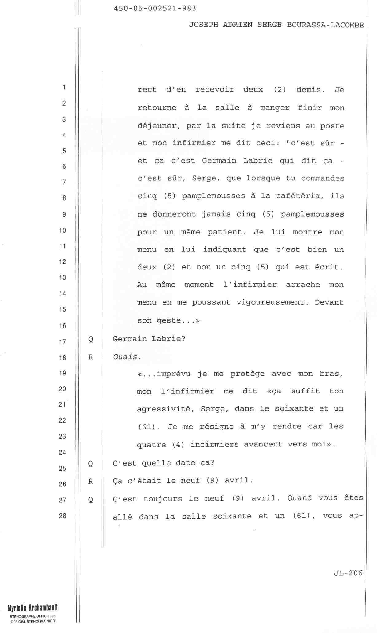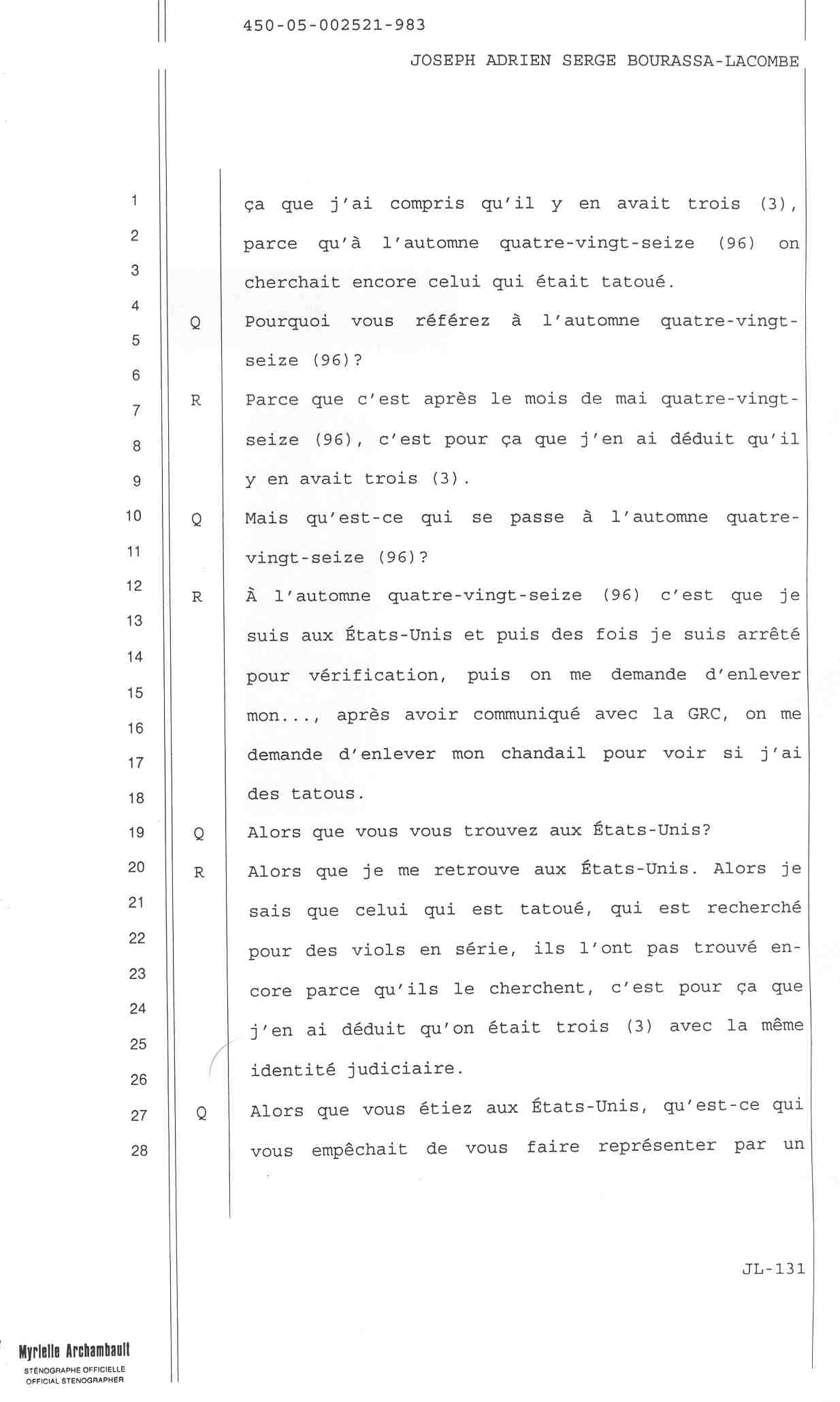 EN MÉMOIRE DU 04 JUILLET 1996 LORSQUE JE VIVAIS EN EXILE ET À LA QUÊTE DE MA PROPRE NOURRITURE, J'AI EFFECTUÉ UNE LIVRAISON SPÉCIALE AU XXVIE CONGRÈS INTERNATIONAL DE DROIT ET DE SANTÉ MENTALE QUI C'EST DÉROULÉ À MONTRÉAL DU 4 AU 6 JUILLET 2001 À L'ATTENTION DU DR PAUL-ANDRÉ LAFLEUR, DG DE L'INSTITUT PHILIPPE PINEL DE MONTRÉAL. J'AI DÉPOSÉ COMME OFFRANDE, 800 CARTES D'AFFAIRES DE LA FONDATION SERGE BOURASSA-LACOMBE SOIT UNE CARTE POUR CHAQUE CONGRESSISTE ATTENDU À CE CONGRÈS, 1 KILOGRAMME DE FILET DE SOLE POURRI ET 3 MORCEAUX DE GÂTEAU DES ANGES POUR QUE LE DR LAFLEUR UN DES ORGANISATEURS DE L'ÉVÉNEMENT COMPRENNE QU'IL AURAIT MIEUX VALU AU NOM DES DROITS DE L'HOMME ET DE LA SANTÉ MENTALE D'INVITER LA FONDATION SERGE BOURASSA-LACOMBE AFIN QUE LES CONGRESSISTES PUISSENT BÉNÉFICIER DE L'EXPERTISE SPÉCIALISÉE EN SANTÉ MENTALE DE SON PRÉSIDENT AFIN DE VOIR UNE DIMINUTION DE LA CRIMINALITÉ, DE RÉCIDIVE CRIMINELLE ET DE SUICIDE POUR CONSTRUIRE UN PAYS MEILLEUR. IL FAUT QUE VOUS SACHIEZ QUE CETTE MISSION SERA IMPOSSIBLE, TANT QU'IL N'Y AURA PAS DE REPENTANCE FAITE À MON ENDROIT DANS LES DOSSIERS MÉDICAUX DU : CENTRE HOSPITALIER UNIVERSITAIRE DE SHERBROOKE, DU CENTRE HOSPITALIER DE VERDUN, DU CENTRE HOSPITALIER DE ST. MARY ET DE L'INSTITUT PHILIPPE PINEL DE MONTRÉAL. AUSSI POUR AVOIR MULTIPLIÉ LES ACTIONS CRIMINELLES DIRIGÉES CONTRE MA PERSONNE EN AGISSANT SANS JUGEMENT DE LA COUR, DE M'AVOIR LAISSER VIVRE SANS ABRI ET SANS NOURRITURE PENDANT PLUS DE TROIS ANS.
