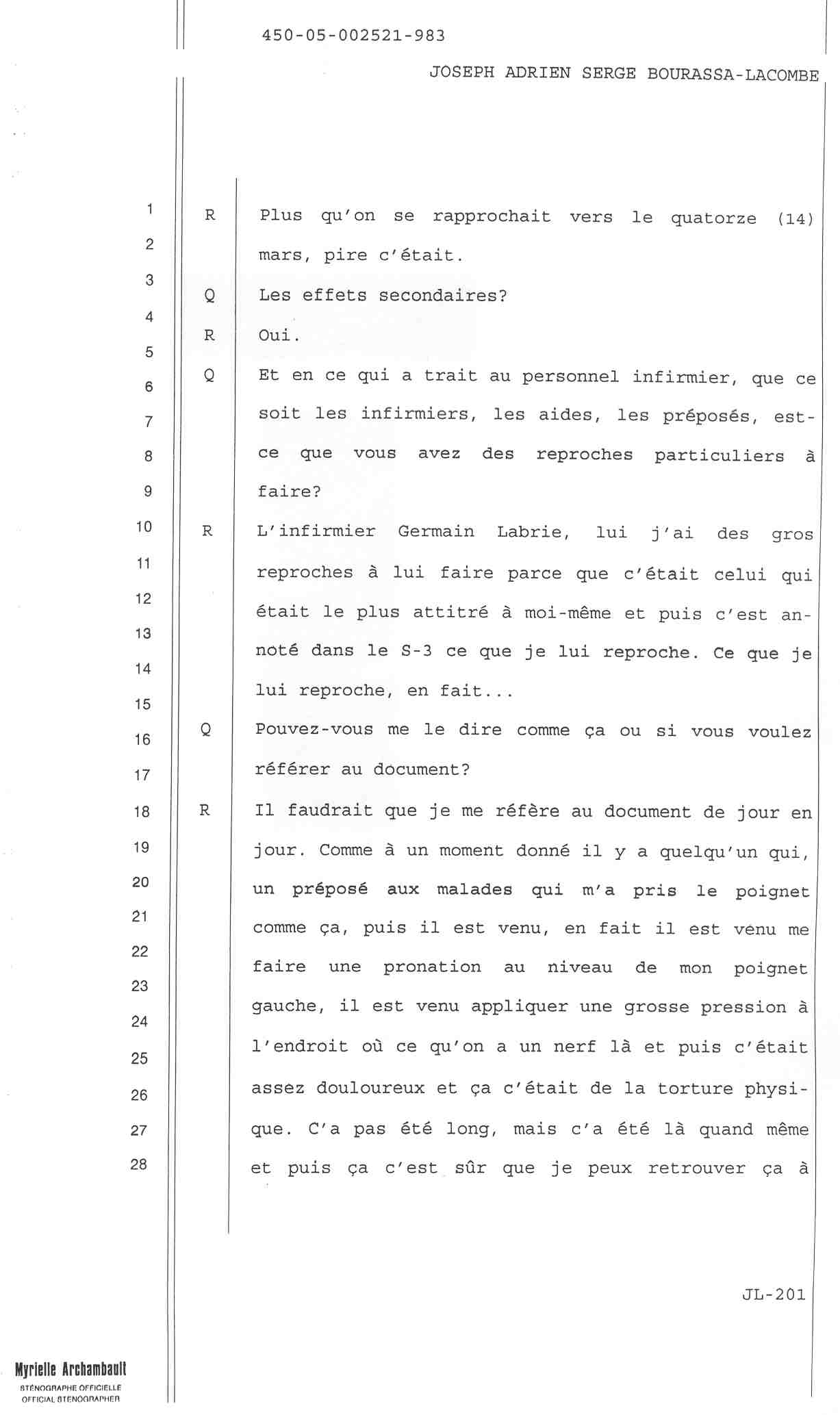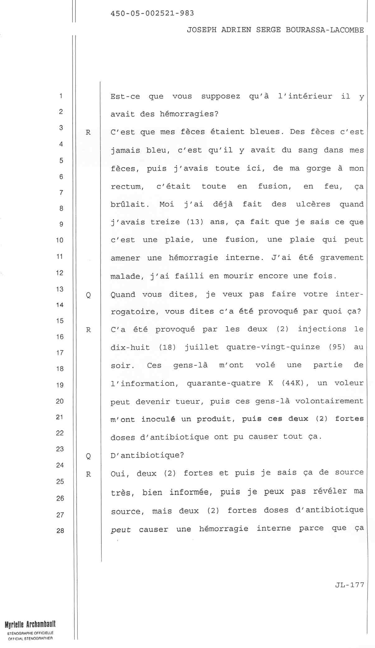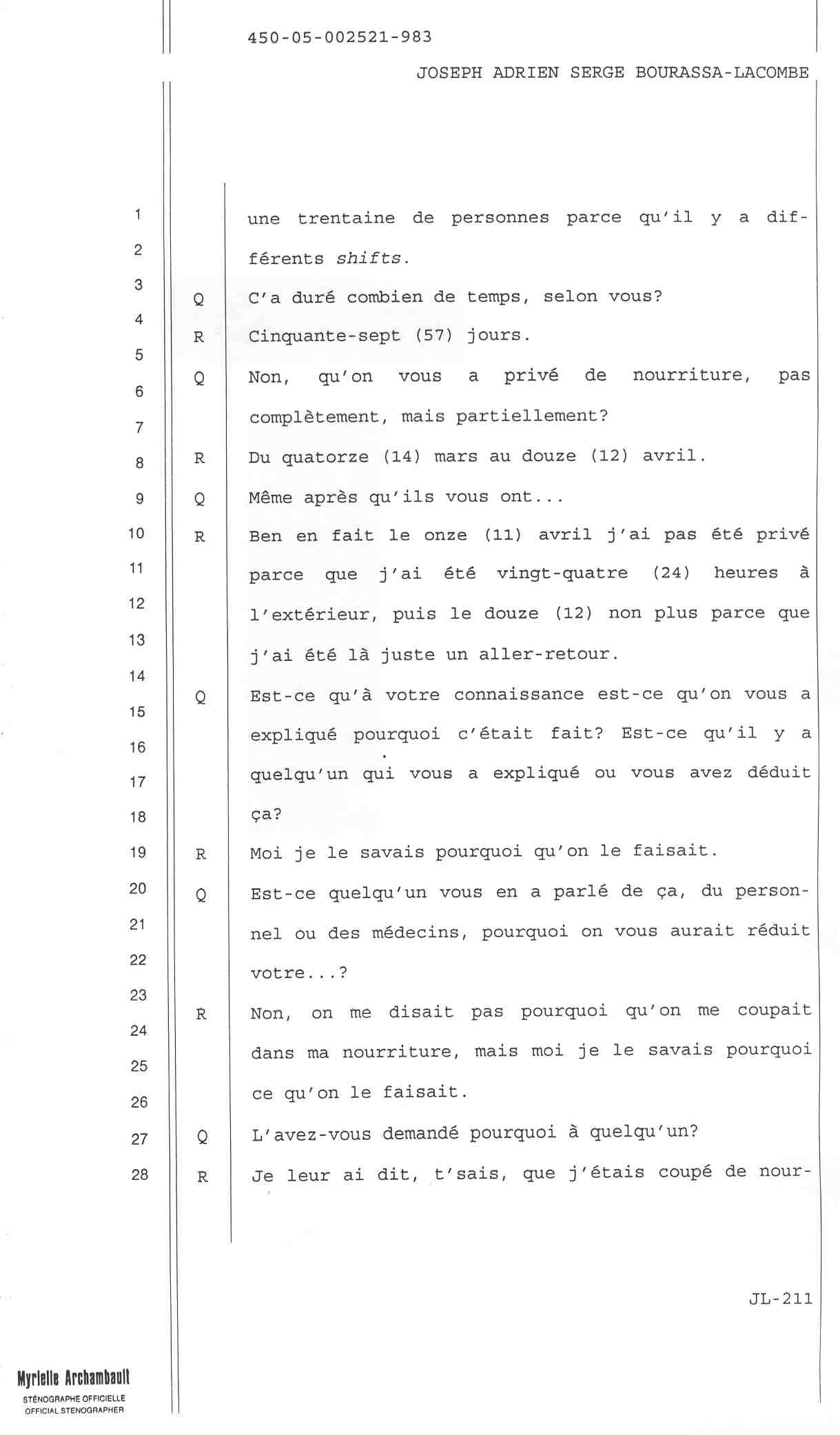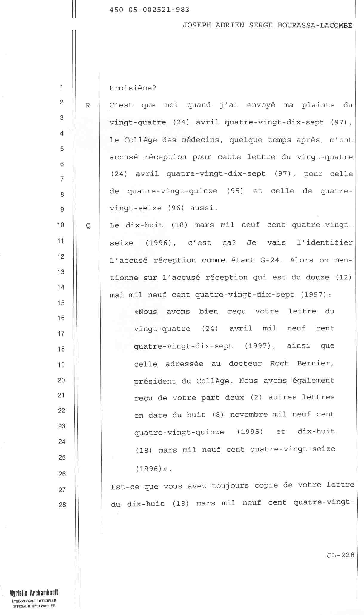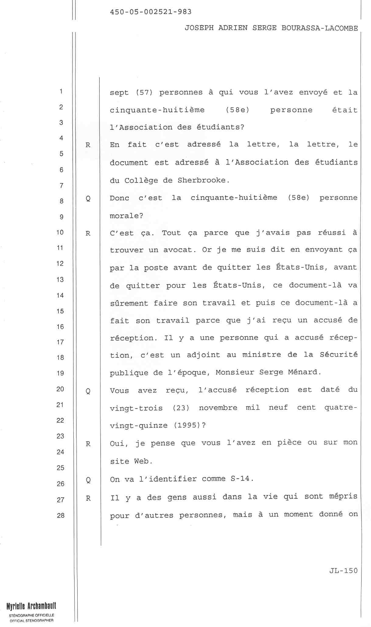 EN MÉMOIRE DU 04 JUILLET 1996 LORSQUE JE VIVAIS EN EXILE ET À LA QUÊTE DE MA PROPRE NOURRITURE, J'AI EFFECTUÉ UNE LIVRAISON SPÉCIALE AU XXVIE CONGRÈS INTERNATIONAL DE DROIT ET DE SANTÉ MENTALE QUI C'EST DÉROULÉ À MONTRÉAL DU 4 AU 6 JUILLET 2001 À L'ATTENTION DU DR PAUL-ANDRÉ LAFLEUR, DG DE L'INSTITUT PHILIPPE PINEL DE MONTRÉAL. J'AI DÉPOSÉ COMME OFFRANDE, 800 CARTES D'AFFAIRES DE LA FONDATION SERGE BOURASSA-LACOMBE SOIT UNE CARTE POUR CHAQUE CONGRESSISTE ATTENDU À CE CONGRÈS, 1 KILOGRAMME DE FILET DE SOLE POURRI ET 3 MORCEAUX DE GÂTEAU DES ANGES POUR QUE LE DR LAFLEUR UN DES ORGANISATEURS DE L'ÉVÉNEMENT COMPRENNE QU'IL AURAIT MIEUX VALU AU NOM DES DROITS DE L'HOMME ET DE LA SANTÉ MENTALE D'INVITER LA FONDATION SERGE BOURASSA-LACOMBE AFIN QUE LES CONGRESSISTES PUISSENT BÉNÉFICIER DE L'EXPERTISE SPÉCIALISÉE EN SANTÉ MENTALE DE SON PRÉSIDENT AFIN DE VOIR UNE DIMINUTION DE LA CRIMINALITÉ, DE RÉCIDIVE CRIMINELLE ET DE SUICIDE POUR CONSTRUIRE UN PAYS MEILLEUR. IL FAUT QUE VOUS SACHIEZ QUE CETTE MISSION SERA IMPOSSIBLE, TANT QU'IL N'Y AURA PAS DE REPENTANCE FAITE À MON ENDROIT DANS LES DOSSIERS MÉDICAUX DU : CENTRE HOSPITALIER UNIVERSITAIRE DE SHERBROOKE, DU CENTRE HOSPITALIER DE VERDUN, DU CENTRE HOSPITALIER DE ST. MARY ET DE L'INSTITUT PHILIPPE PINEL DE MONTRÉAL. AUSSI POUR AVOIR MULTIPLIÉ LES ACTIONS CRIMINELLES DIRIGÉES CONTRE MA PERSONNE EN AGISSANT SANS JUGEMENT DE LA COUR, DE M'AVOIR LAISSER VIVRE SANS ABRI ET SANS NOURRITURE PENDANT PLUS DE TROIS ANS.