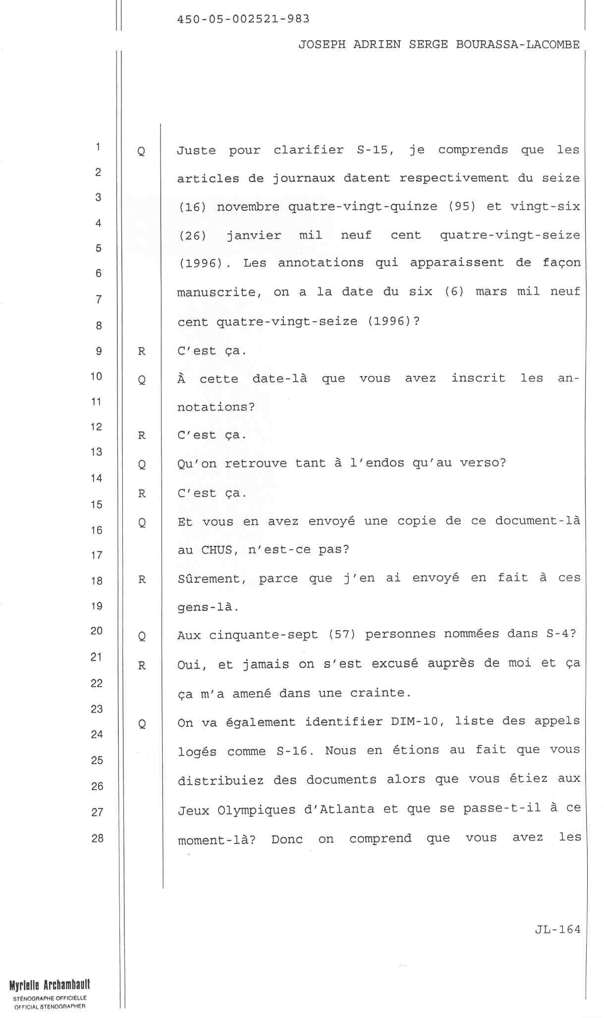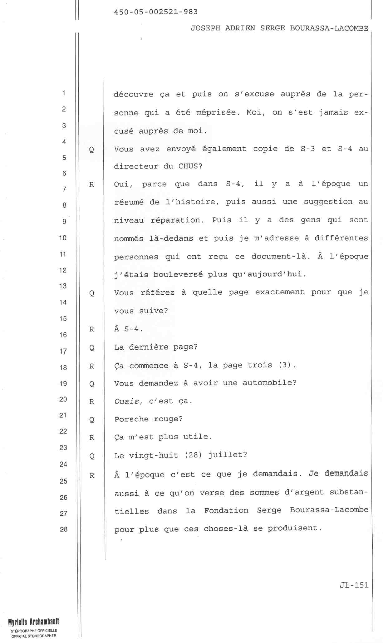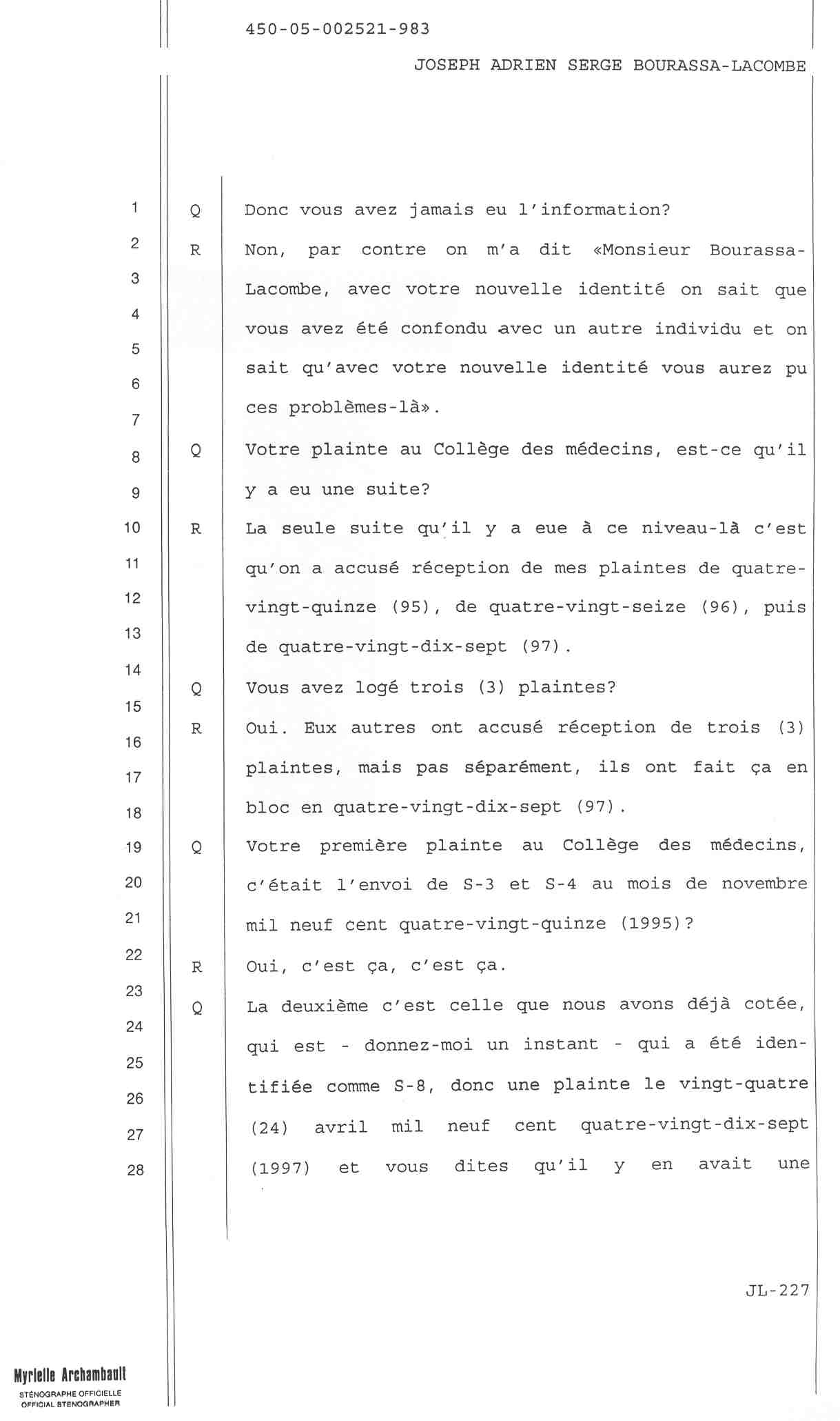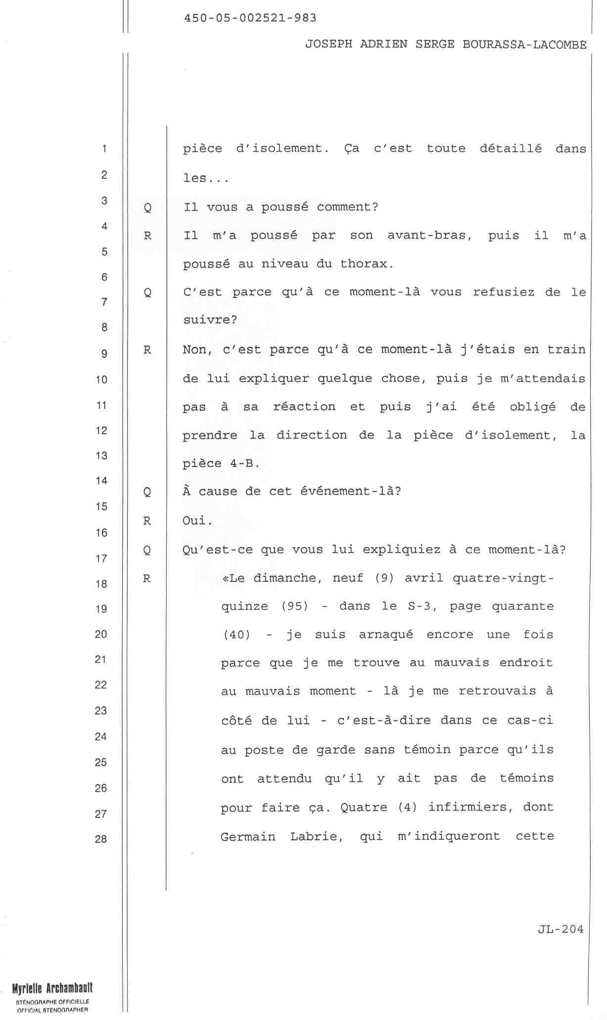 EN MÉMOIRE DU 04 JUILLET 1996 LORSQUE JE VIVAIS EN EXILE ET À LA QUÊTE DE MA PROPRE NOURRITURE, J'AI EFFECTUÉ UNE LIVRAISON SPÉCIALE AU XXVIE CONGRÈS INTERNATIONAL DE DROIT ET DE SANTÉ MENTALE QUI C'EST DÉROULÉ À MONTRÉAL DU 4 AU 6 JUILLET 2001 À L'ATTENTION DU DR PAUL-ANDRÉ LAFLEUR, DG DE L'INSTITUT PHILIPPE PINEL DE MONTRÉAL. J'AI DÉPOSÉ COMME OFFRANDE, 800 CARTES D'AFFAIRES DE LA FONDATION SERGE BOURASSA-LACOMBE SOIT UNE CARTE POUR CHAQUE CONGRESSISTE ATTENDU À CE CONGRÈS, 1 KILOGRAMME DE FILET DE SOLE POURRI ET 3 MORCEAUX DE GÂTEAU DES ANGES POUR QUE LE DR LAFLEUR UN DES ORGANISATEURS DE L'ÉVÉNEMENT COMPRENNE QU'IL AURAIT MIEUX VALU AU NOM DES DROITS DE L'HOMME ET DE LA SANTÉ MENTALE D'INVITER LA FONDATION SERGE BOURASSA-LACOMBE AFIN QUE LES CONGRESSISTES PUISSENT BÉNÉFICIER DE L'EXPERTISE SPÉCIALISÉE EN SANTÉ MENTALE DE SON PRÉSIDENT AFIN DE VOIR UNE DIMINUTION DE LA CRIMINALITÉ, DE RÉCIDIVE CRIMINELLE ET DE SUICIDE POUR CONSTRUIRE UN PAYS MEILLEUR. IL FAUT QUE VOUS SACHIEZ QUE CETTE MISSION SERA IMPOSSIBLE, TANT QU'IL N'Y AURA PAS DE REPENTANCE FAITE À MON ENDROIT DANS LES DOSSIERS MÉDICAUX DU : CENTRE HOSPITALIER UNIVERSITAIRE DE SHERBROOKE, DU CENTRE HOSPITALIER DE VERDUN, DU CENTRE HOSPITALIER DE ST. MARY ET DE L'INSTITUT PHILIPPE PINEL DE MONTRÉAL. AUSSI POUR AVOIR MULTIPLIÉ LES ACTIONS CRIMINELLES DIRIGÉES CONTRE MA PERSONNE EN AGISSANT SANS JUGEMENT DE LA COUR, DE M'AVOIR LAISSER VIVRE SANS ABRI ET SANS NOURRITURE PENDANT PLUS DE TROIS ANS.