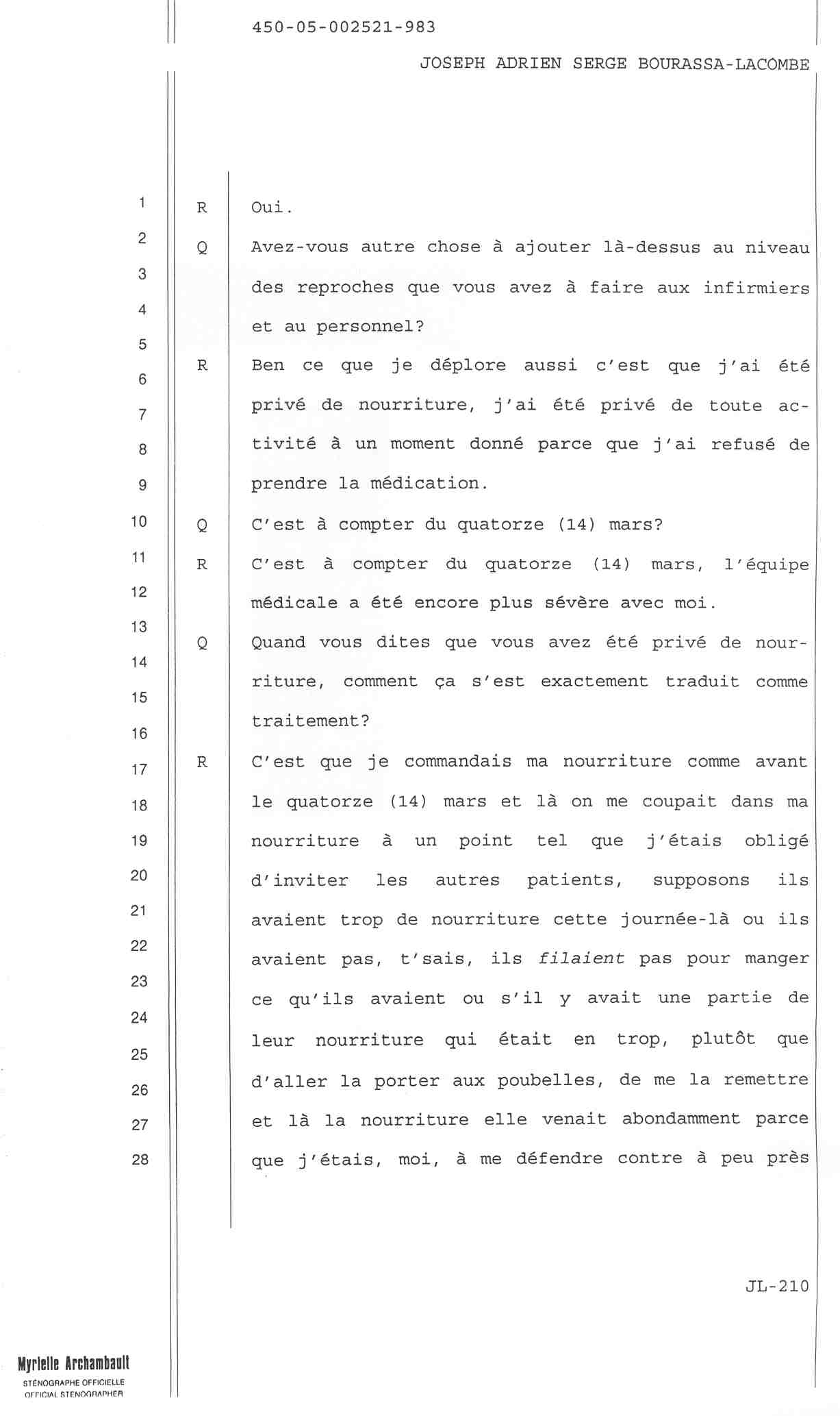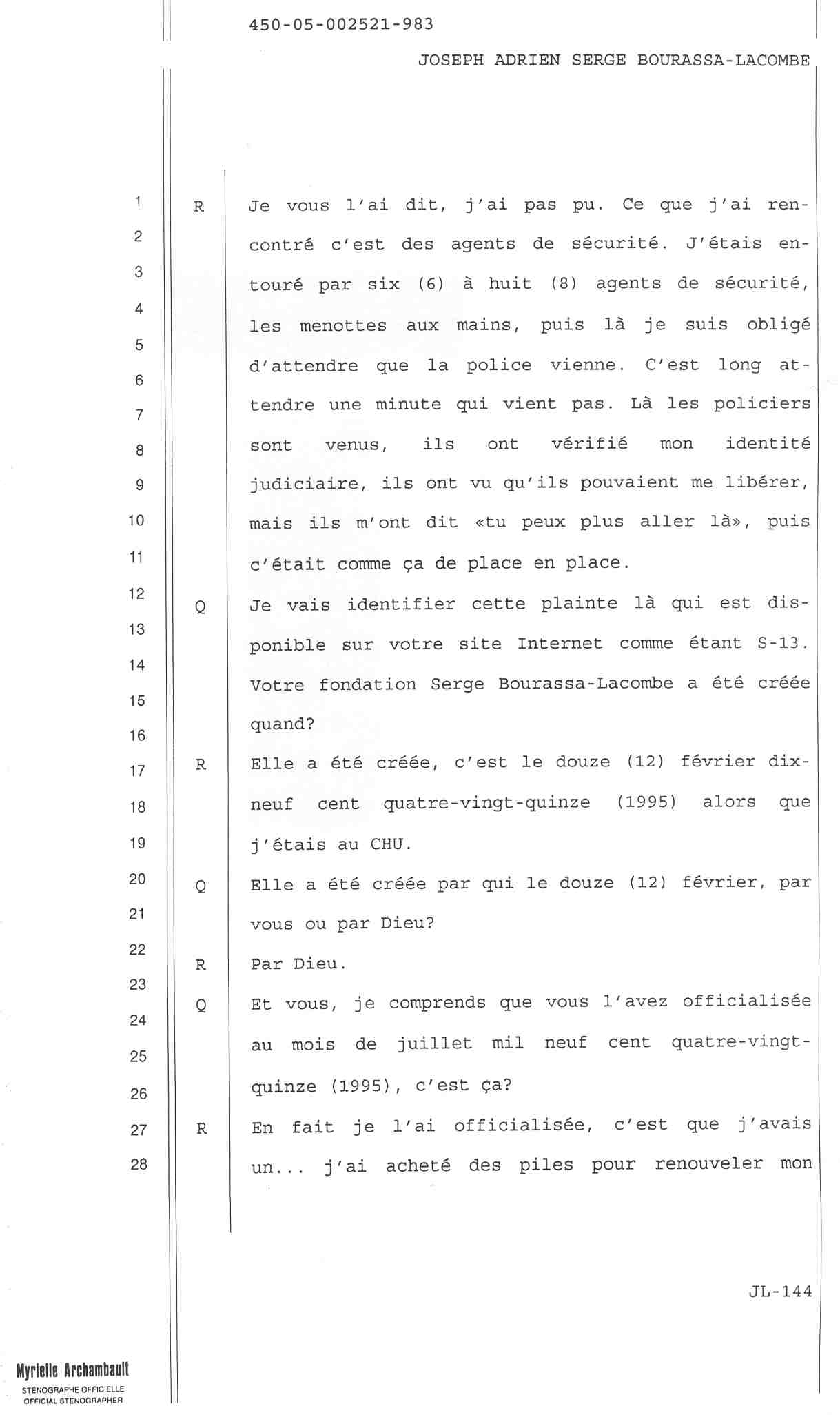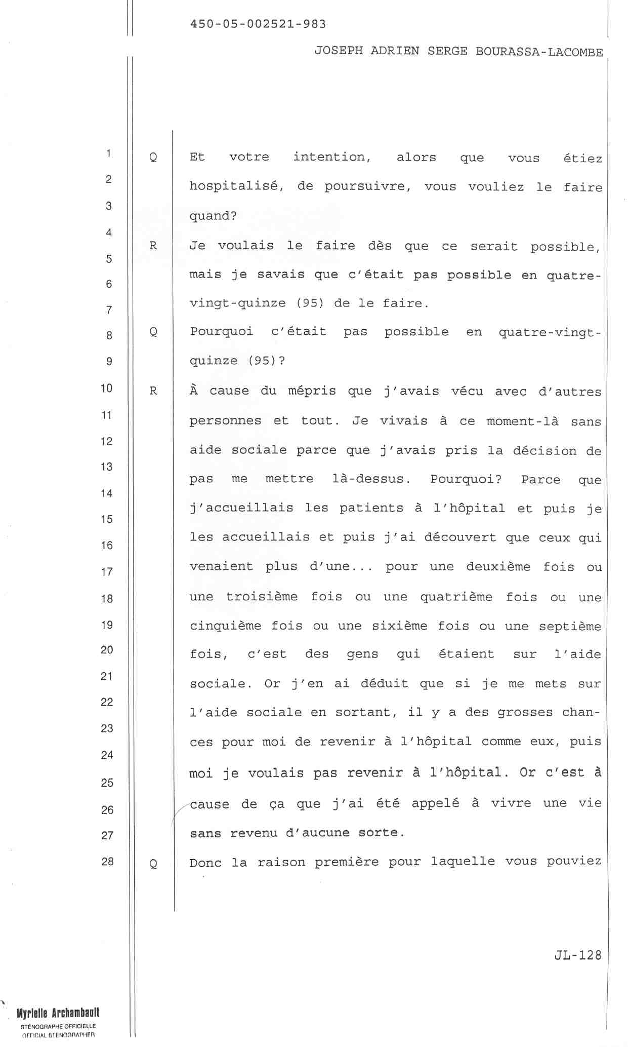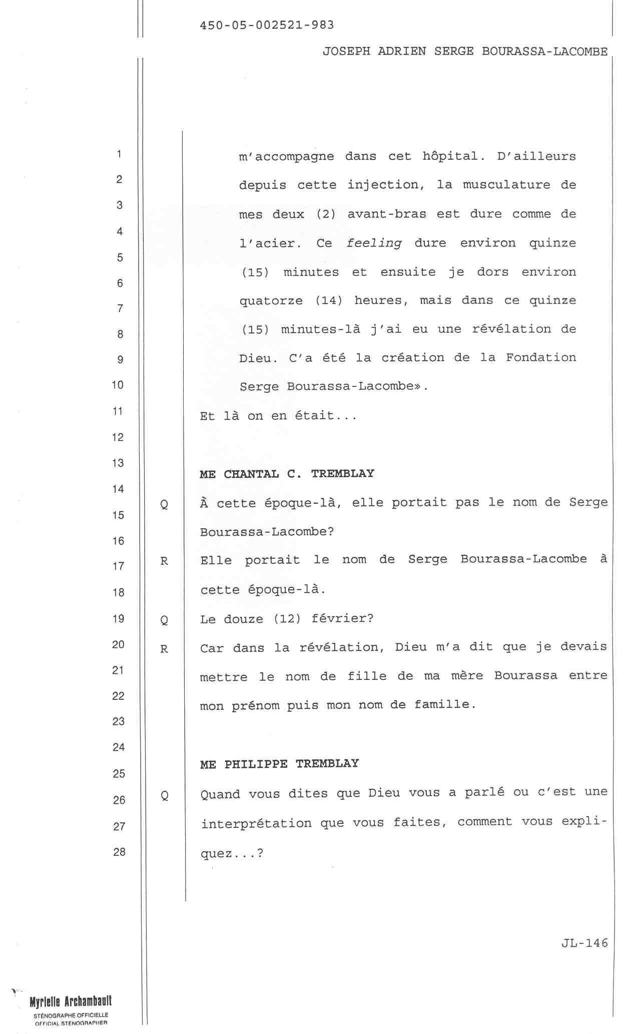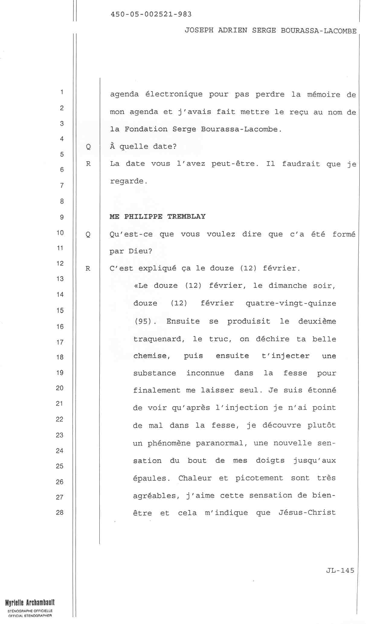 EN MEMORIA DEL 04 DE JULIO DE 1996 CUANDO VIVÍA EN E Y A LA BÚSQUEDA DE MI PROPIA COMIDA, EFECTUÉ UNA ENTREGA ESPECIAL AL XXVIE CONGRESO INTERNACIONAL DE DERECHO Y SALUD MENTAL QUE ESTO SE DESENROLLA EN MONTREAL DEL 4 AL 6 DE JULIO DE 2001 A LA ATENCIÓN DEL DR. ANDRÉ LAFLEUR, DG DEL INSTITUTO PHILIPPE PINEL DE MONTREAL. DEPOSITÉ COMO OFRENDA, 800 TARJETAS DE ASUNTOS DE LA FUNDACIÓN SARGA BOURASSA-LACOMBE SEAN UNA TARJETA PARA CADA MIEMBRO DEL CONGRESO ESPERADO A ESTE CONGRESO, 1 KILOGRAMO DE RED DE PLACA DESCOMPUESTA Y 3 PEDAZOS DE TARTA DE LOS ÁNGELES PARA QUE EL DR. LAFLEUR UNO DE LOS ORGANIZADORES DEL ACONTECIMIENTO INCLUYA QUE TENDRÍA MEJOR VALUE EN NOMBRE DE LOS DERECHOS HUMANOS Y DE LA SALUD MENTAL INVITAR LA FUNDACIÓN SARGA BOURASSA-LACOMBE PARA QUE LOS MIEMBROS DEL CONGRESO PUEDAN BENEFICIARSE DEL PERITAJE ESPECIALIZADO EN SALUD MENTAL DE SU PRESIDENTE CON EL FIN DE VER UNA DISMINUCIÓN DE LA CRIMINALIDAD, REPETICIÓN CRIMINAL Y SUICIDIO PARA CONSTRUIR UN MEJOR PAÍS. ES NECESARIO QUE SEPAN QUE ESTA MISIÓN SERÁ IMPOSIBLE, MIENTRAS ÉL UN REPENTANCE NO HUBO A MI LUGAR EN LOS EXPEDIENTES MÉDICOS DE: CENTRO HOSPITALARIO UNIVERSITARIO DE SHERBROOKE, DEL CENTRO HOSPITALARIO DE VERDUN, DEL CENTRO HOSPITALARIO DE ST. MARY Y DEL INSTITUTO PHILIPPE PINEL DE MONTREAL.. POR ESO PARA HABER MULTIPLICADO LAS ACCIONES CRIMINALES DIRIGIDAS CONTRA MI PERSONA ACTUANDO SIN JUICIO DEL TRIBUNAL, DE TENERME DEJAR VIVIR SIN REFUGIO Y SIN COMIDA DURANTE MÁS DE TRES AÑOS.