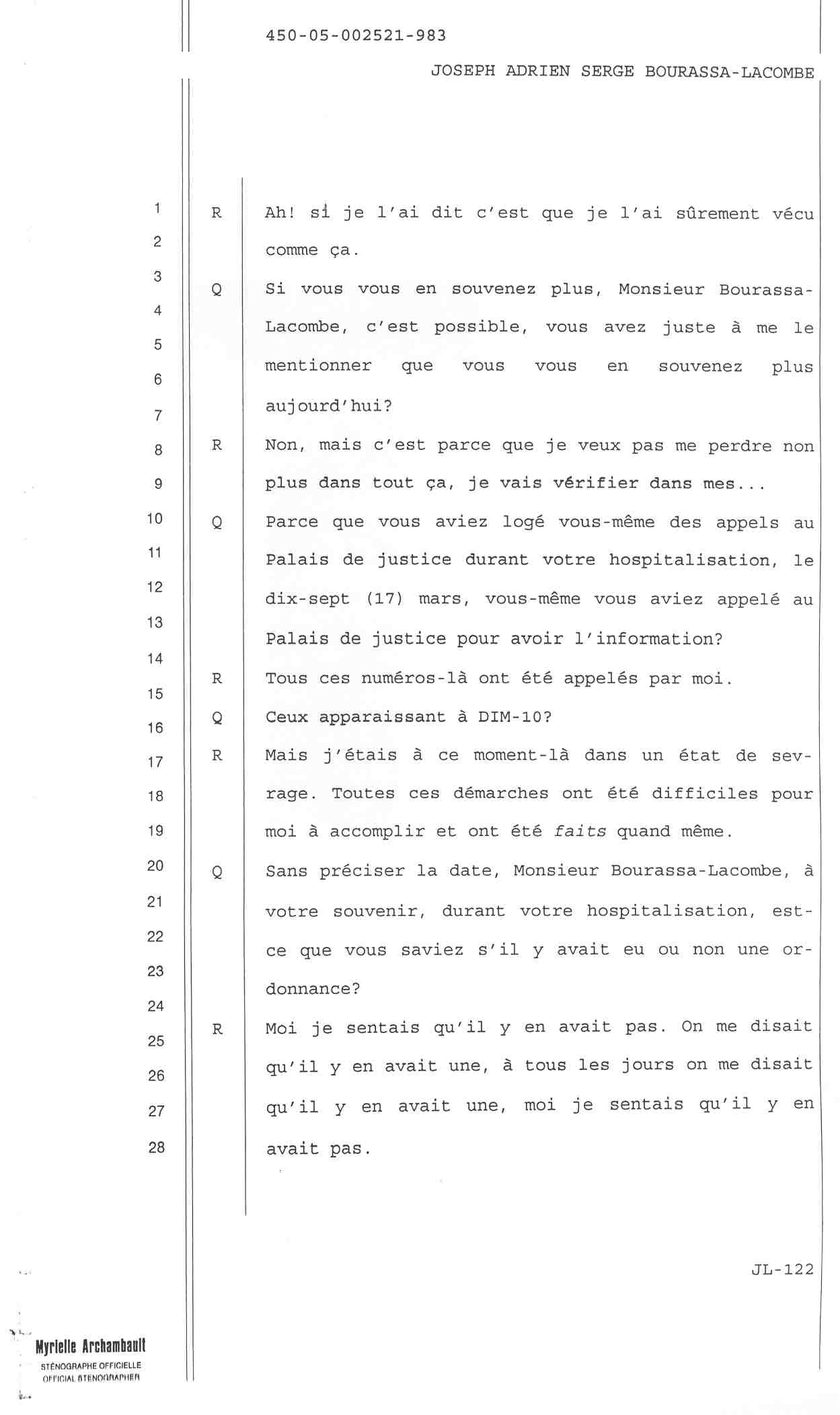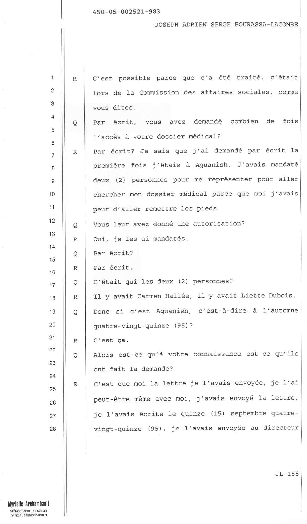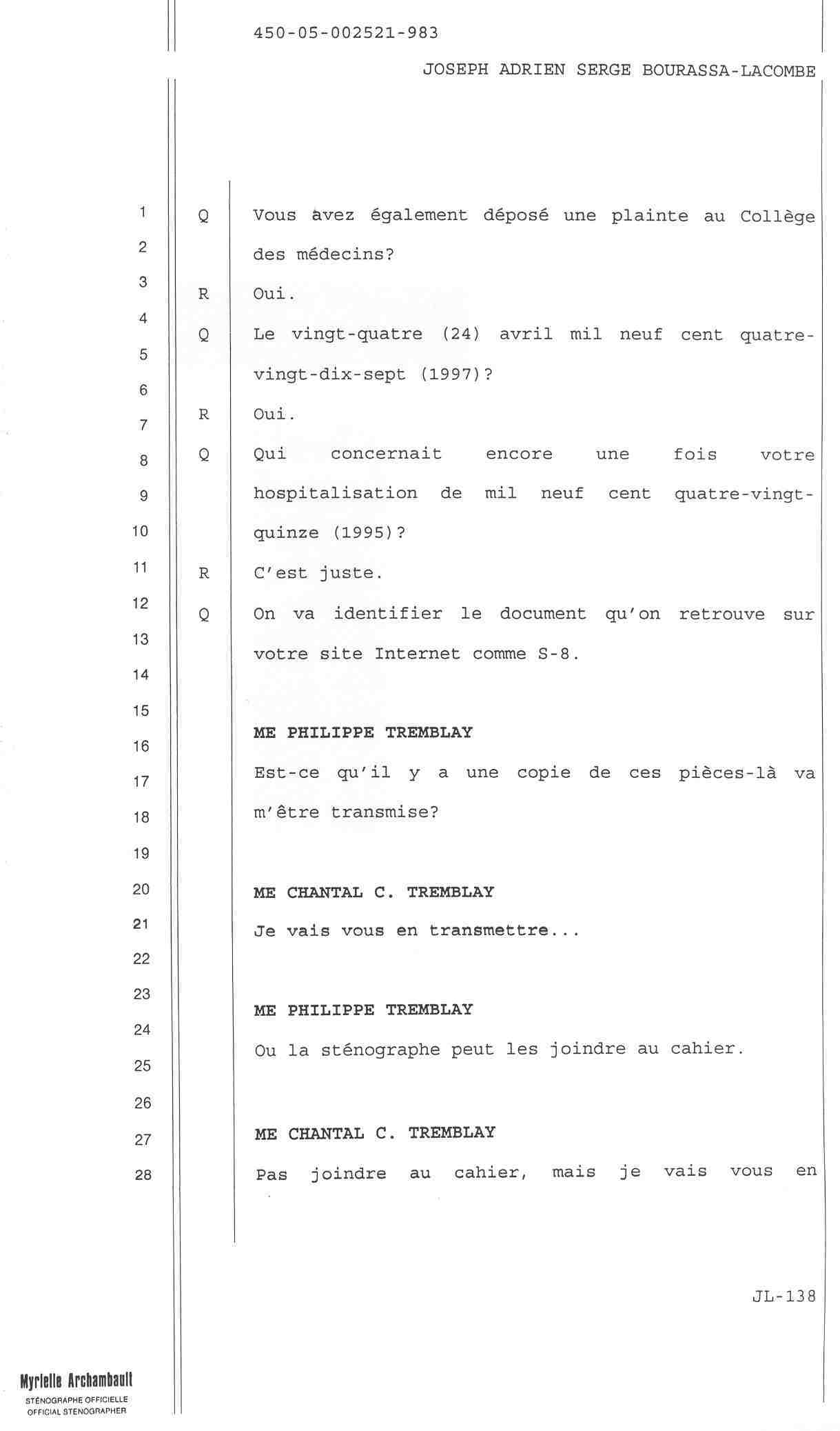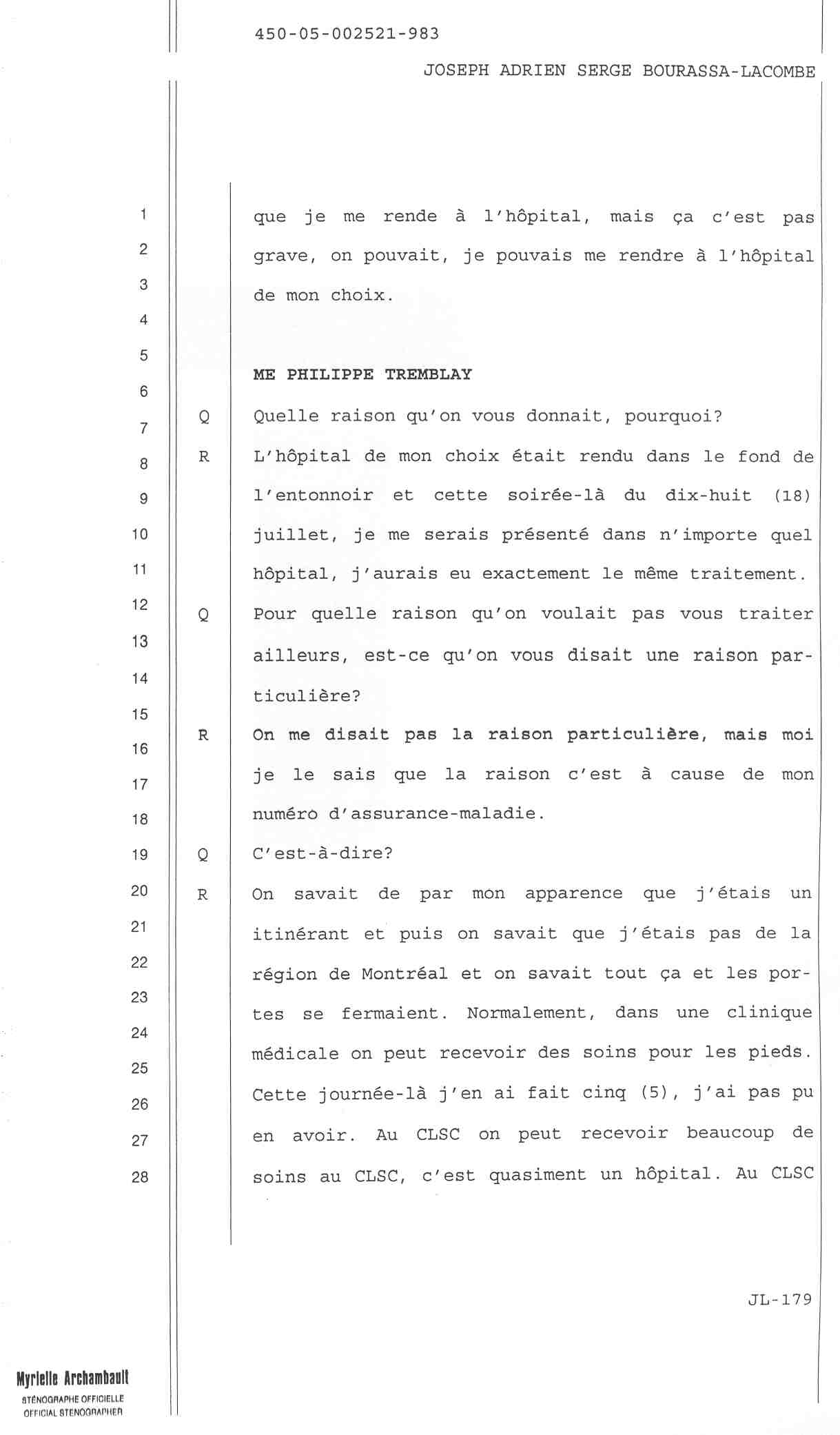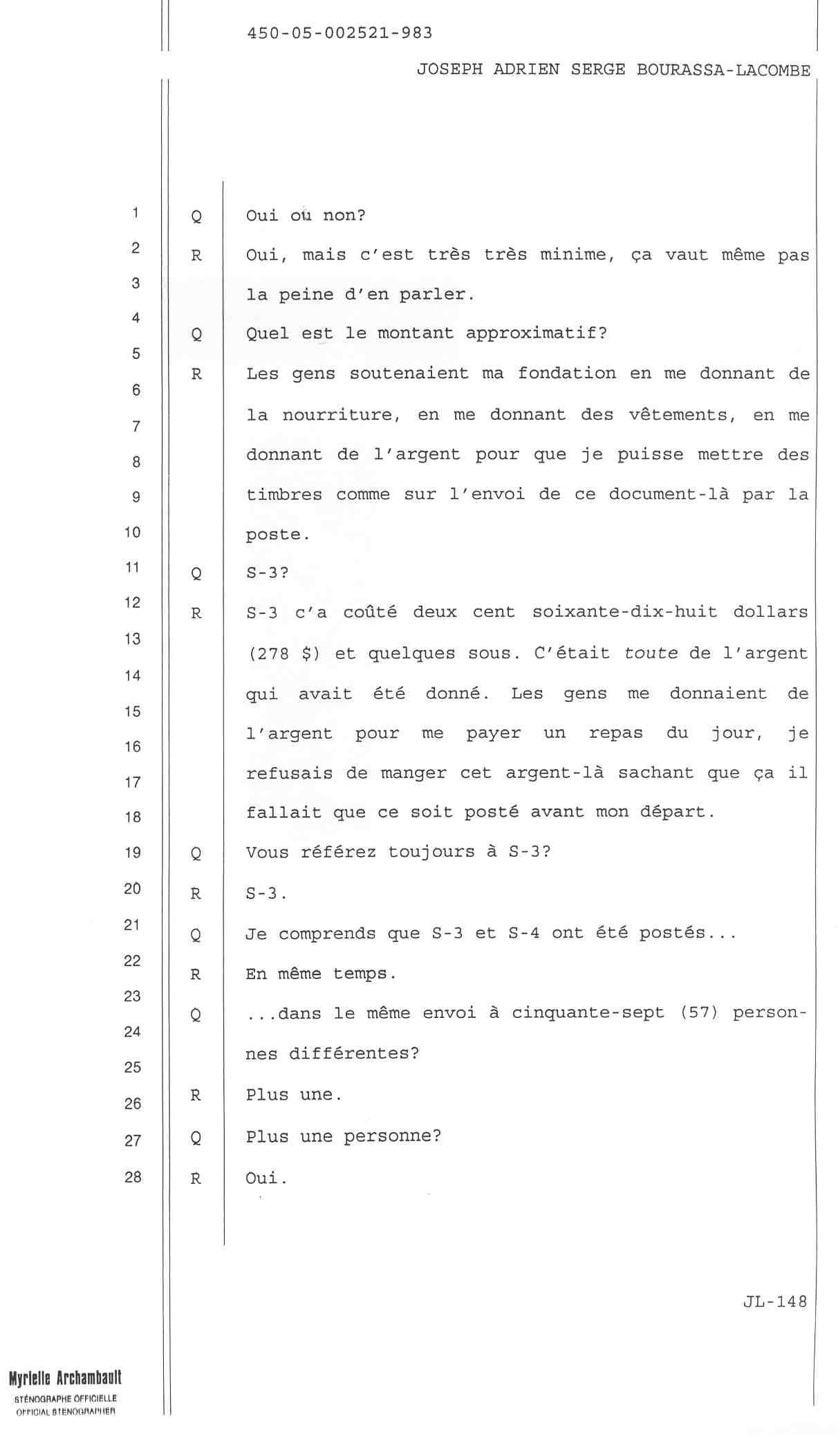 EN MEMORIA DEL 04 DE JULIO DE 1996 CUANDO VIVÍA EN E Y A LA BÚSQUEDA DE MI PROPIA COMIDA, EFECTUÉ UNA ENTREGA ESPECIAL AL XXVIE CONGRESO INTERNACIONAL DE DERECHO Y SALUD MENTAL QUE ESTO SE DESENROLLA EN MONTREAL DEL 4 AL 6 DE JULIO DE 2001 A LA ATENCIÓN DEL DR. ANDRÉ LAFLEUR, DG DEL INSTITUTO PHILIPPE PINEL DE MONTREAL. DEPOSITÉ COMO OFRENDA, 800 TARJETAS DE ASUNTOS DE LA FUNDACIÓN SARGA BOURASSA-LACOMBE SEAN UNA TARJETA PARA CADA MIEMBRO DEL CONGRESO ESPERADO A ESTE CONGRESO, 1 KILOGRAMO DE RED DE PLACA DESCOMPUESTA Y 3 PEDAZOS DE TARTA DE LOS ÁNGELES PARA QUE EL DR. LAFLEUR UNO DE LOS ORGANIZADORES DEL ACONTECIMIENTO INCLUYA QUE TENDRÍA MEJOR VALUE EN NOMBRE DE LOS DERECHOS HUMANOS Y DE LA SALUD MENTAL INVITAR LA FUNDACIÓN SARGA BOURASSA-LACOMBE PARA QUE LOS MIEMBROS DEL CONGRESO PUEDAN BENEFICIARSE DEL PERITAJE ESPECIALIZADO EN SALUD MENTAL DE SU PRESIDENTE CON EL FIN DE VER UNA DISMINUCIÓN DE LA CRIMINALIDAD, REPETICIÓN CRIMINAL Y SUICIDIO PARA CONSTRUIR UN MEJOR PAÍS. ES NECESARIO QUE SEPAN QUE ESTA MISIÓN SERÁ IMPOSIBLE, MIENTRAS ÉL UN REPENTANCE NO HUBO A MI LUGAR EN LOS EXPEDIENTES MÉDICOS DE: CENTRO HOSPITALARIO UNIVERSITARIO DE SHERBROOKE, DEL CENTRO HOSPITALARIO DE VERDUN, DEL CENTRO HOSPITALARIO DE ST. MARY Y DEL INSTITUTO PHILIPPE PINEL DE MONTREAL.. POR ESO PARA HABER MULTIPLICADO LAS ACCIONES CRIMINALES DIRIGIDAS CONTRA MI PERSONA ACTUANDO SIN JUICIO DEL TRIBUNAL, DE TENERME DEJAR VIVIR SIN REFUGIO Y SIN COMIDA DURANTE MÁS DE TRES AÑOS.