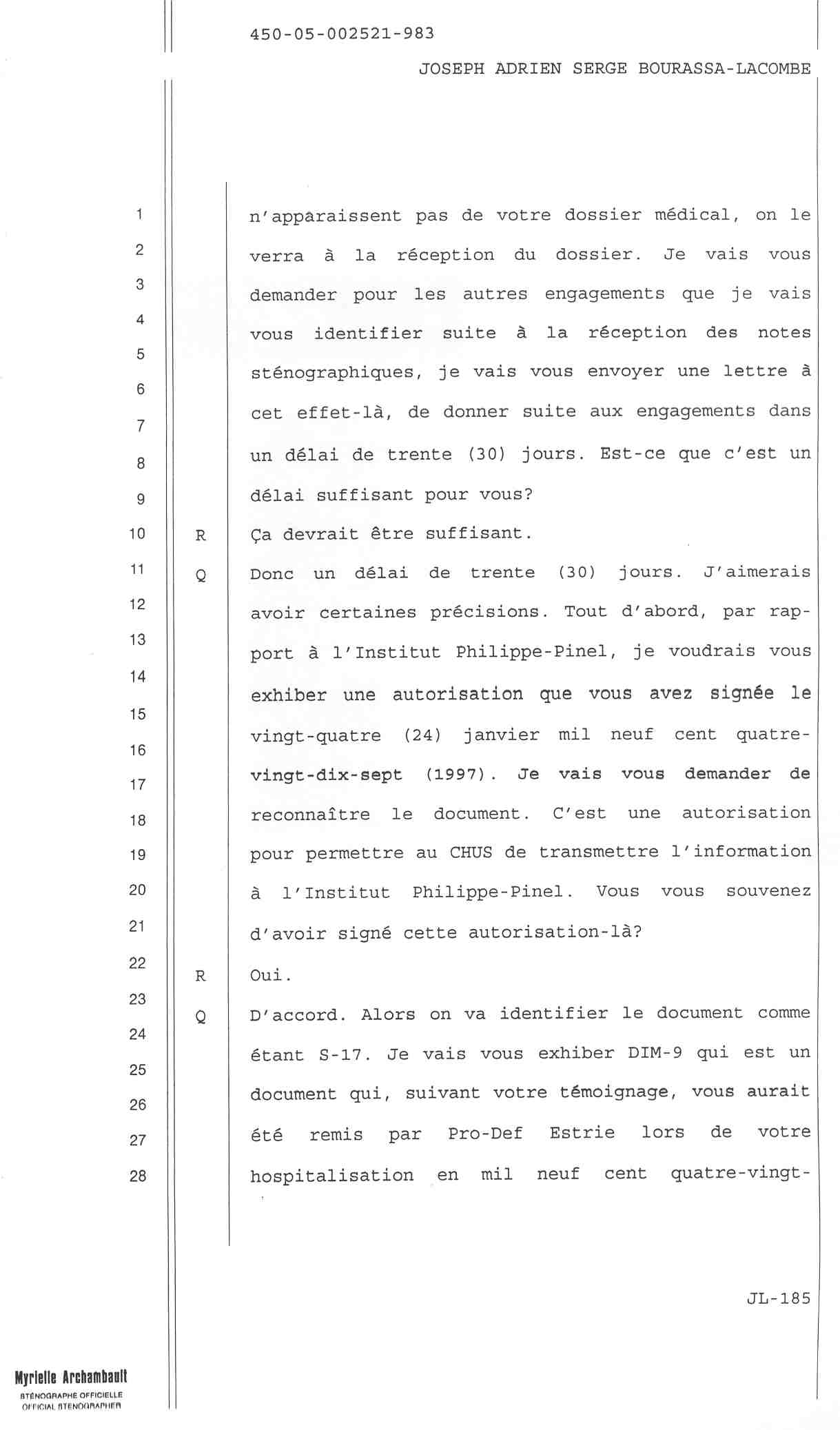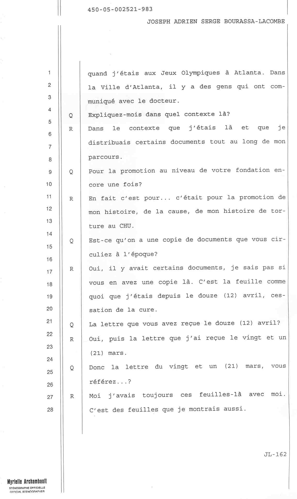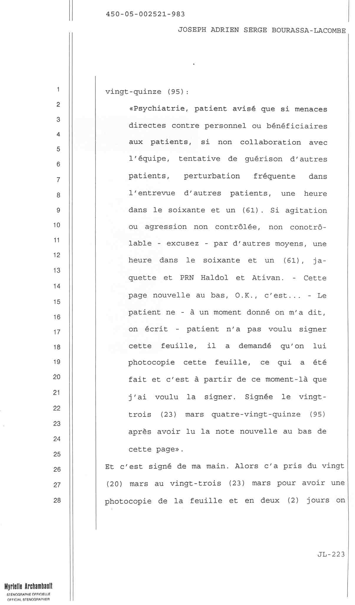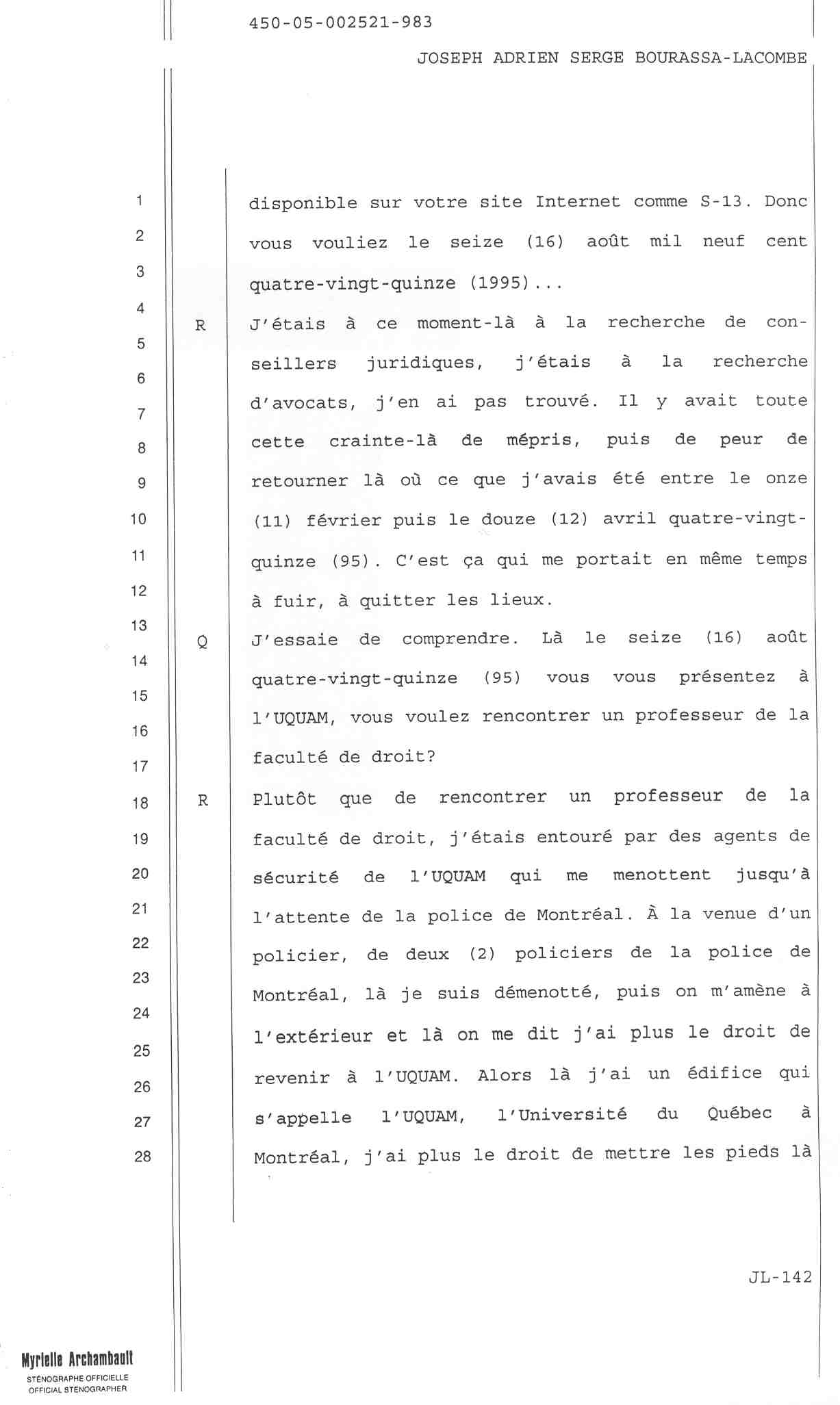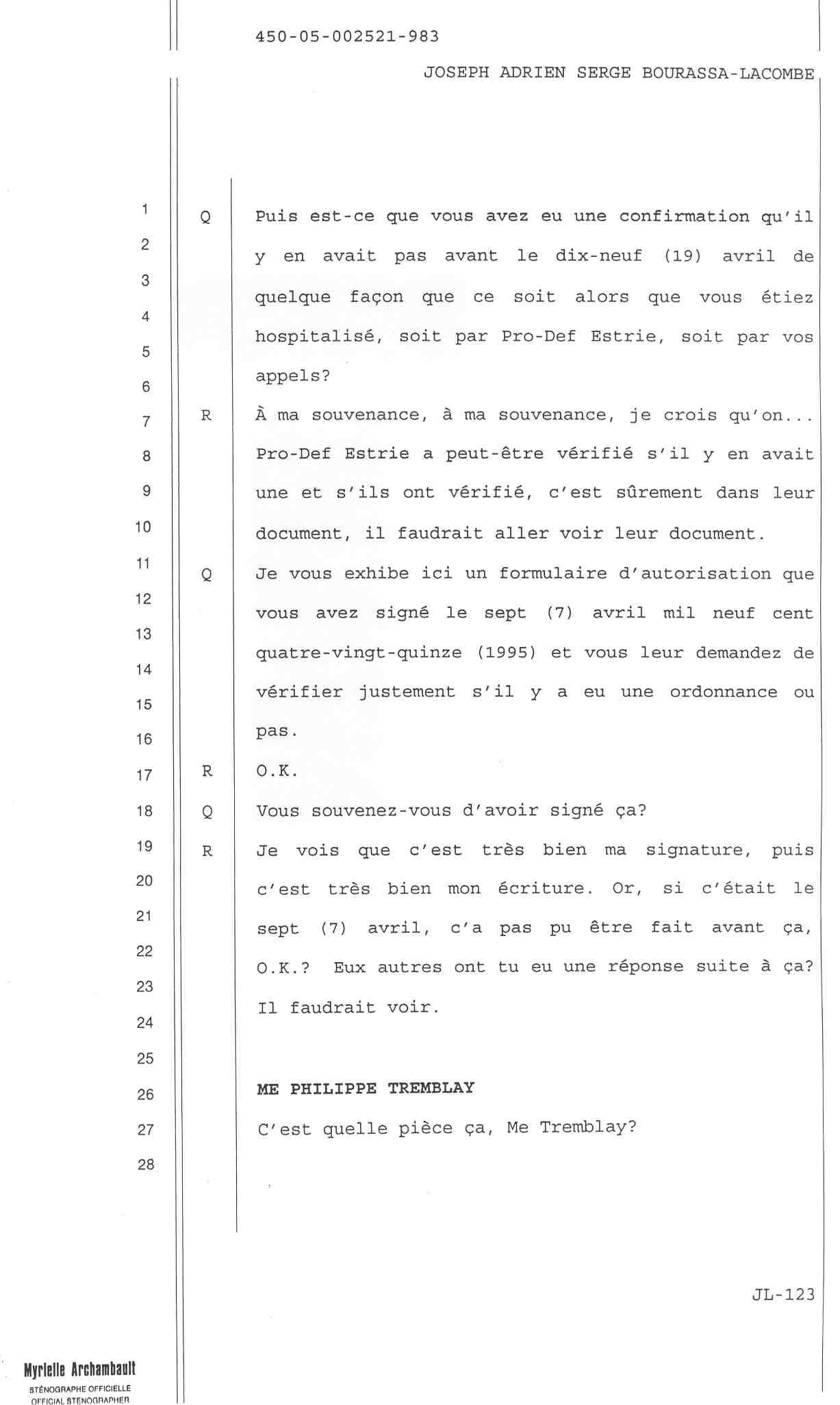 EN MEMORIA DEL 04 DE JULIO DE 1996 CUANDO VIVÍA EN E Y A LA BÚSQUEDA DE MI PROPIA COMIDA, EFECTUÉ UNA ENTREGA ESPECIAL AL XXVIE CONGRESO INTERNACIONAL DE DERECHO Y SALUD MENTAL QUE ESTO SE DESENROLLA EN MONTREAL DEL 4 AL 6 DE JULIO DE 2001 A LA ATENCIÓN DEL DR. ANDRÉ LAFLEUR, DG DEL INSTITUTO PHILIPPE PINEL DE MONTREAL. DEPOSITÉ COMO OFRENDA, 800 TARJETAS DE ASUNTOS DE LA FUNDACIÓN SARGA BOURASSA-LACOMBE SEAN UNA TARJETA PARA CADA MIEMBRO DEL CONGRESO ESPERADO A ESTE CONGRESO, 1 KILOGRAMO DE RED DE PLACA DESCOMPUESTA Y 3 PEDAZOS DE TARTA DE LOS ÁNGELES PARA QUE EL DR. LAFLEUR UNO DE LOS ORGANIZADORES DEL ACONTECIMIENTO INCLUYA QUE TENDRÍA MEJOR VALUE EN NOMBRE DE LOS DERECHOS HUMANOS Y DE LA SALUD MENTAL INVITAR LA FUNDACIÓN SARGA BOURASSA-LACOMBE PARA QUE LOS MIEMBROS DEL CONGRESO PUEDAN BENEFICIARSE DEL PERITAJE ESPECIALIZADO EN SALUD MENTAL DE SU PRESIDENTE CON EL FIN DE VER UNA DISMINUCIÓN DE LA CRIMINALIDAD, REPETICIÓN CRIMINAL Y SUICIDIO PARA CONSTRUIR UN MEJOR PAÍS. ES NECESARIO QUE SEPAN QUE ESTA MISIÓN SERÁ IMPOSIBLE, MIENTRAS ÉL UN REPENTANCE NO HUBO A MI LUGAR EN LOS EXPEDIENTES MÉDICOS DE: CENTRO HOSPITALARIO UNIVERSITARIO DE SHERBROOKE, DEL CENTRO HOSPITALARIO DE VERDUN, DEL CENTRO HOSPITALARIO DE ST. MARY Y DEL INSTITUTO PHILIPPE PINEL DE MONTREAL.. POR ESO PARA HABER MULTIPLICADO LAS ACCIONES CRIMINALES DIRIGIDAS CONTRA MI PERSONA ACTUANDO SIN JUICIO DEL TRIBUNAL, DE TENERME DEJAR VIVIR SIN REFUGIO Y SIN COMIDA DURANTE MÁS DE TRES AÑOS.
