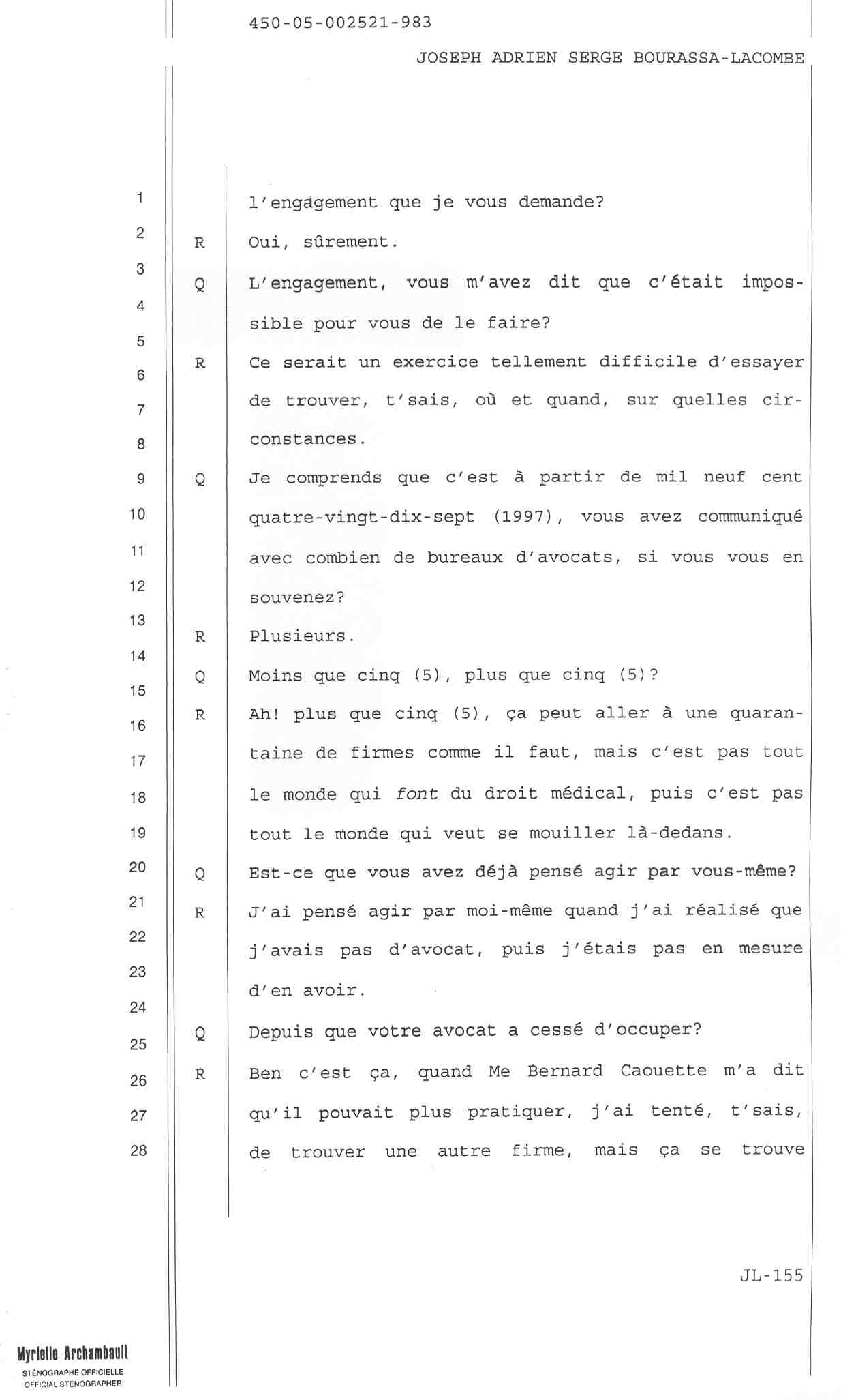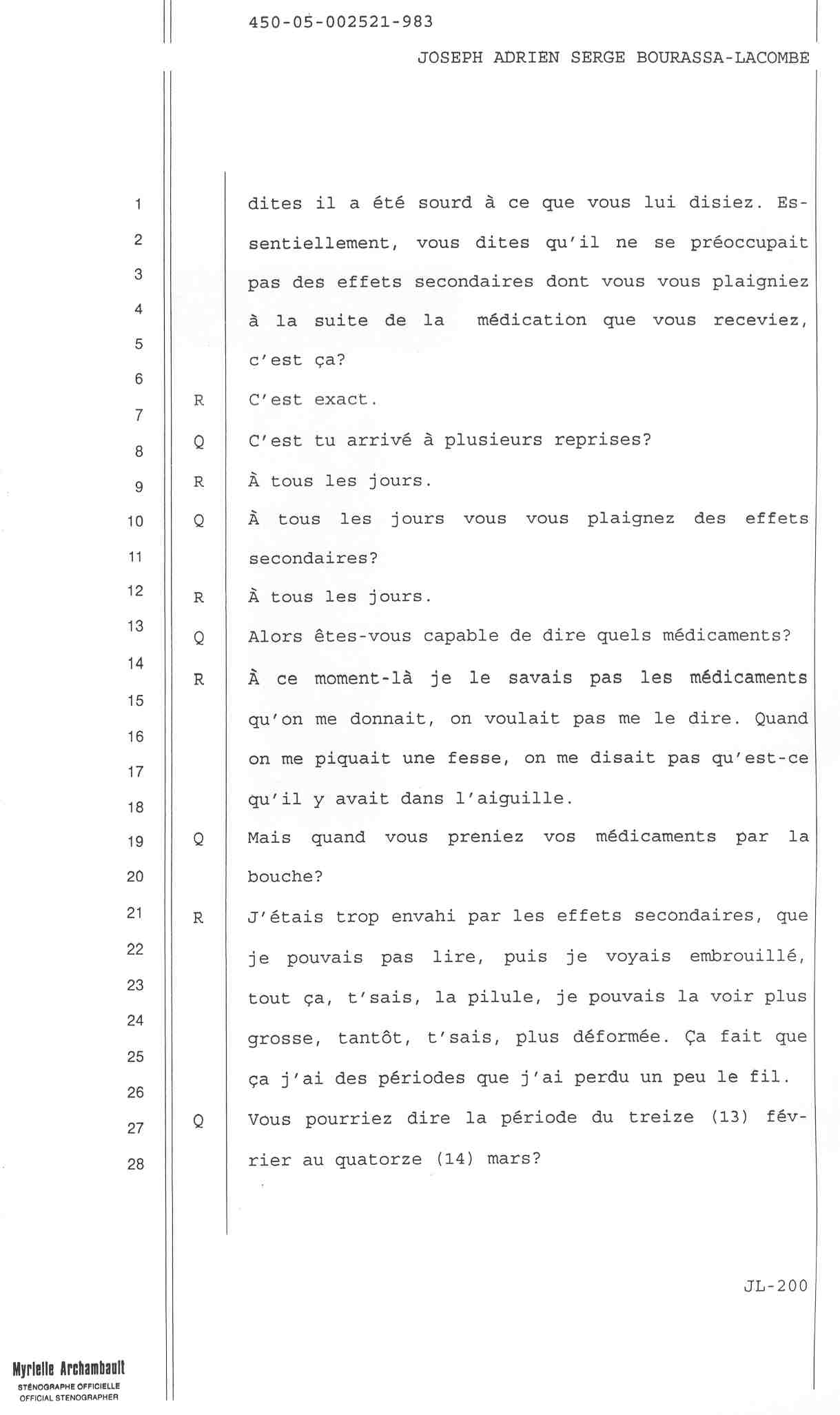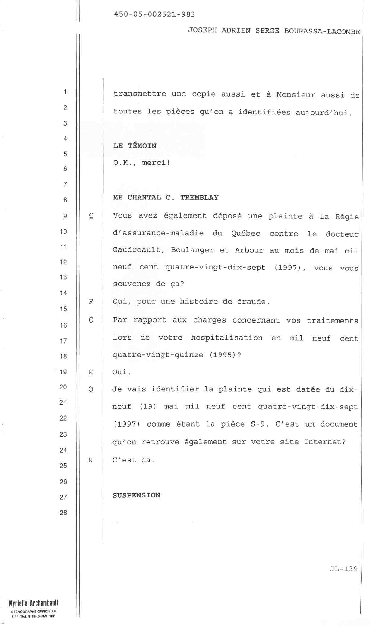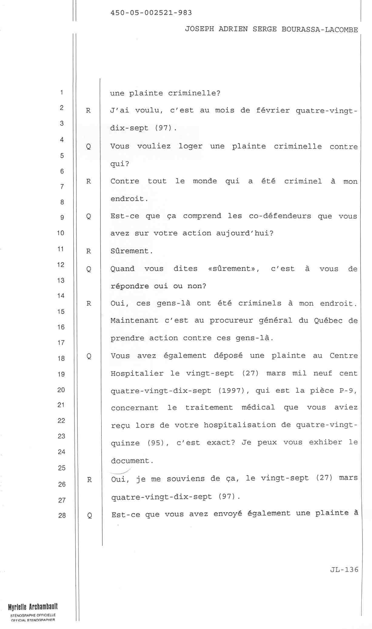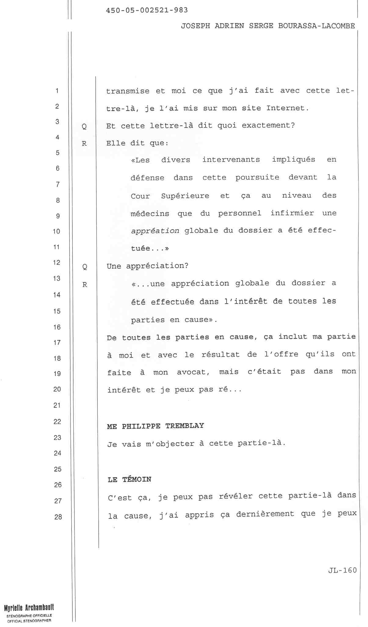EN MEMORIA DEL 04 DE JULIO DE 1996 CUANDO VIVÍA EN E Y A LA BÚSQUEDA DE MI PROPIA COMIDA, EFECTUÉ UNA ENTREGA ESPECIAL AL XXVIE CONGRESO INTERNACIONAL DE DERECHO Y SALUD MENTAL QUE ESTO SE DESENROLLA EN MONTREAL DEL 4 AL 6 DE JULIO DE 2001 A LA ATENCIÓN DEL DR. ANDRÉ LAFLEUR, DG DEL INSTITUTO PHILIPPE PINEL DE MONTREAL. DEPOSITÉ COMO OFRENDA, 800 TARJETAS DE ASUNTOS DE LA FUNDACIÓN SARGA BOURASSA-LACOMBE SEAN UNA TARJETA PARA CADA MIEMBRO DEL CONGRESO ESPERADO A ESTE CONGRESO, 1 KILOGRAMO DE RED DE PLACA DESCOMPUESTA Y 3 PEDAZOS DE TARTA DE LOS ÁNGELES PARA QUE EL DR. LAFLEUR UNO DE LOS ORGANIZADORES DEL ACONTECIMIENTO INCLUYA QUE TENDRÍA MEJOR VALUE EN NOMBRE DE LOS DERECHOS HUMANOS Y DE LA SALUD MENTAL INVITAR LA FUNDACIÓN SARGA BOURASSA-LACOMBE PARA QUE LOS MIEMBROS DEL CONGRESO PUEDAN BENEFICIARSE DEL PERITAJE ESPECIALIZADO EN SALUD MENTAL DE SU PRESIDENTE CON EL FIN DE VER UNA DISMINUCIÓN DE LA CRIMINALIDAD, REPETICIÓN CRIMINAL Y SUICIDIO PARA CONSTRUIR UN MEJOR PAÍS. ES NECESARIO QUE SEPAN QUE ESTA MISIÓN SERÁ IMPOSIBLE, MIENTRAS ÉL UN REPENTANCE NO HUBO A MI LUGAR EN LOS EXPEDIENTES MÉDICOS DE: CENTRO HOSPITALARIO UNIVERSITARIO DE SHERBROOKE, DEL CENTRO HOSPITALARIO DE VERDUN, DEL CENTRO HOSPITALARIO DE ST. MARY Y DEL INSTITUTO PHILIPPE PINEL DE MONTREAL.. POR ESO PARA HABER MULTIPLICADO LAS ACCIONES CRIMINALES DIRIGIDAS CONTRA MI PERSONA ACTUANDO SIN JUICIO DEL TRIBUNAL, DE TENERME DEJAR VIVIR SIN REFUGIO Y SIN COMIDA DURANTE MÁS DE TRES AÑOS.