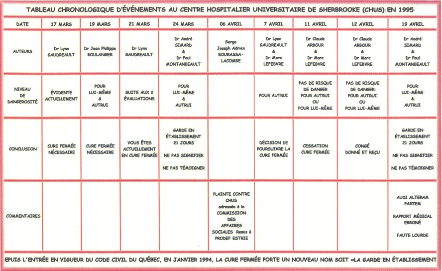 (CE QUE L'ON RETROUVE DANS CE CONTEXTE PROVIENT D'UN RAPPORT MÉDICAL CHUS 398068 DONT DANIEL CORMIER C'EST SERVI. QU'IL A RECUEILLI LORS DE L'AUDITION SUR LE FOND DE MA POURSUITE CIVILE DE 8,888,000 $ CONTRE LE CHUS ET LES MÉDECINS PSYCHIATRES DR LYNN GAUDREAULT, DR MARC LEFEBVRE, DR CLAUDE ARBOUR ET ALL. Les experts-psychiatres, dr Michel Grégoire et dr Lionel Béliveau, ont également été entendus. ILS ONT TOUS DEUX BASÉ LEUR EXPERTISE SUR LE DOSSIER MÉDICAL TEL QUE CONSTITUÉ PAR LE CHUS EN 1995 C’EST-À-DIRE : COMPLOT, FABRICATION DE PREUVE, PARJURE, ETC…