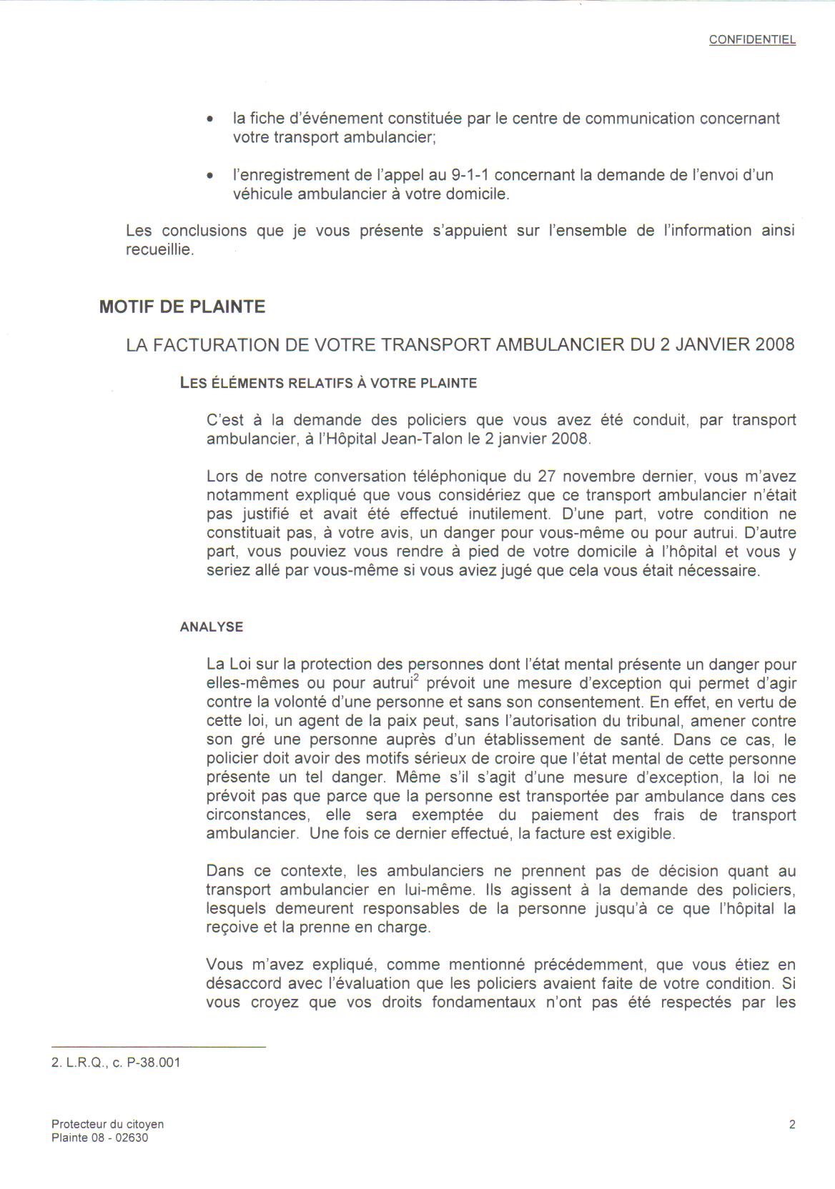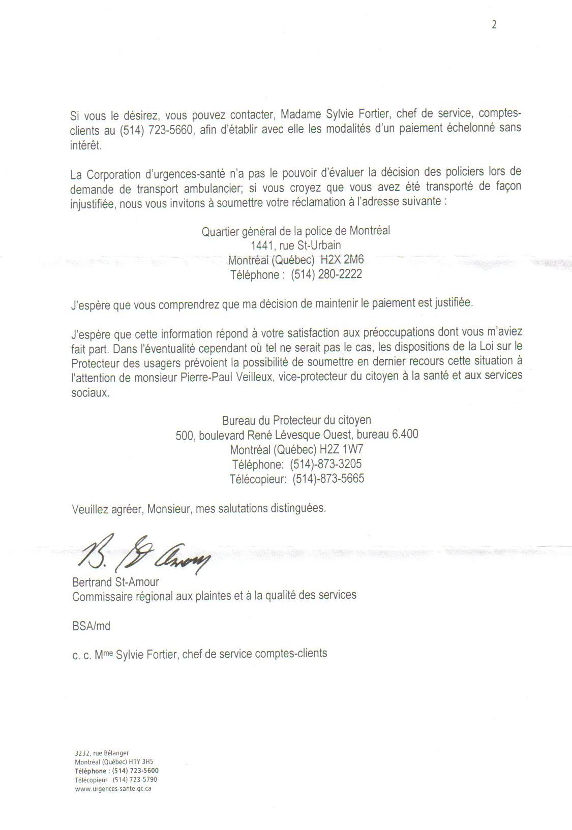 LORSQUE LE POLICIER YANNICK MONTAMBEAULT MAT 2470 ÉCRIT DANS SON RAPPORT QUE J'ACCEPTE VOLONTAIREMENT DE LES SUIVRE APRÈS DE LONGUE DISCUSSION CE N'EST PAS VRAI. PREMIÈREMENT MON TRANSPORT À L'HÔPITAL JEAN-TALON N'ÉTAIT PAS REQUIS. DEUXIÈMENT LORSQUE LE POLICIER YANNICK MONTAMBEAULT MAT 2470 DEVANT SA CONSŒUR DE TRAVAIL CLAUDE JUTRAS MAT 5079 ME DEMANDE DE LUI REMETTRE LES CLÉS DE MON APPARTEMENT JE SUIS EN PRÉSENCE DE DEUX POLICIERS ARMÉS, JE DOIS ME SOUMETTRE À CETTE AUTORITÉ ARMÉE D'AUTANT PLUS QUE :