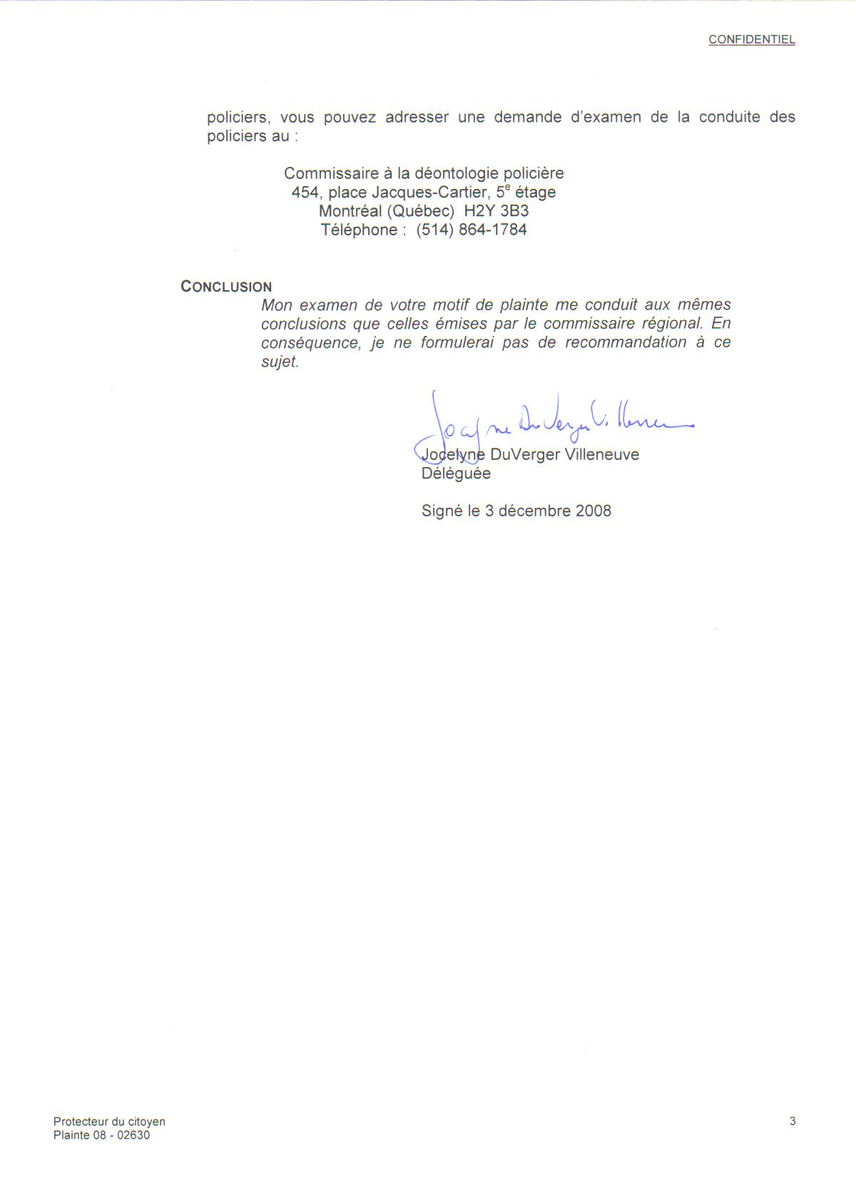 PAR LA DÉCISION DU SERGENT-DÉTECTIVE JUAN VARGAS MATRICULE 1316, J’AI PASSÉ LA NUIT DANS UNE CELLULE DU CENTRE OPÉRATIONNEL SUD OU L’ON M’A SERVI UN SANDWICH DONT LA DATE DE PÉREMPTION ÉTAIT PASSÉE DEPUIS PLUSIEURS JOURS. JE ME SUIS DONC MIS À JEÛNER REFUSANT DE MANGER CE SANDWICH. LE LENDEMAIN MATIN SOIT LE SAMEDI 28 OCTOBRE 2006 J’AI ÉTÉ TRANSFÉRÉ AU CENTRE OPÉRATIONNEL NORD AFIN DE COMPARAÎTRE DEVANT LA COUR SOUS VIDÉOCONFÉRENCE. PAR LA SUITE J’AI ÉTÉ TRANSFÉRÉ AU CENTRE DE DÉTENTION RIVIÈRE DES PRAIRIES OU J’AI VÉCU QUELQUES SEMAINES LE TEMPS DE COMPARAÎTRE DEVANT LA JUGE ISABELLE RHEAULT DE LA COUR DU QUÉBEC.