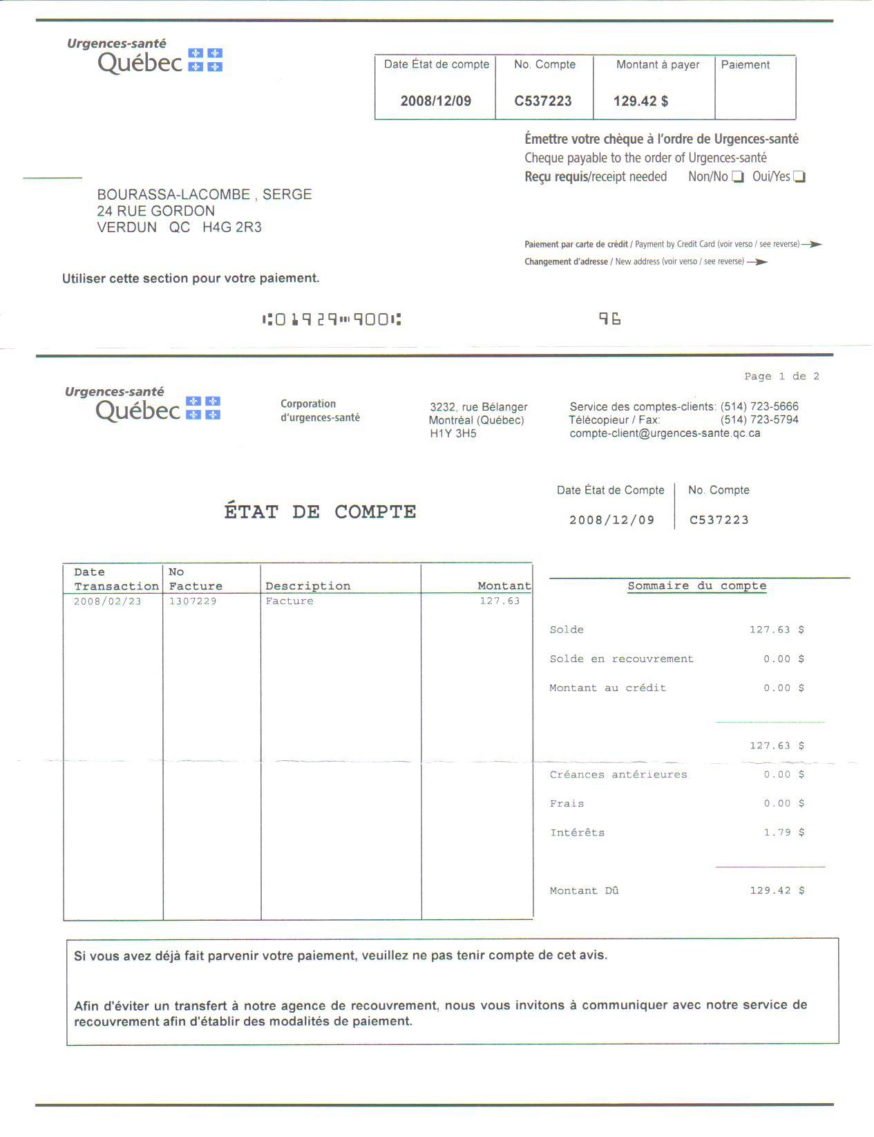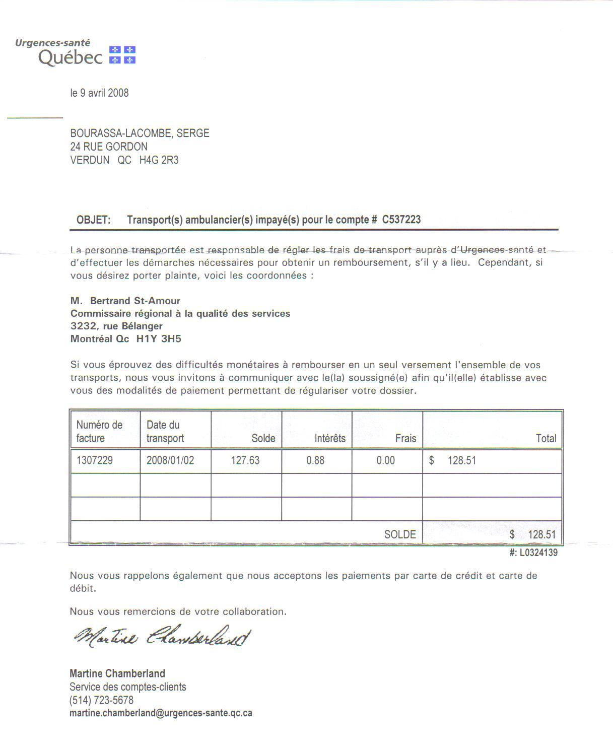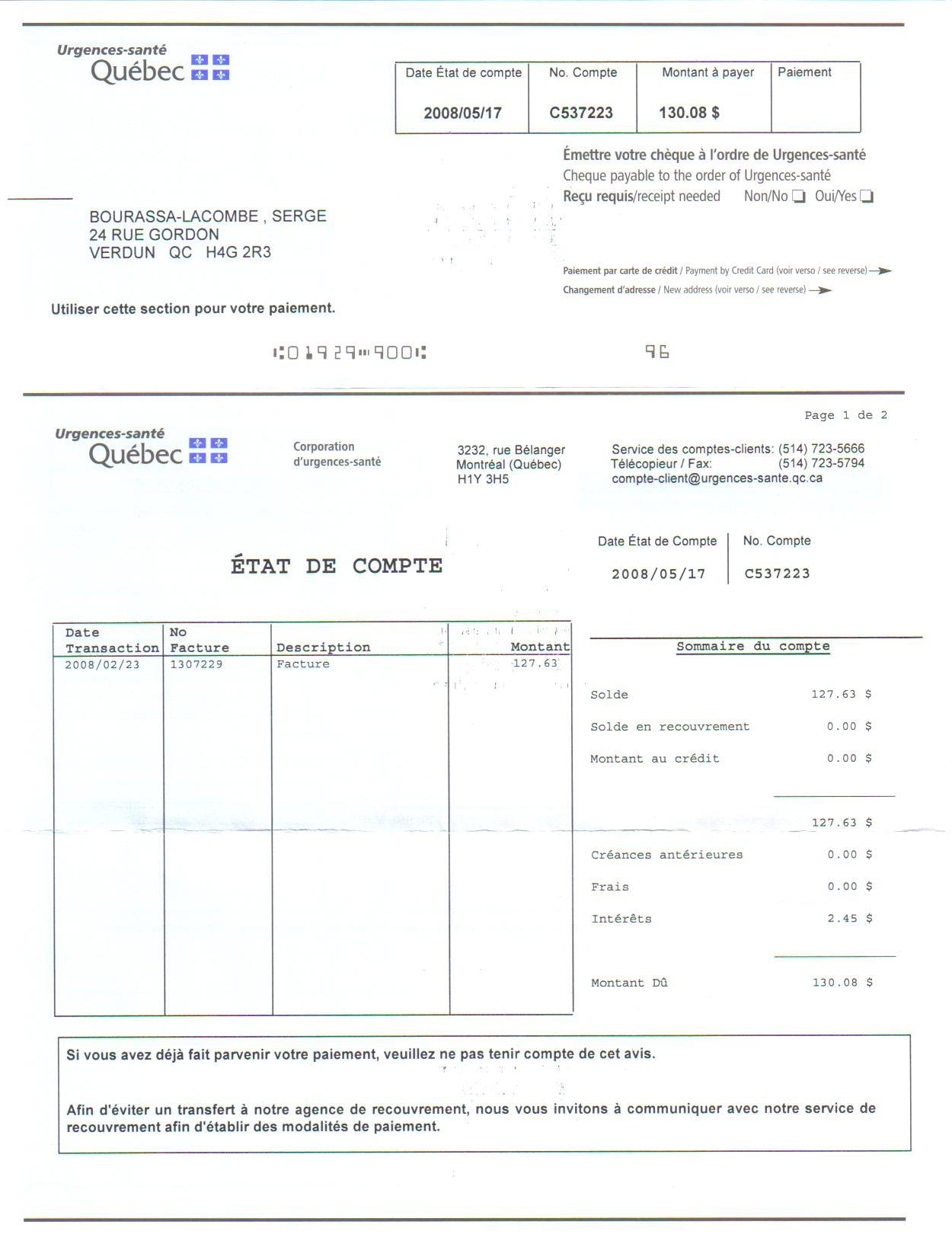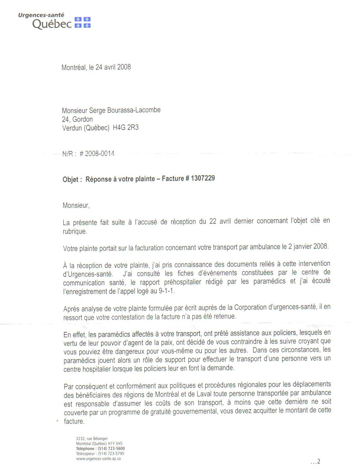 PREMIÈREMENT, LE POLICIER MATRICULE 2520 LORS DE CETTE JOURNÉE DU 23 SEPTEMBRE 2006 ÉCRIT QUE JE SUIS UNE PERSONNE EN CRISE ET D'OCCUPATION INCONNU. IL VA SANS DIRE QUE CE MATIN LÀ J'AI ÉTÉ L'ESPACE D'UN MOMENT VOIRE LE TEMPS DE FRAPPER LE MUR DE CIMENT POUR LE DÉFONCER DE MES DEUX POINGS DANS UN EXCÈS DE COLÈRE. J'ÉTAIS LOIN D'ÊTRE EN CRISE ET MON TRANSPORT À L'URGENCE PSYCHIATRIQUE N'ÉTAIT AUCUNEMENT REQUIS. DE PLUS, MON OCCUPATION N'EST PAS INCONNUE. JE SUIS UN HOMME QUI VIE POUR LE MOMENT AVEC L'AIDE D'UNE RENTE PROVINCIALE D'INVALIDITÉ D'UN MONTANT DE 729.58 $ ACCOMPAGNÉ D'UNE SÉCURITÉ DU REVENU DE 122.92 $ ET JE REÇOIS CES SOMMES À CAUSE D'UNE SÉRIE D'INJUSTICES SOCIALES VOIRE UN CROISEMENT D'IDENTITÉ QUI TRAÎNE DEPUIS 1979 DONT JAMAIS PERSONNE : AUCUN REPRÉSENTANT LA SÉCURITÉ PUBLIQUE, AUCUN REPRÉSENTANT DE LA POLICE DE LA VILLE DE MONTRÉAL, AUCUN RESPONSABLE DU CENTRE DE RENSEIGNEMENT POLICIERS DU QUÉBEC OU ENCORE AUCUN REPRÉSENTANT DU GOUVERNEMENT NE C'EST EXCUSÉ AUPRÈS DE MOI ET/OU AUPRÈS DES MEMBRES DE MA FAMILLE POUR CETTE FAUTE LOURDE. SANS OUBLIÉ CE DRAME VÉCU LE 8 FÉVRIER 1995 AU COLLÈGE DE SHERBROOKE SUIVI DE LA CRÉATION DE CE DOSSIER MÉDICALE CHUS 398068 CONTROUVÉ DE TOUTE PART AFIN DE JUSTIFIER DES MALADIES MENTALES QUE JE N'AI JAMAIS EU. LE CENTRE DE RENSEIGNEMENT POLICIER DU QUÉBEC DEVRAIT CONTENIR LES OCCUPATIONS CONNUS D'UN INDIVIDU, JE SUIS EN PLUS PRÉSIDENT DE LA FONDATION QUI PORTE MON NOM. VOUS N'AVEZ QU'À VISITER MES AMIS GOOGLE AVEC MON NOM DE FAMILLE BOURASSA-LACOMBE POUR DÉCOUVRIR MES OCCUPATIONS.DEUXIÈMENT, LE POLICIER MATRICULE 2520 LORS DE CETTE JOURNÉE DU 23 SEPTEMBRE 2006 ÉCRIT QUE LE CONTEXTE : APPEL POUR UN HOMME TRÈS AGRESSIF QUI DIT VOULOIR TUER TOUT LE MONDE. (L'APPEL A ÉTÉ LOGÉ PAR DANIEL CORMIER)
