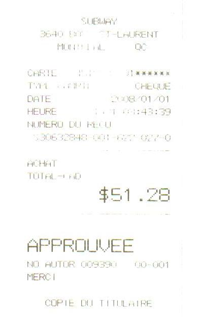 MALGRÉ LE FAIT QUE JE NE DORMAIS PAS DEPUIS LE 27 DÉCEMBRE 2007 (VOIR PLUS BAS DANS LE CONTENU DE CETTE PAGE INTERNET), LE PREMIER JOUR DE L'AN 2008, JE ME SUIS RENDU SUR LA RUE SAINT-LAURENT. JE ME SUIS ARRÊTÉ AU RESTAURANT SUBWAY DU 3460 ET J'AI ACHETÉ À 03:43:39 $51.28 DE SANDWICH SOUS-MARINS QUE J'AI ÉTÉ ENSUITE LIVRÉ AU POSTE DE QUARTIER 21 DU SERVICE DE POLICE DE LA VILLE DE MONTRÉAL AFIN DE ME PERMETTRE DE LEUR SOUHAITER MES MEILLEURS VŒUX POUR L'ANNÉE 2008. PENDANT CE TEMPS DANS MA VILLE, DES FEMMES ET DES HOMMES ÉTAIENT OBLIGÉS D'URINER SUR LE TROTTOIR APRÈS AVOIR FESTOYÉ LA VEILLE DU JOUR DE L'AN AINSI QUE LE DÉBUT DE L'ANNÉE ET CELA À LA CONNAISSANCE ET LA VUE DES POLICIÈRES ET DES POLICIERS QUI PATROUILLAIENT LE SECTEUR DEVANT LES GENS QUI ÉTAIENT LÀ ET DANS LA VILLE LA TEMPÉRATURE ÉTAIT DE - 7 DEGRÉ CELSIUS À CETTE HEURE PRÉCISE.